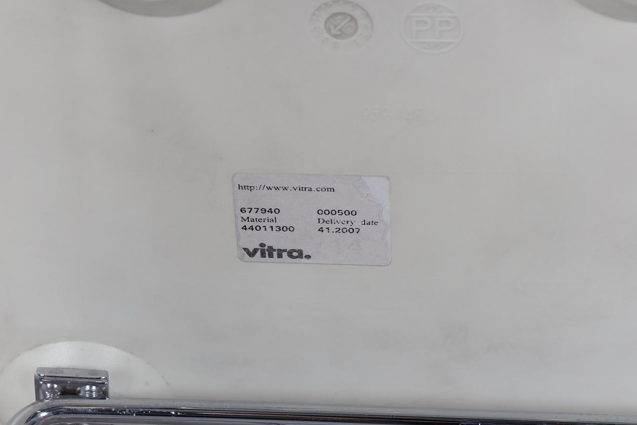 Plástico moldeado blanco sobre patas de metal con patas de madera, marcado debajo, altura del asiento aproximadamente 40 cm.
