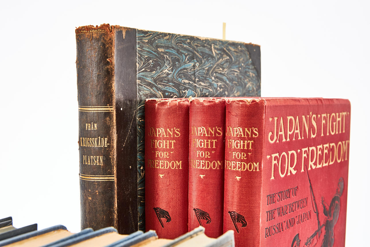 Lote de libros y publicaciones en sueco, inglés y alemán sobre la guerra ruso-japonesa 1904-05. WILSON. La lucha de Japón por la libertad. I-III. Londres, 1904-06 (encuadernación en tela original, 3 volúmenes); HARBOE (ed.). De la Escena de Guerra/Guerra y Paz. Edición extra de Aller Familj-Journal. Nos. 1-43, 1904 y 1-52, 1905. Estocolmo, 1904-1905 (encuadernación medio francesa gastada); Adjunto anterior: Edición Noche. Nº 2 1904. El japones. El único periódico de guerra fiable del mundo. Estocolmo, 1904 (probablemente apéndice del Weckoblad de Grönköping); de MALTZAHN. Der Seekrig zwischen Russland und Japan 1904 bis 1905. I-III. Berlín, 1912 (tela editorial bien conservada, 3 volúmenes); HAMILTON. Libro de recortes de un oficial de estado mayor durante la guerra ruso-japonesa. Londres, 1906 (tela editorial, cuarta impresión); AMINOFF. La Guerra Japón-Rusia. Descripciones ilustradas... I-II. Estocolmo, 1905 (encuadernación original en tela decorada, 2 volúmenes); de SCHELENDORFF. Sechs Monate beim Japanischen Feldheer. Berlín, 1906 (encuadernación original en tela decorada bien conservada); CONNAUGHTON. Sol naciente y oso que cae. Guerra de Rusia con Japón. Londres, 2003 (encuadernación original en cartón con envoltorios cosidos); BURGMAN. Opinión pública sueca y diplomacia durante la Guerra Ruso-Japonesa 1904-1905. Ay. apagado Uppsala, 1965 (grapado, sin cortar y sin cortar).