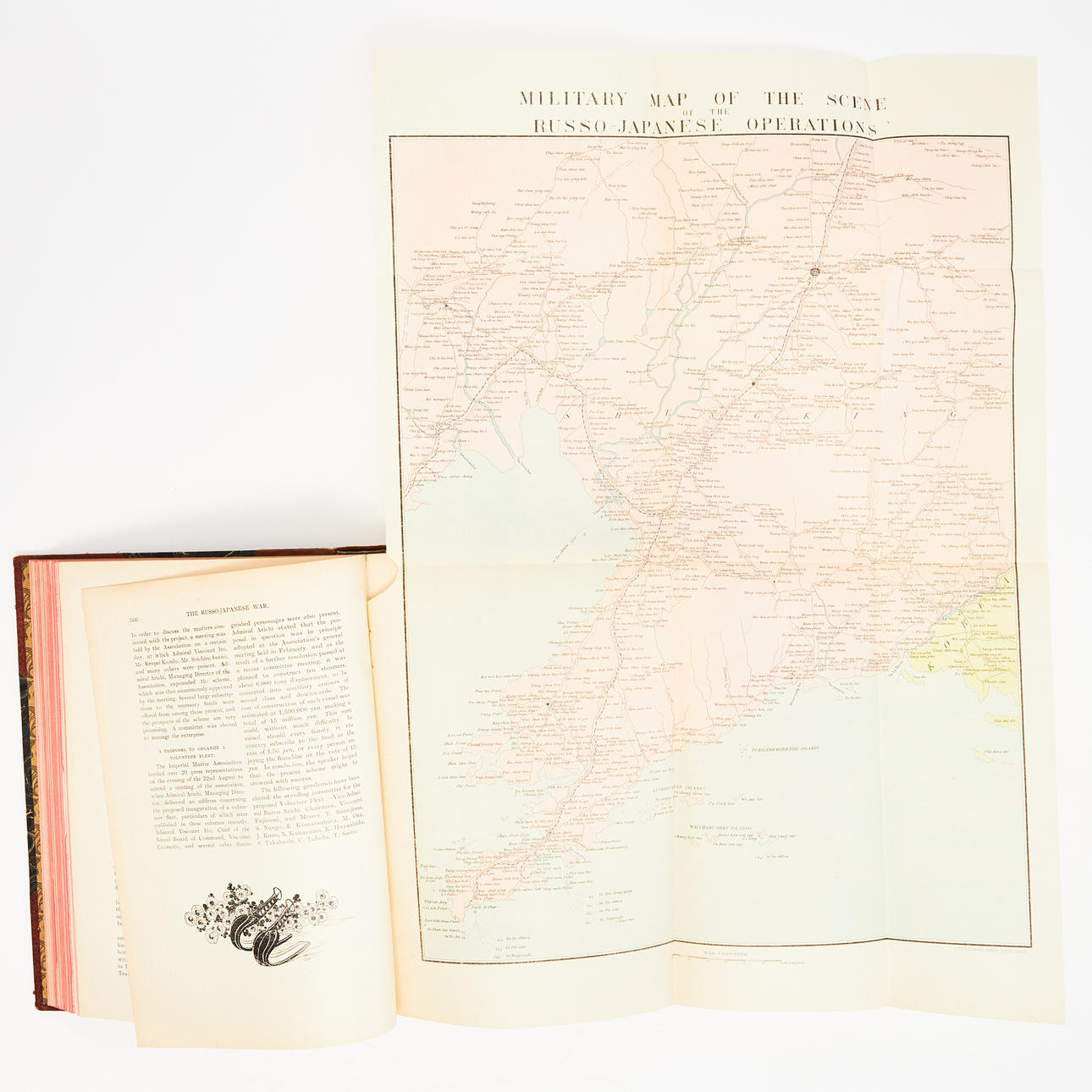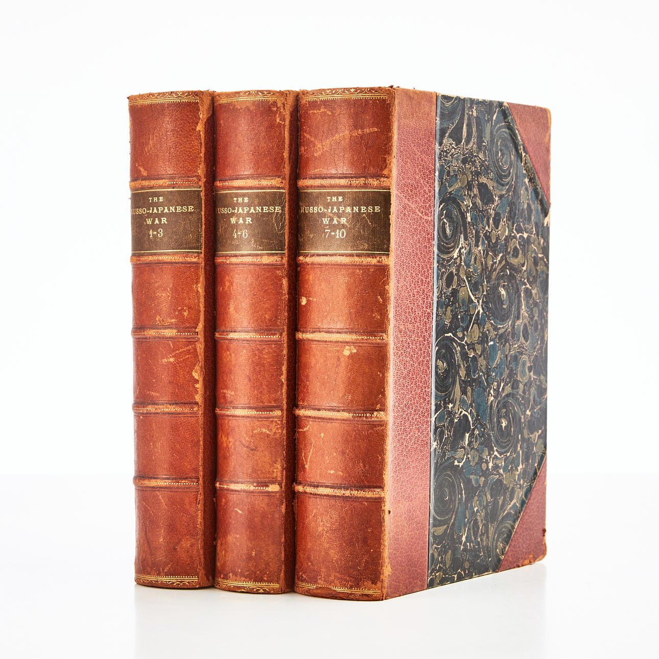 La Guerra Ruso-Japonesa. Totalmente ilustrado. vol. I-III (No. 1-10). Tokio, Kinkodo-Shoseki-Kabushiki-Kaisha y Maruzen-Kabushiki-Kaisha, 1904-05 Large8vo/small 4to. 253 x 178 mm. 1418 págs. Profusamente ilustrado en el texto. Con numerosas láminas, muchas de ellas a color, mapas y planos plegables. Media ternera contemporánea algo desgastada con lomos dorados, bandas en relieve, etiquetas de cuero verde, tableros jaspeados y bordes rojos. 3 volúmenes.