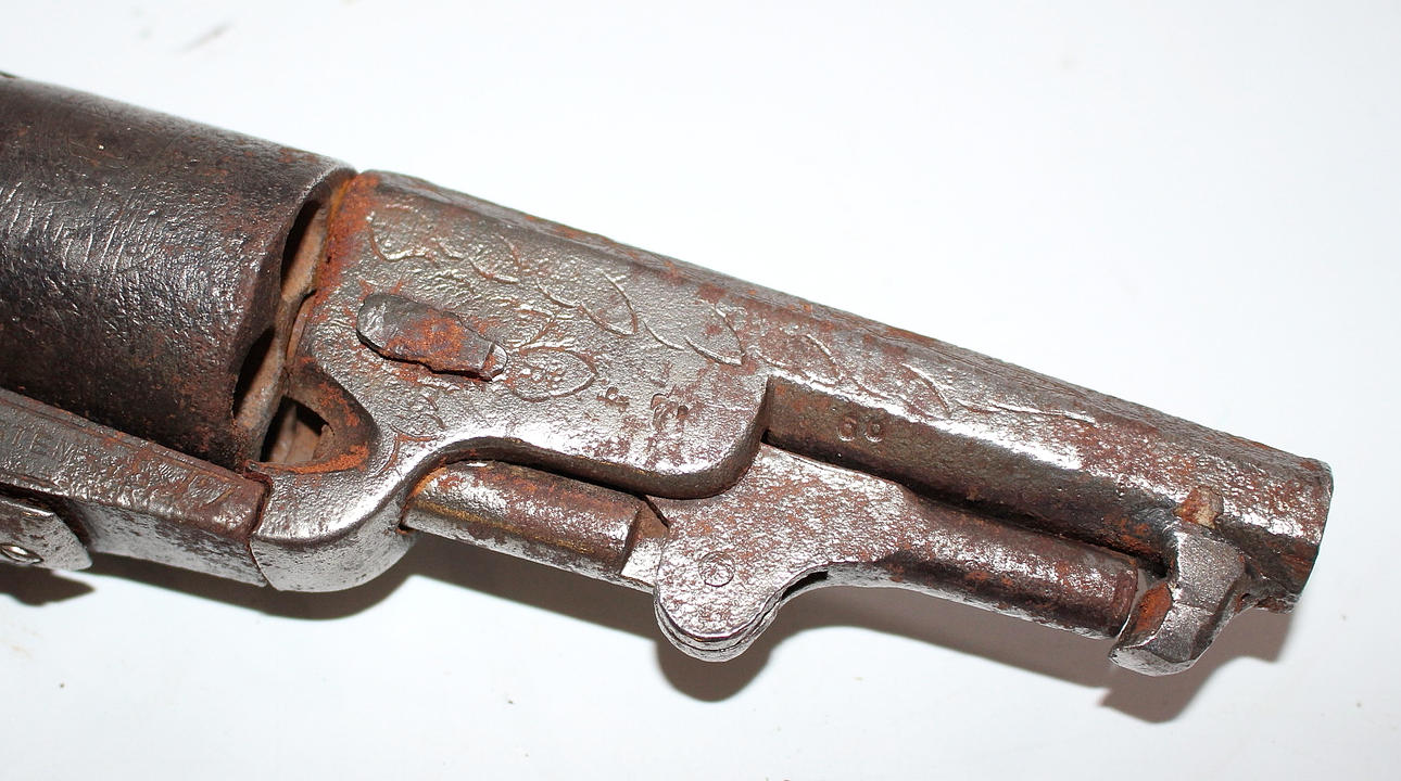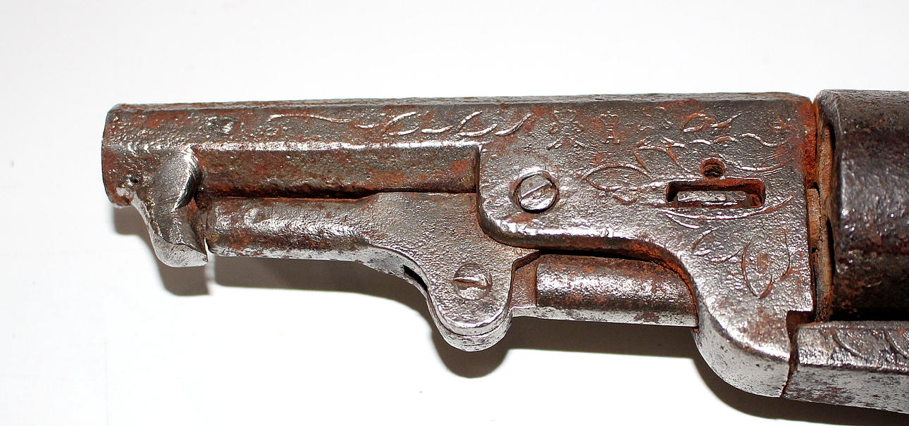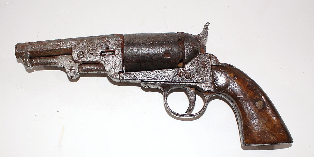 Cañón de 3 3/4" con empuñaduras de nogal, grabado ornamental.