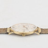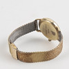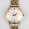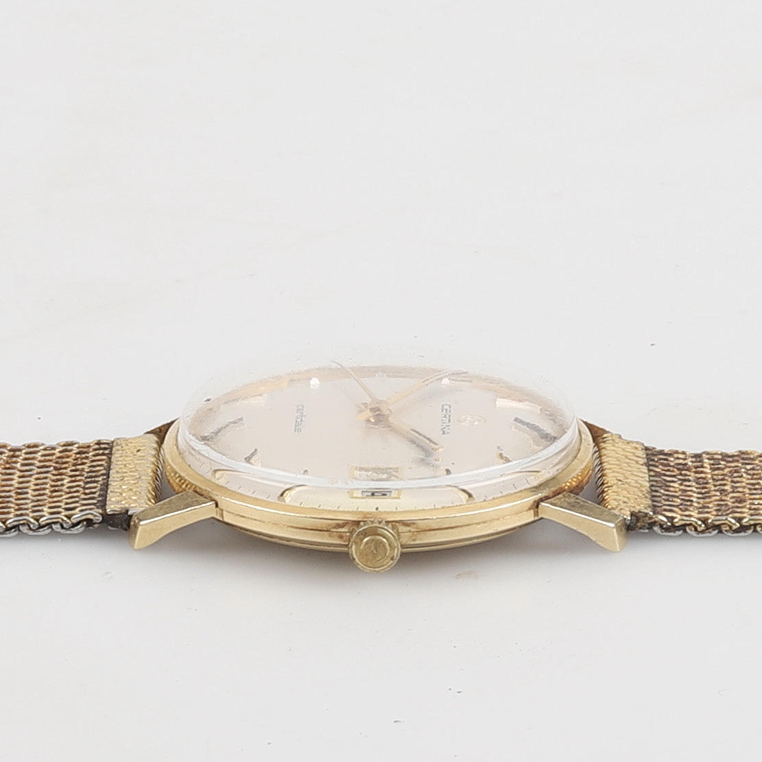 Certina Certidate con caja en oro de 14K, esfera plateada con manecillas e índices de barra enchapados en oro y visualización de fecha. Movimiento manual, Ø 34 mm. Eslabón milanés en oro sobre acero no original.