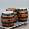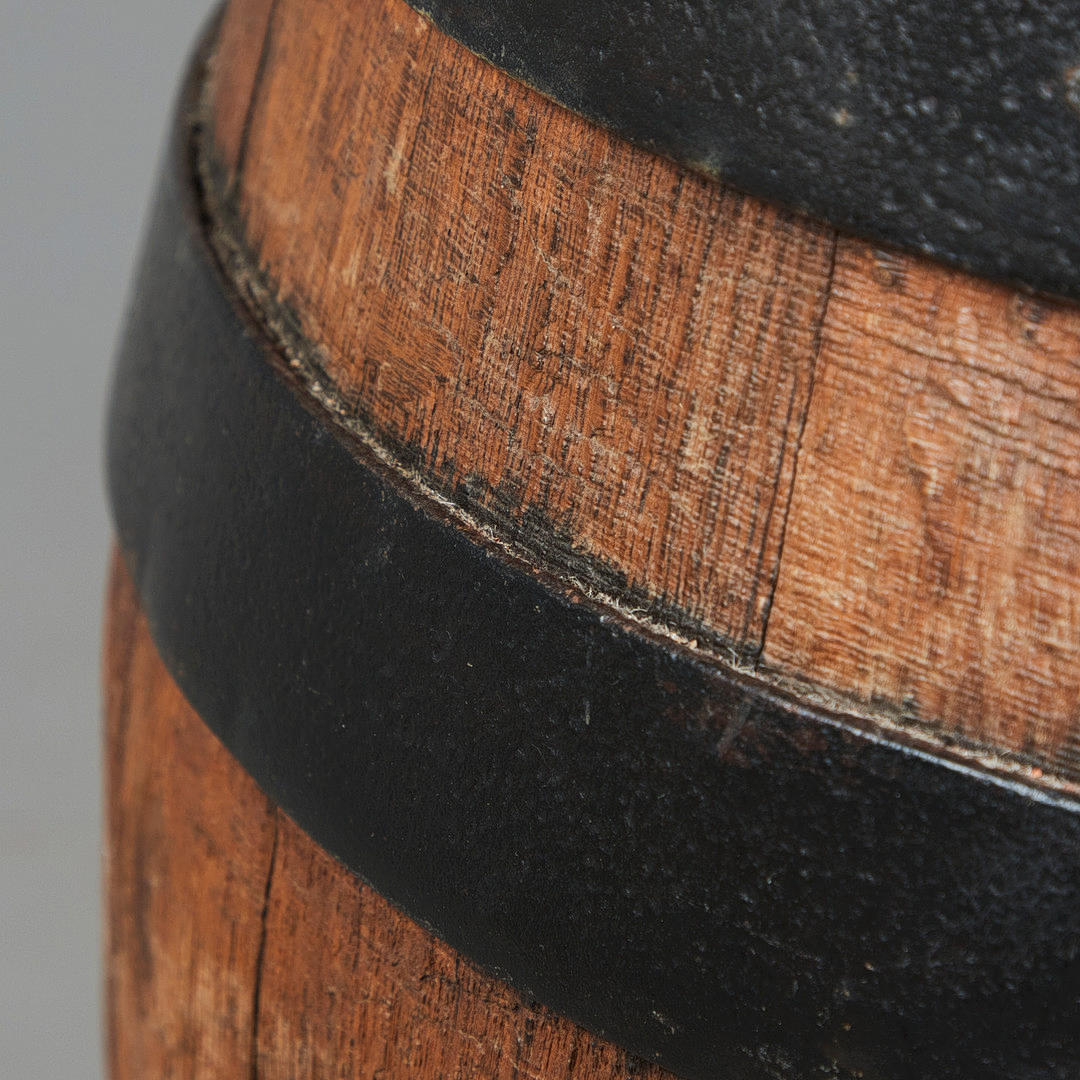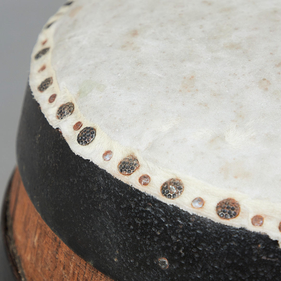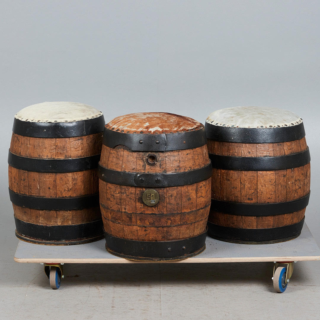 Tres taburetes/taburetes de bar, madera, piel de vacuno. Conjunto con tres taburetes de bar que consisten en barriles tapizados cubiertos con cuero de vaca gris claro y marrón, asiento con remaches alrededor, H.50cm, D.40cm. (3).