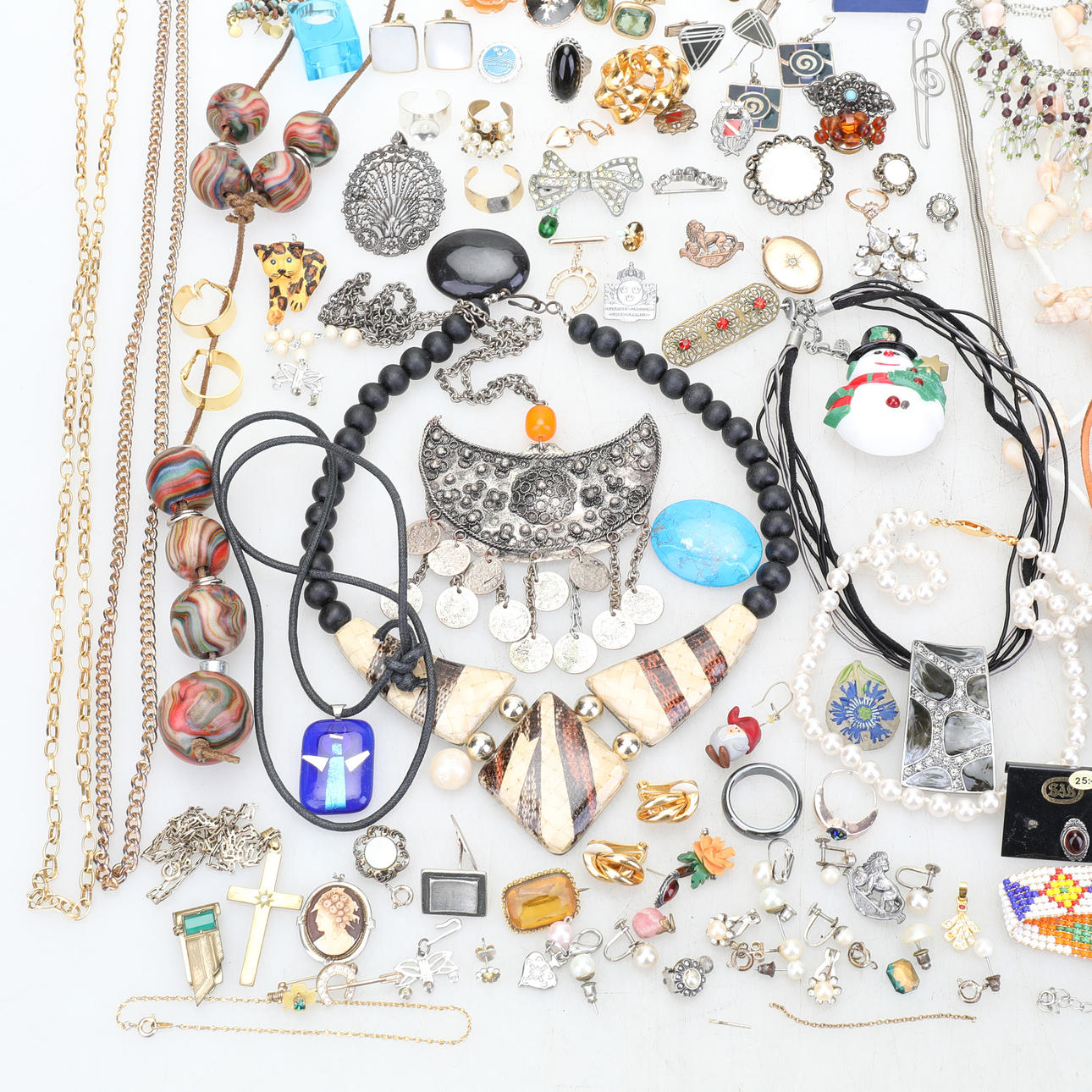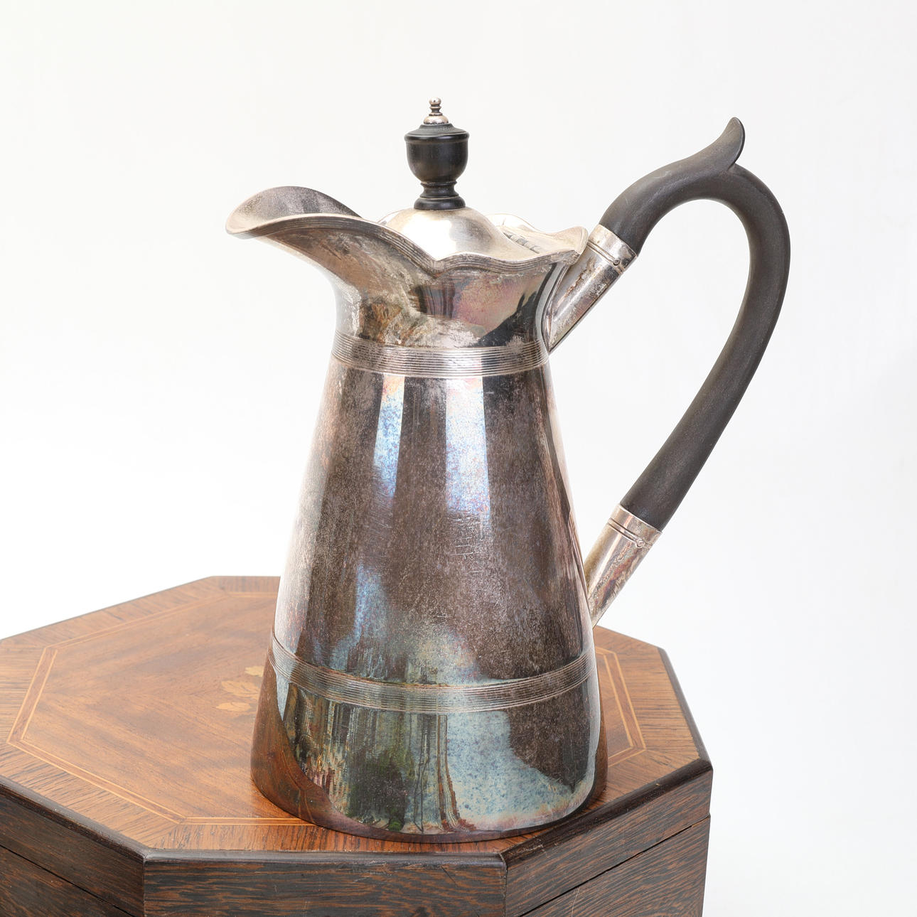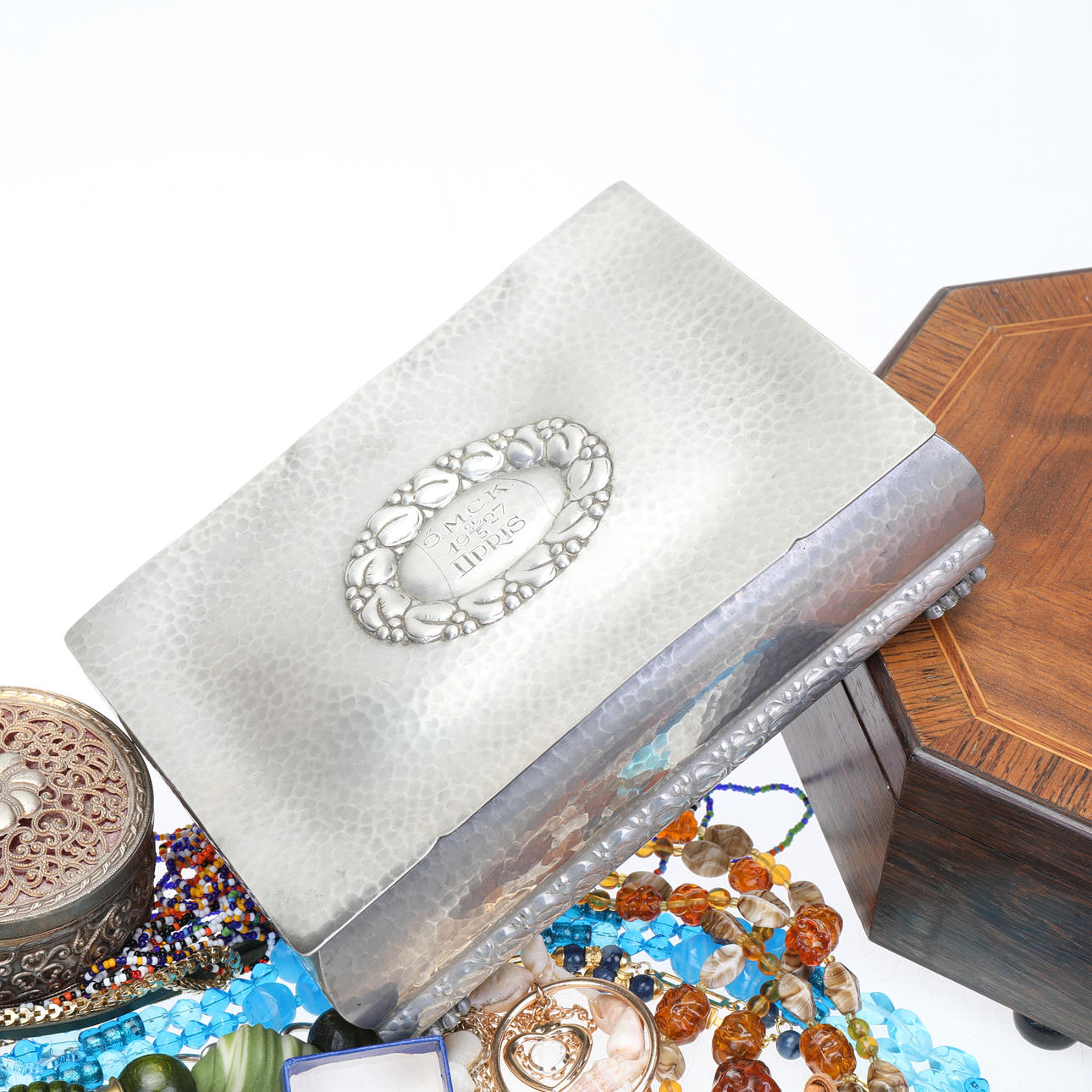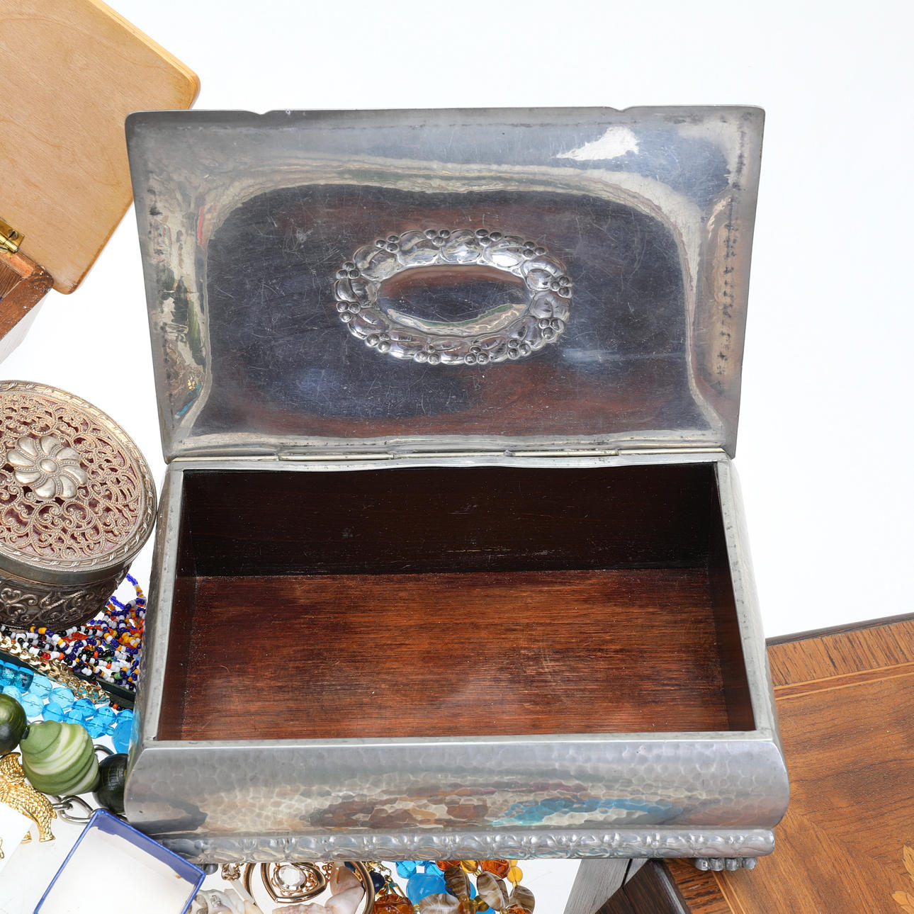 Un Lote mixto con bisutería, joyero, jarra de alpaca , etc.