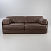 Módulo sofá 'DS76' de De Sede. 2 elementos, estructura de madera con acolchado y tapizado en piel marrón oscuro. Los elementos pueden mostrarse individualmente o unirse para formar un sofá mediante soportes. Se pliega en sofá cama.