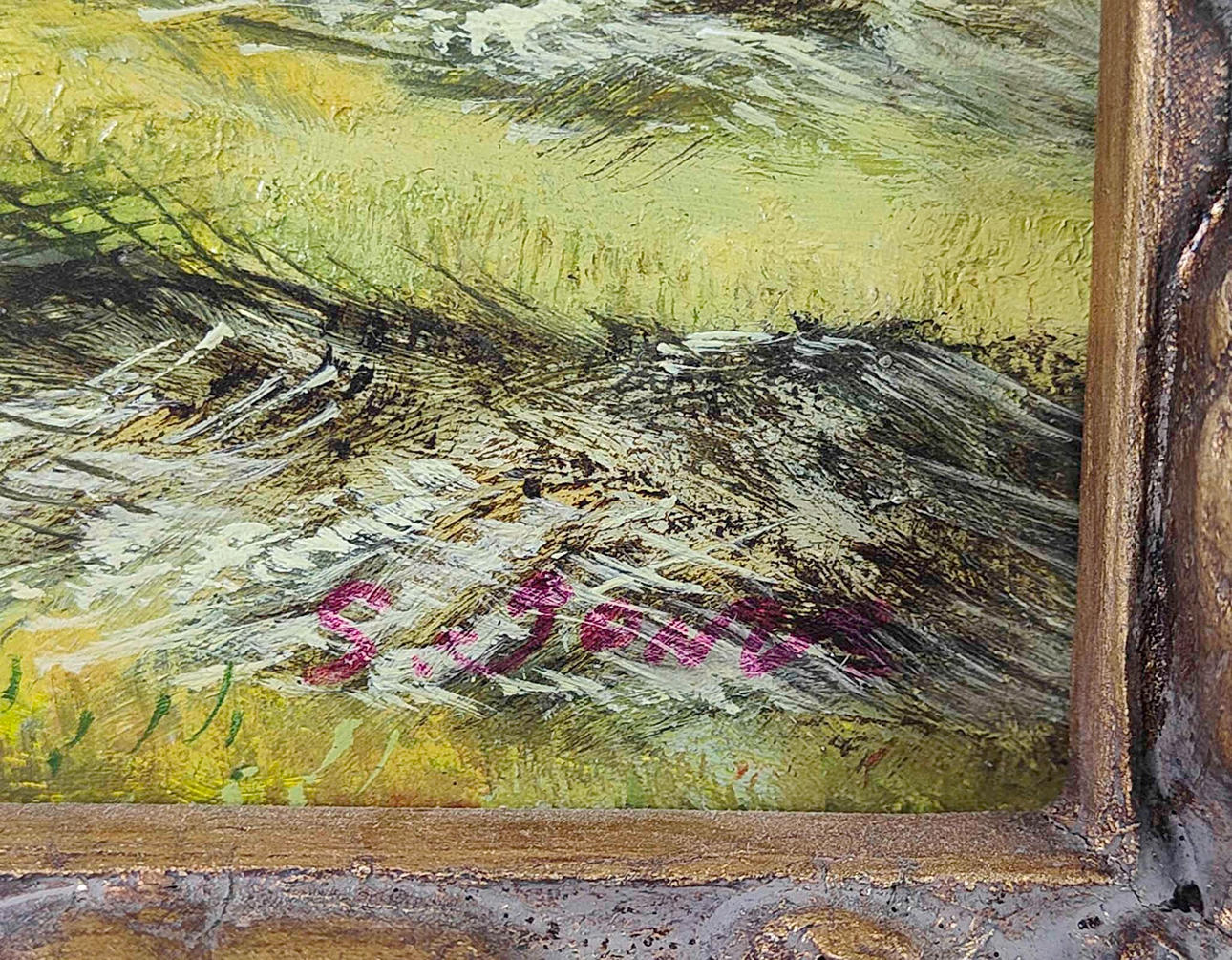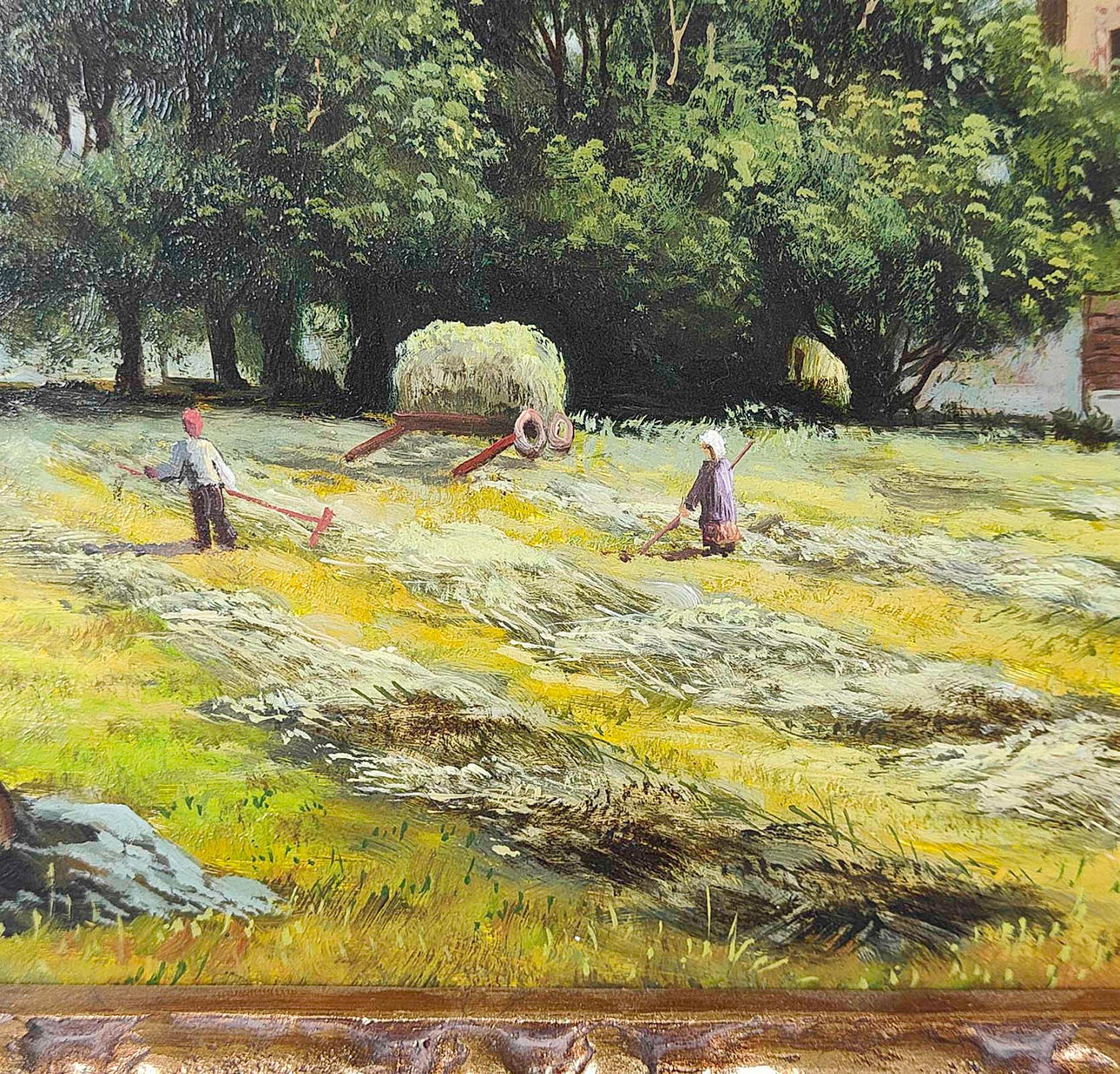 Óleo/tablero duro indistinto abajo a la derecha Escena rural firmada en formato apaisado con granjeros cosechando heno, al fondo una iglesia enmarcada por árboles, aprox. 25,5 x 20,5 cm, en marco dorado en relieve, aprox. 37,5x33cm.