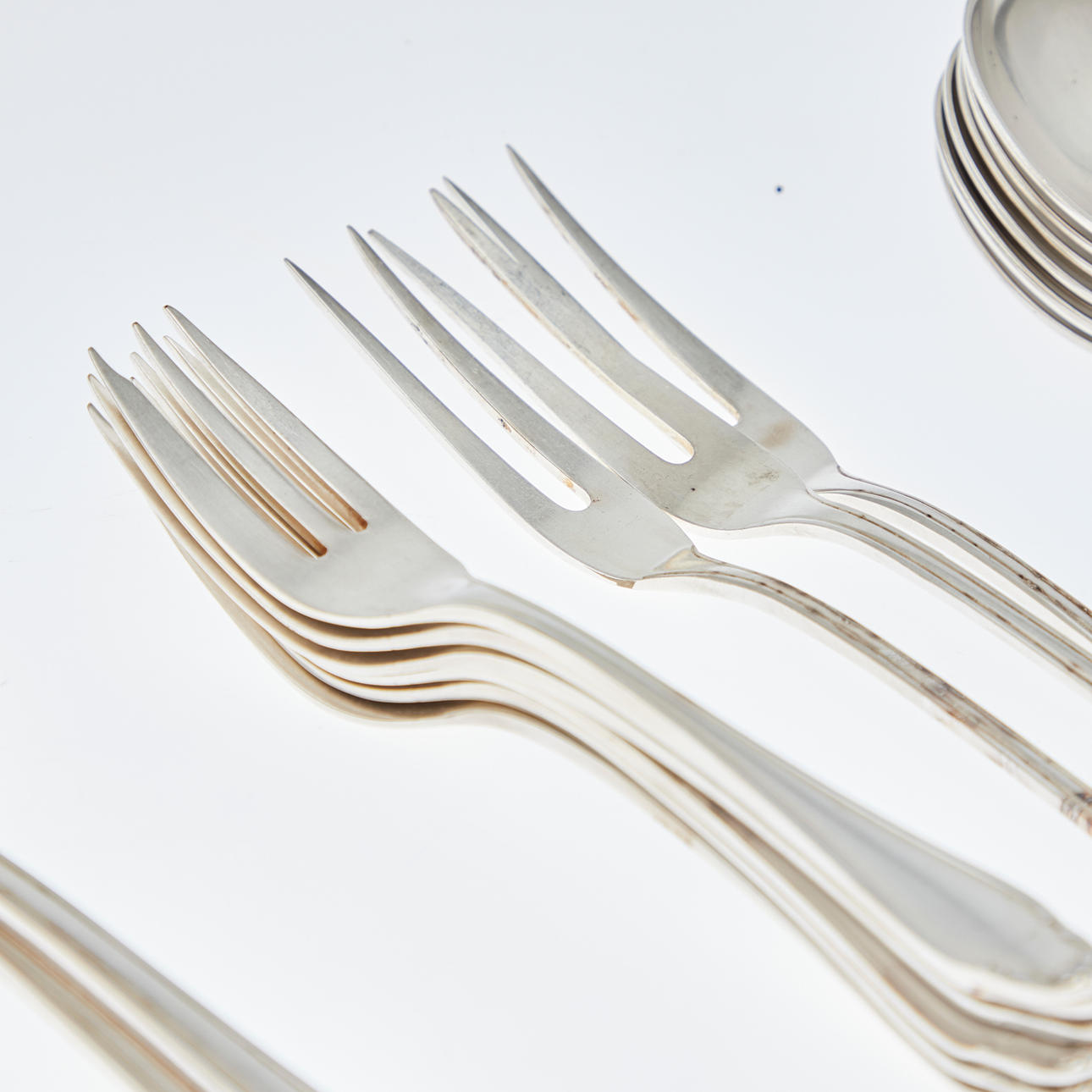 Martín, cubertería/servicio, baño de plata de los años 90. Lote mixto compuesto por: 6 cuchillos de pescado, L.20,5 cm 6 tenedores de pescado, L.18 cm 6 tenedores de pastel, L.15 cm 6 cucharaditas, L.13 cm 6 cucharas soperas, L.15,5 cm 12 tenedores de mesa, L. 21 cm 12 cuchillos de mesa, L.24 5cm 12 cucharas de mesa, L.21cm 2 cuchillos para mantequilla, L.16,5cm 3 tenedores para carne, L.20,5cm 2 cucharas laterales, L.23,5cm 2 juegos de cubiertos para ensalada, L.19cm , dos de los cuales son de WMF 6 servilleteros, con monograma, 6x3,5cm y un cucharón de plata 800, Alemania, L.19cm, peso: 69,9g.