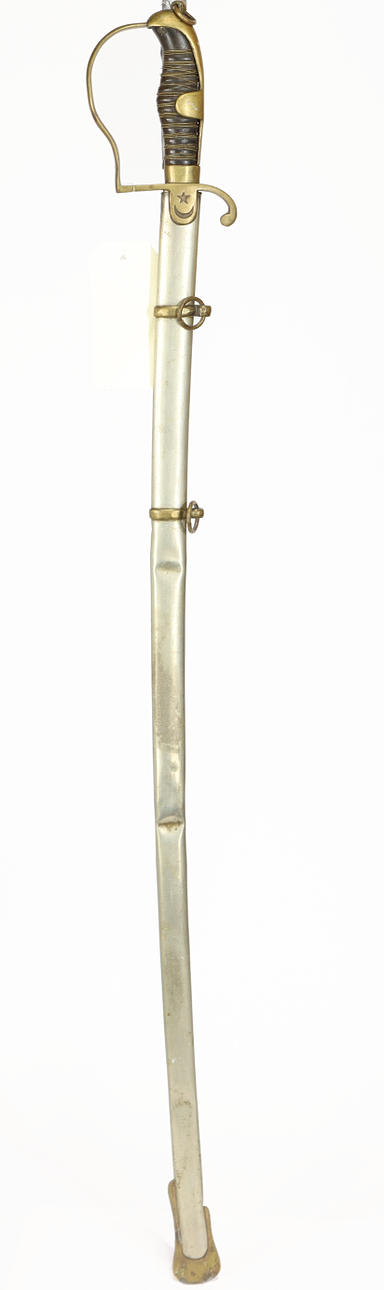 La longitud de las hojas aproximadamente 75,5 cm, protector de latón, rodillo de cuero con hilo de latón, una hoja con grabado grabado. Tinas de estaño con anillos de correa de latón doble.