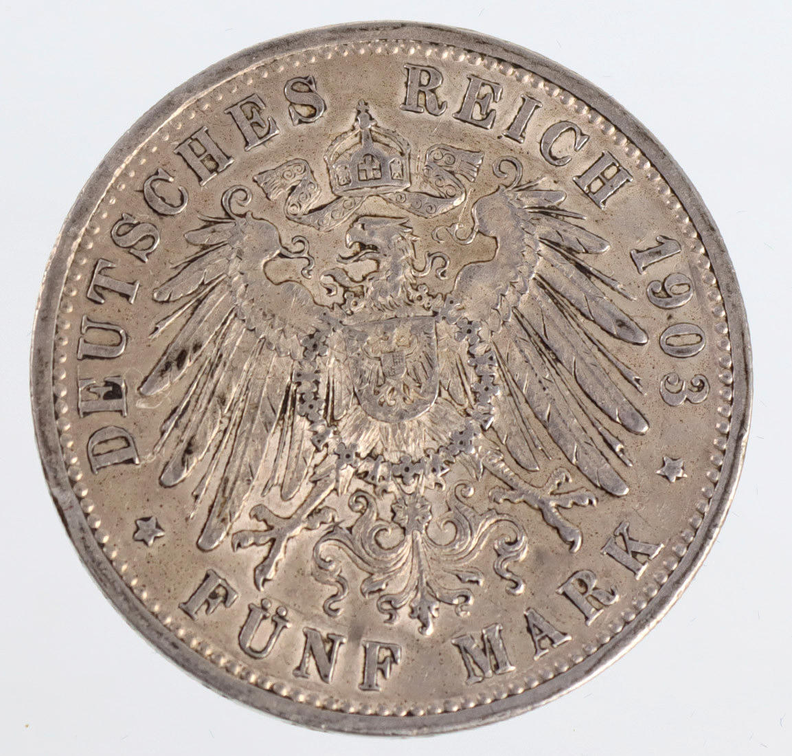 Moneda de plata Cinco Marcos Reich Alemán 1903, también inscrita alrededor del águila coronada con coraza, retrato de busto de Federico Gran Duque de Baden en el reverso, también inscrita con la G de ceca alrededor, Ø aprox. 38 mm, peso aprox. 28 gramos.