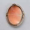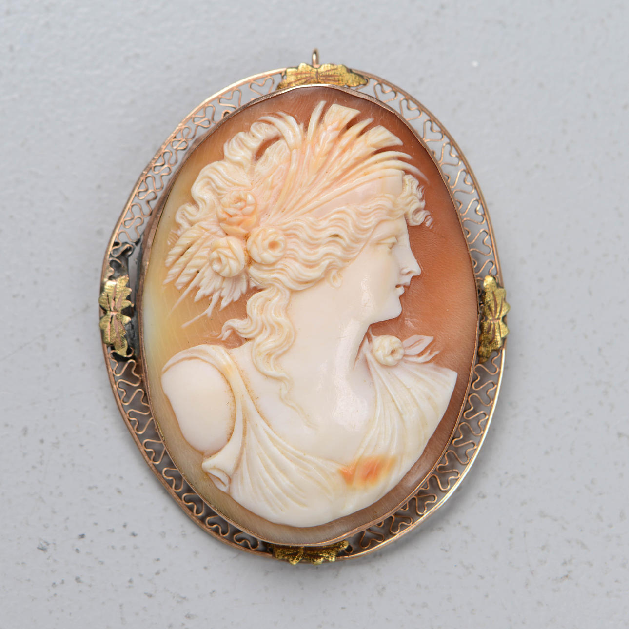 Zócalo de oro de 14K, con decoración calada. Camafeo de conchas marinas. Unos 6 x 4,5 cm. Peso total 17 gramos.