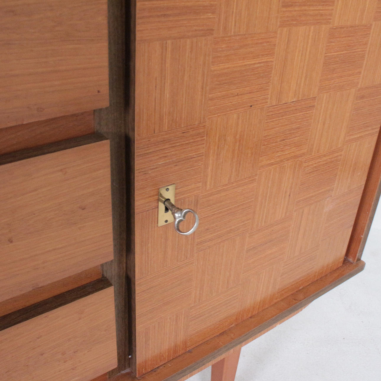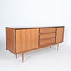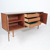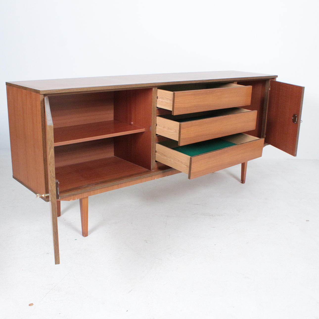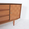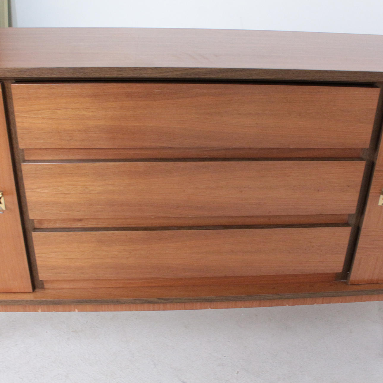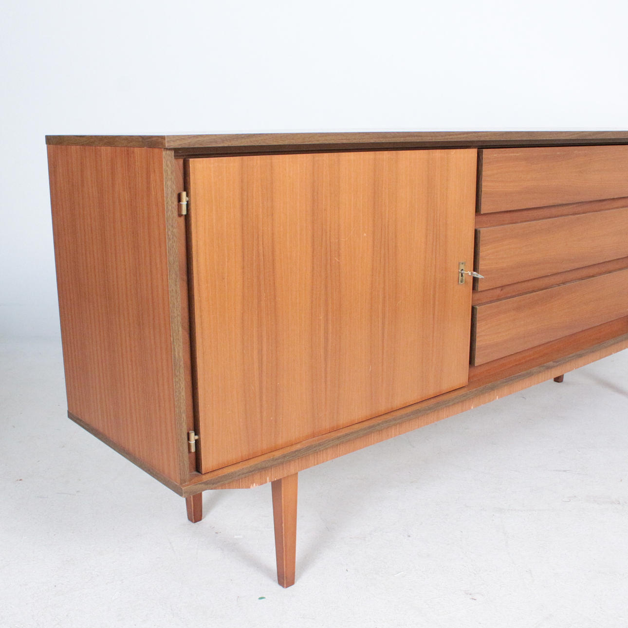 Aparador mid-century, años 70, fabricado en nogal. 2 llaves disponibles, dos puertas y tres cajones. Medidas: Alt. 78 cm. B. 178cm. D 41 cm.