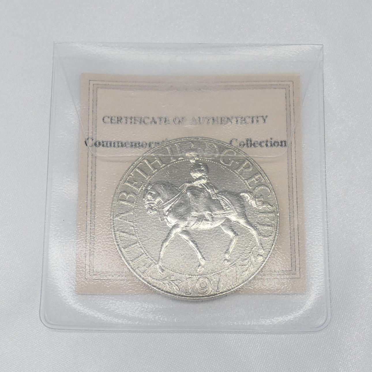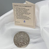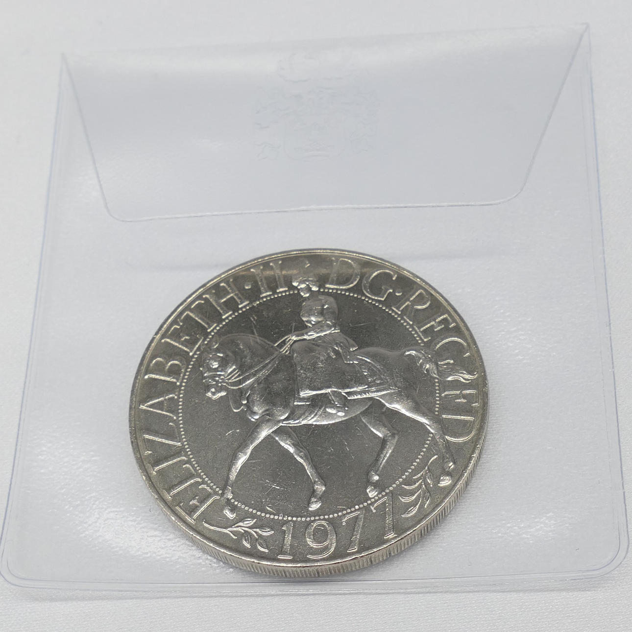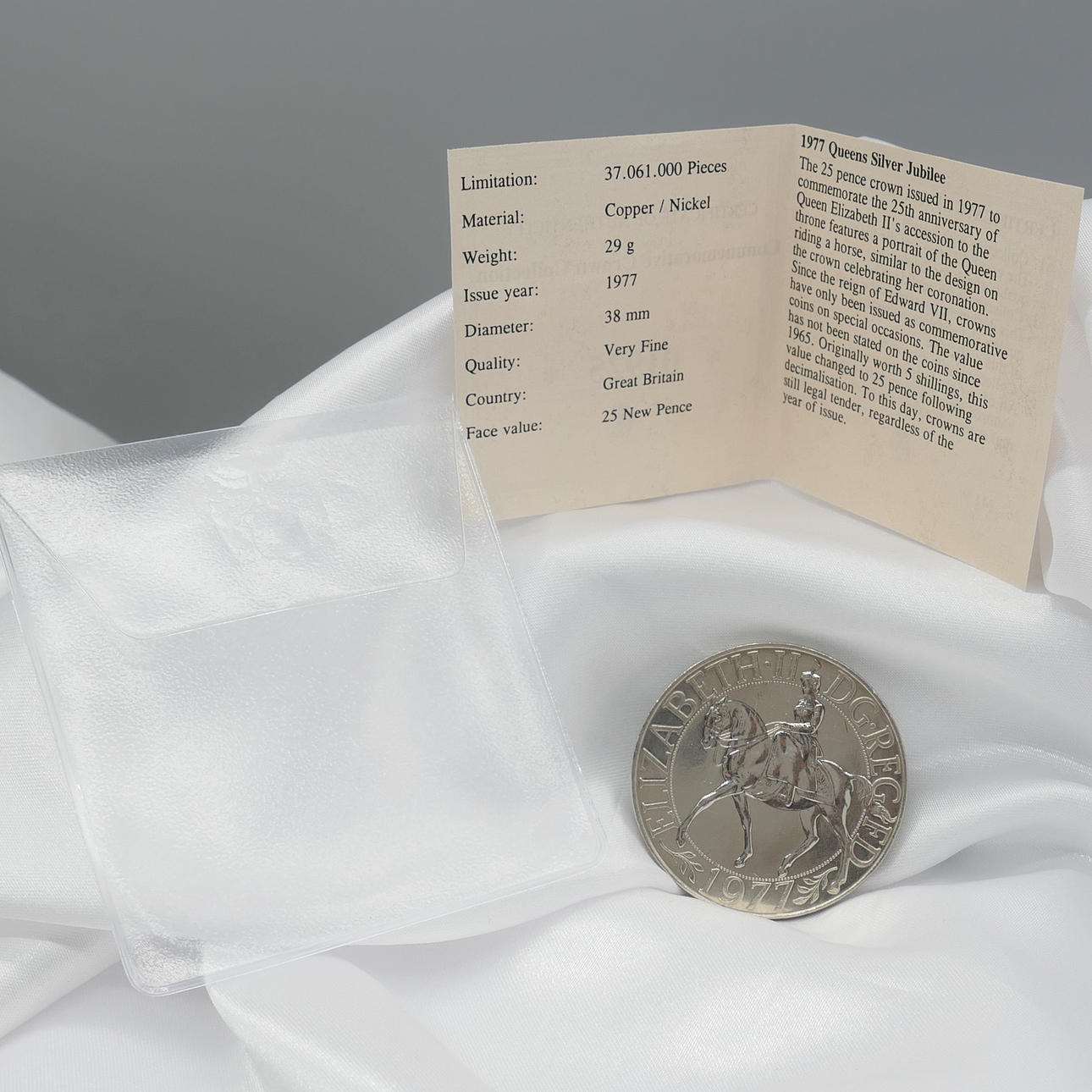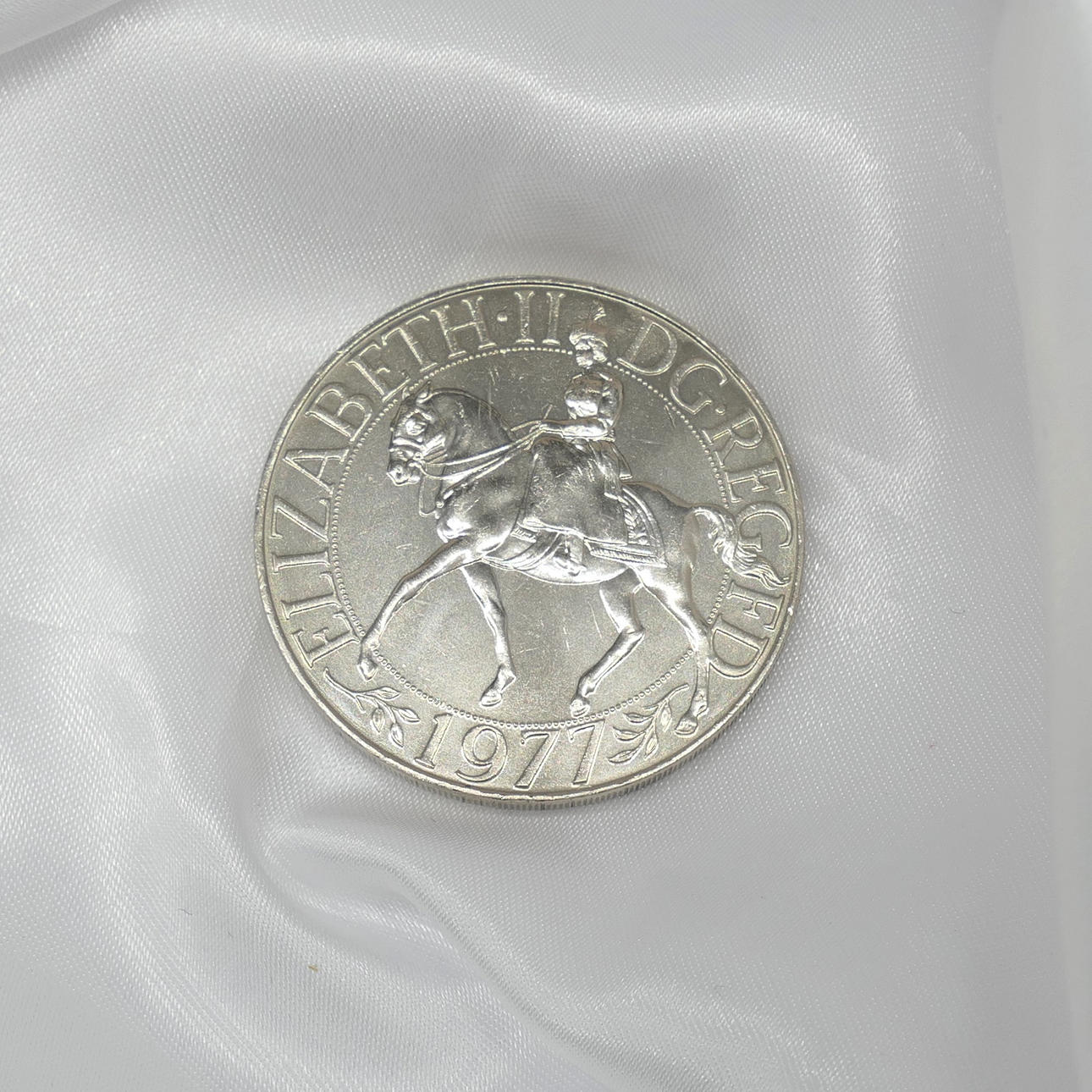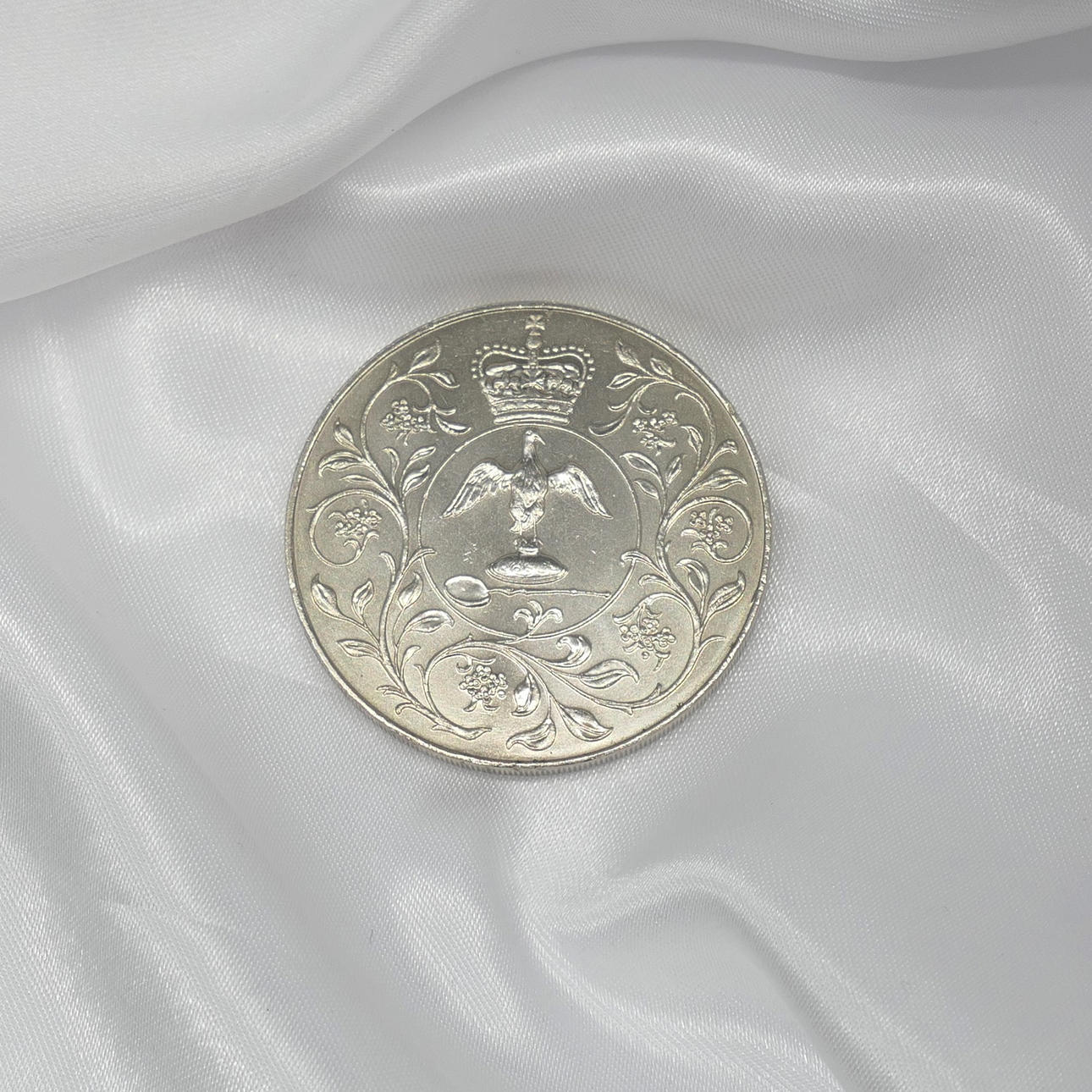 Una moneda del jubileo de plata de la reina Isabel II de la colección de la corona conmemorativa. Fecha de emisión: 1977. Diámetro de la moneda: 38 mm.