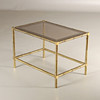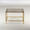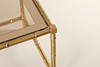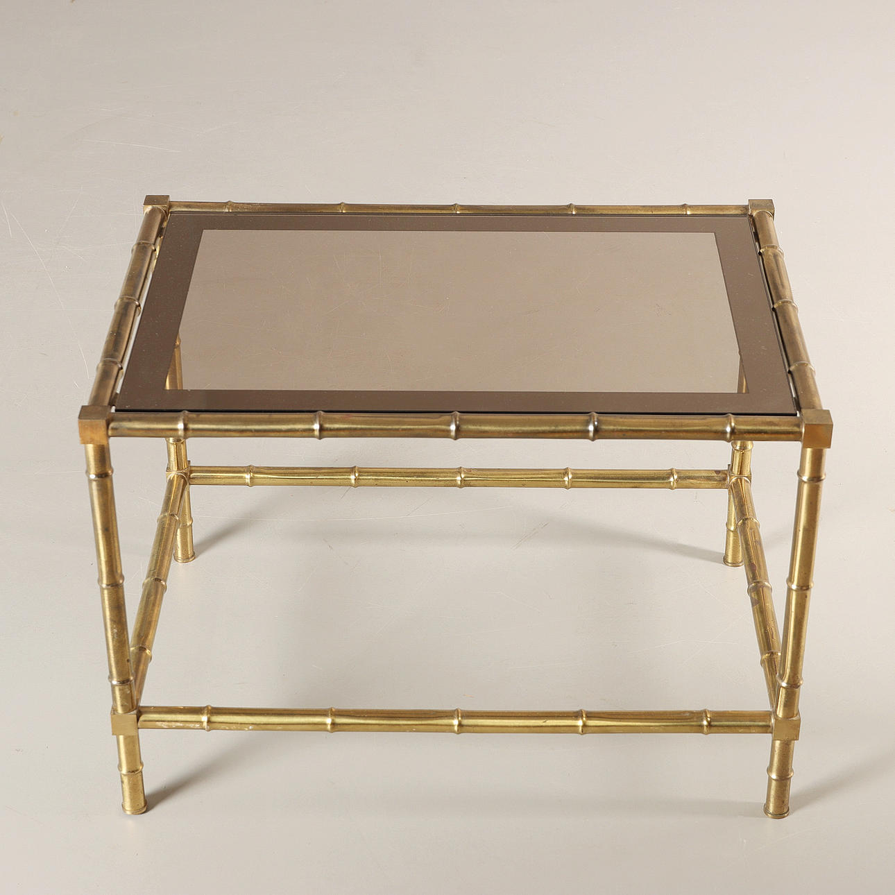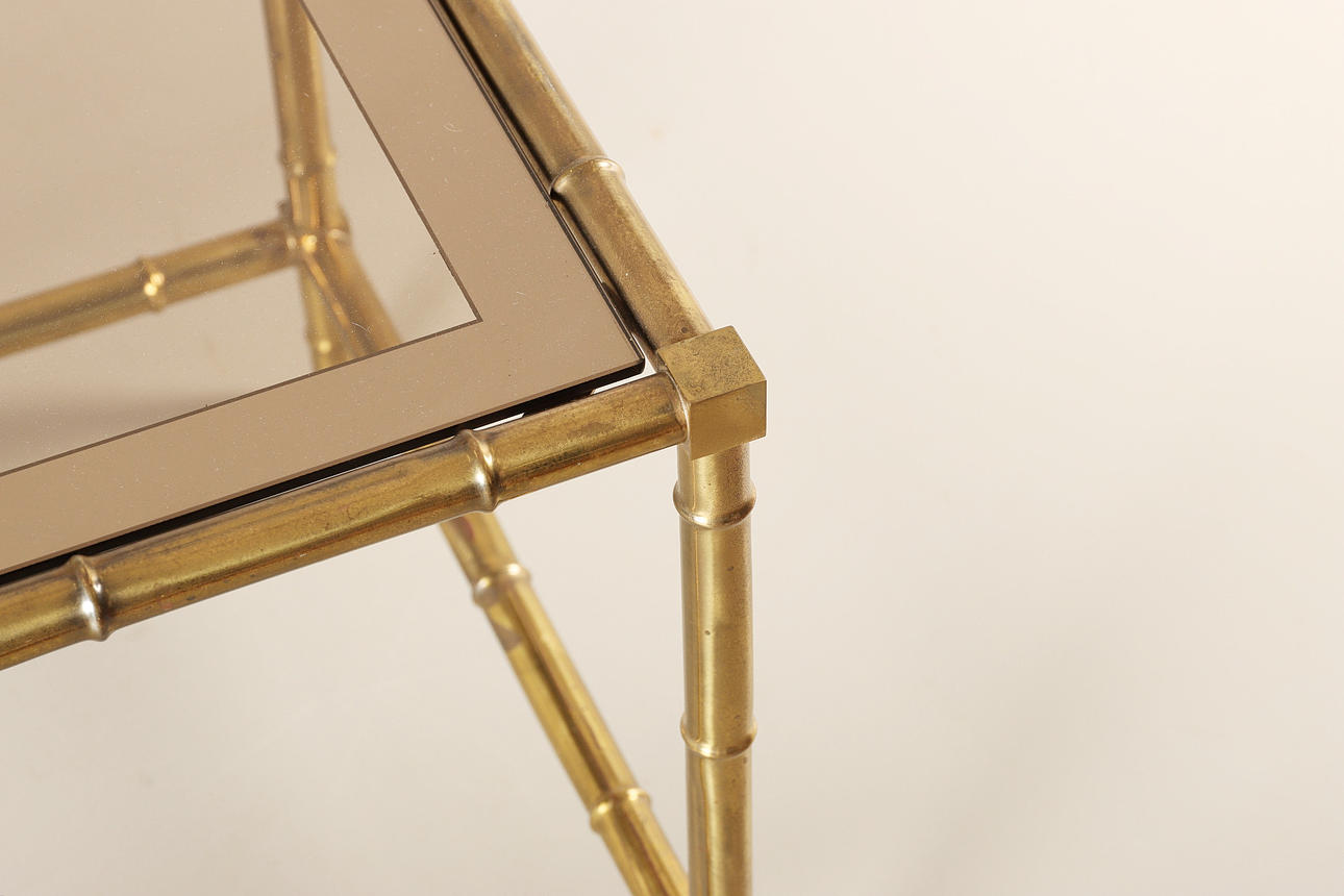 Mesa auxiliar, metal, latón, imitación bambú. Panel de cristal tintado ahumado. Alto 45 cm Largo 65 cm Fondo 45 cm.