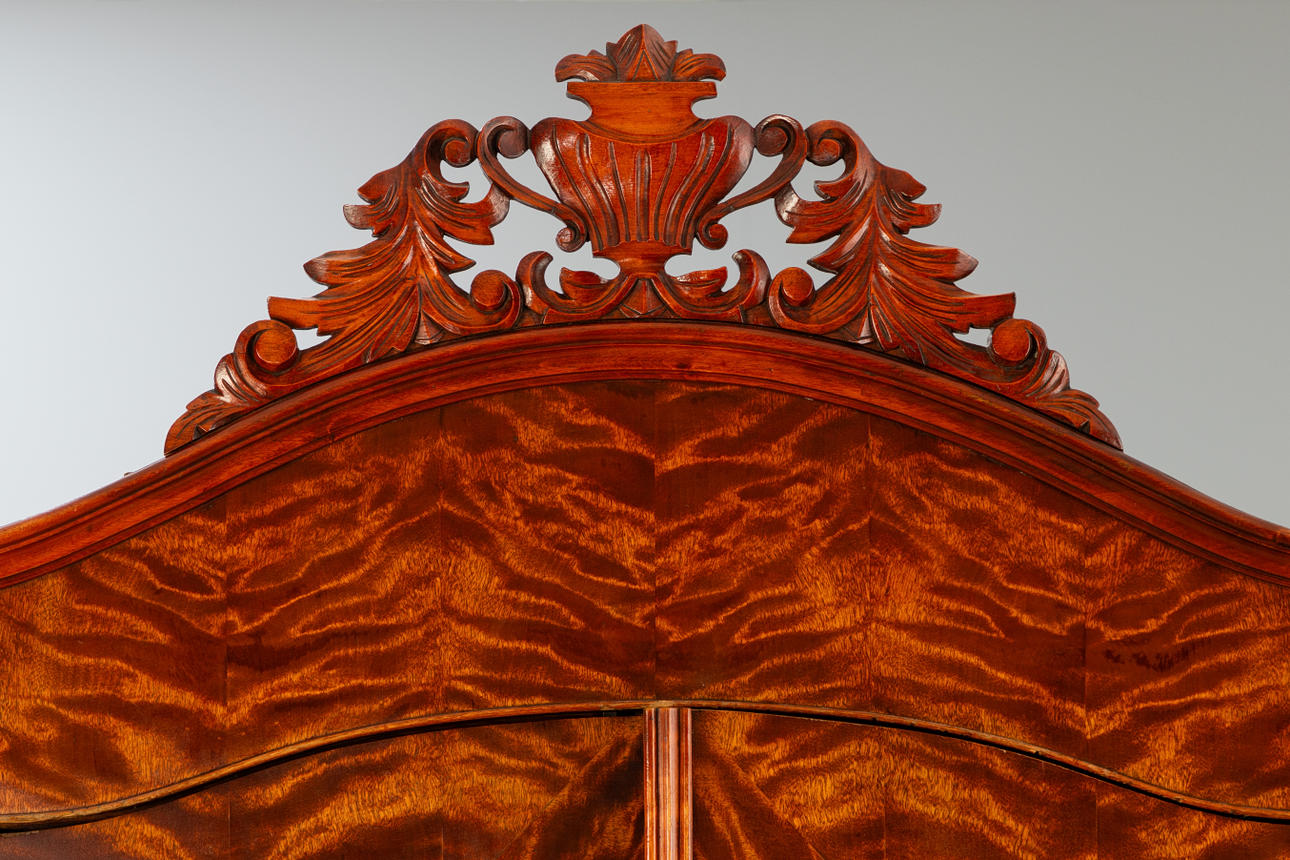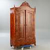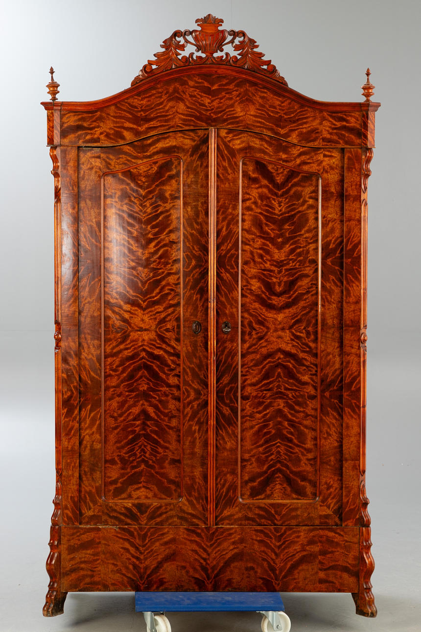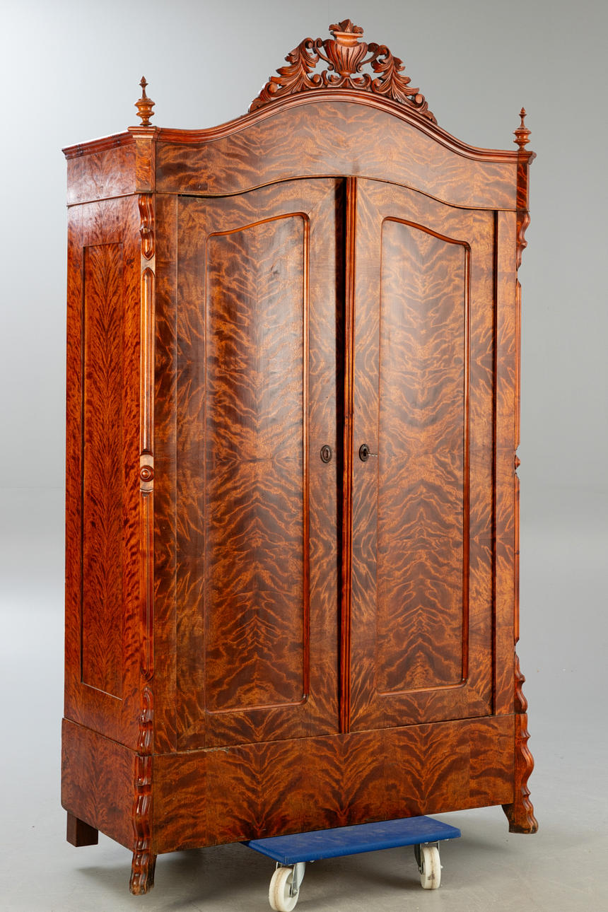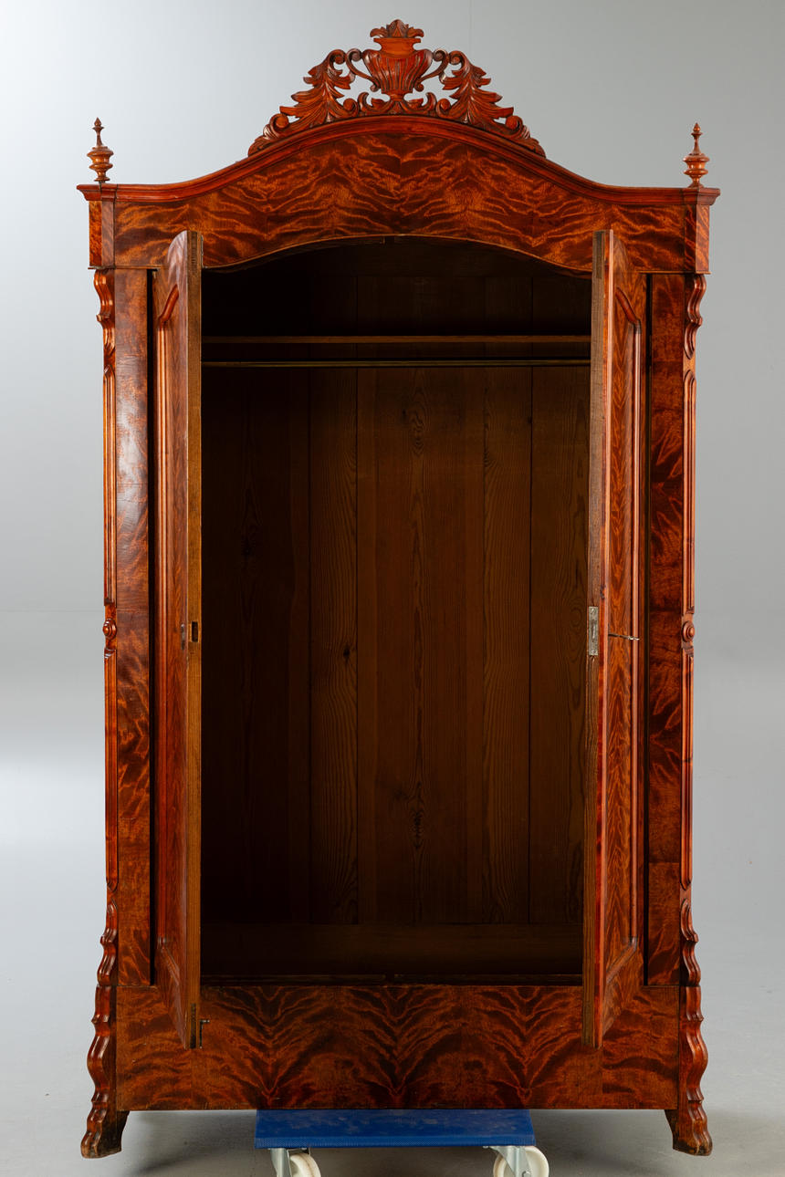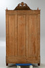 enchapado en madera blanda. En las dos puertas, marcos ligeramente curvados con marcos de perfiles. Vegetal, frontón hinchado con coronación de jarrón, flanqueado por conos torneados. Estantería interior y perchero. AxAxP: 210 x 113 x 54 cm.
