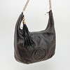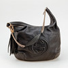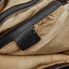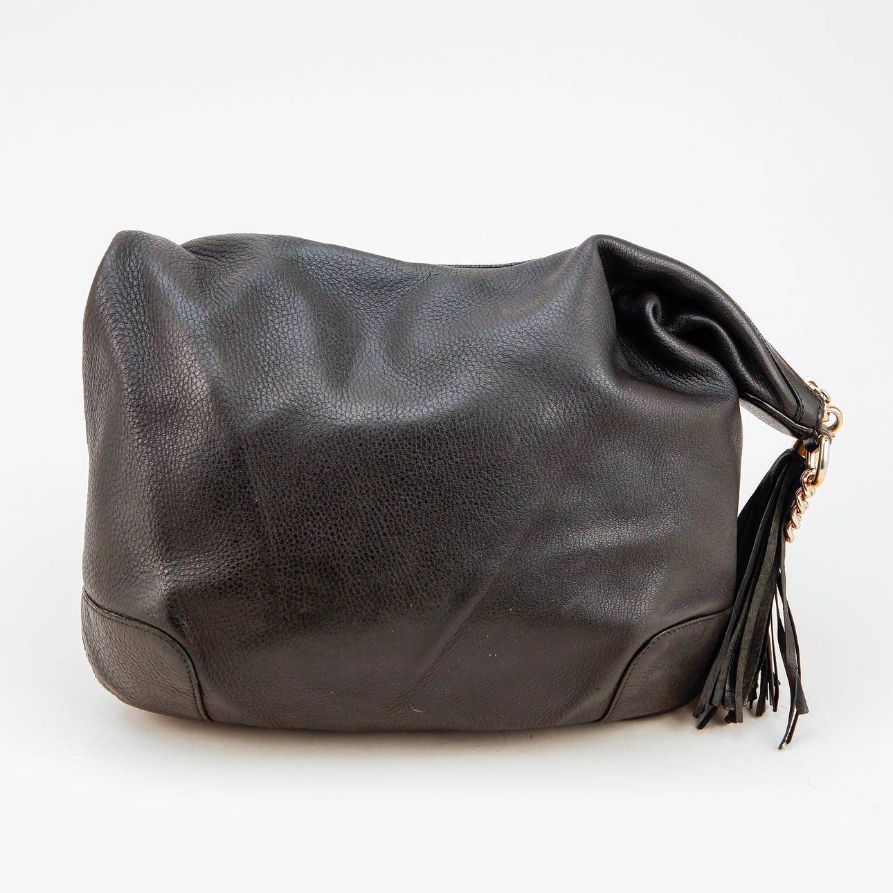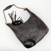 Cuero negro con cadena y detalles en metal amarillo, aproximadamente 38 x 34 x 10 cm.