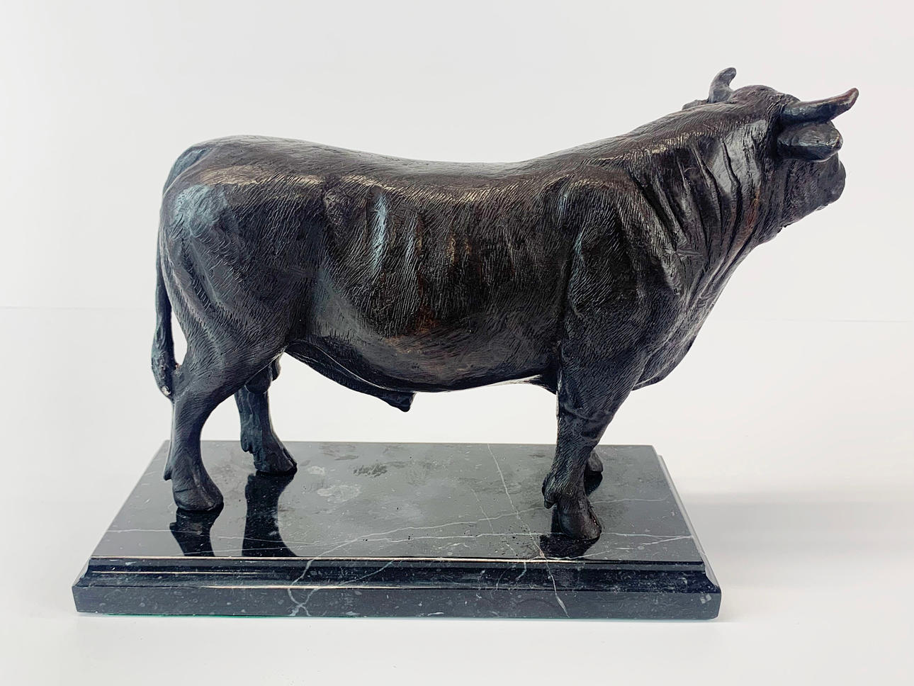 Figura de bronce de un toro sobre base de mármol negro, H. 17 cm.
