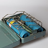 Alimentado por propano. Carcasa de chapa lacada. Placas/parrillas en acero inoxidable. Patas abatibles que actúan como soporte. Largo aproximado 34 cm.