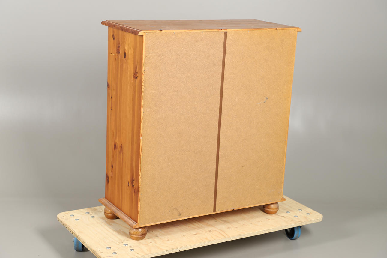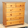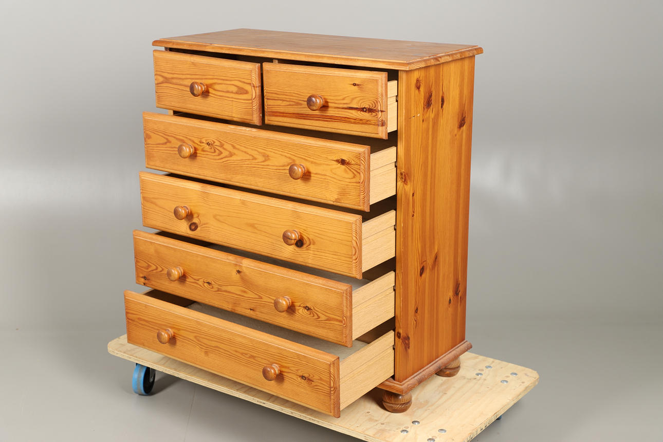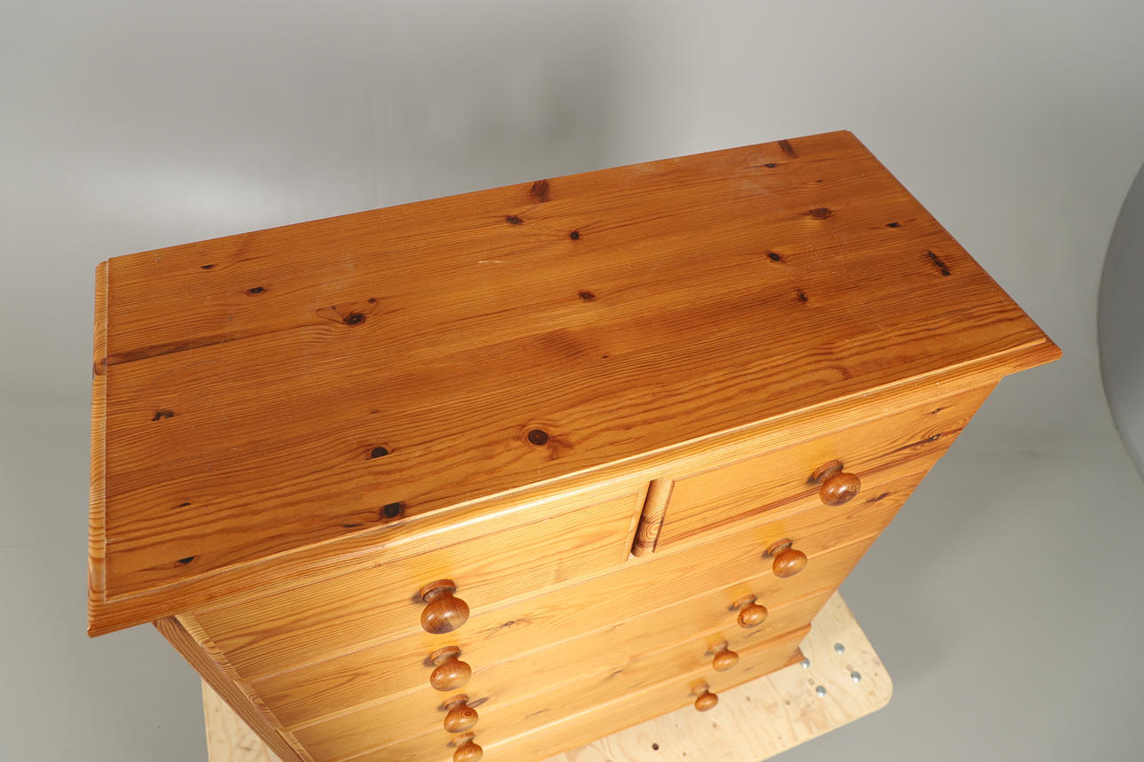 Cómoda de pino con cajones rectangular con borde moldeado sobre dos cajones cortos y cuatro largos graduados, con tiradores de perilla torneados, sobre pies cortos torneados. 94cm de alto, 85cm de ancho y 38cm de fondo.