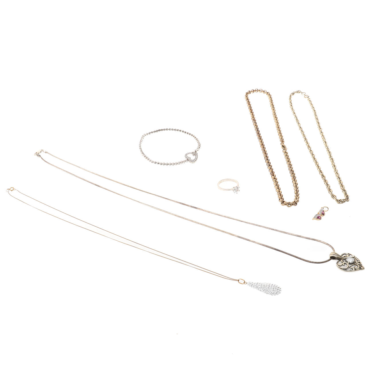 Un colgante para gafas de sol de 375 marcos, engastado con piedras de color púrpura, y un grupo de joyas de 925 marcos, que incluye una pulsera, tres cadenas para el cuello, un colgante y un anillo, 75 g brutos (8).