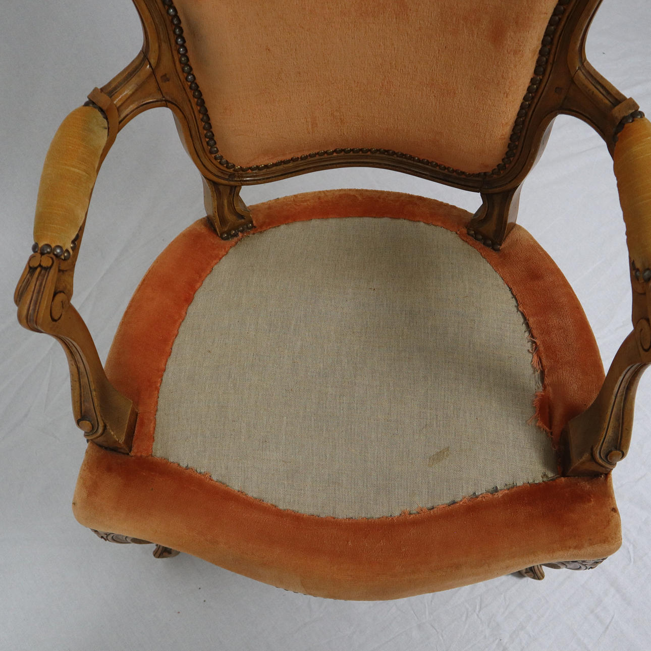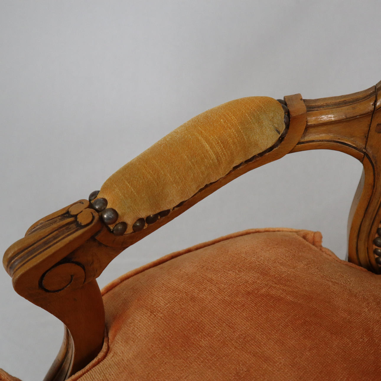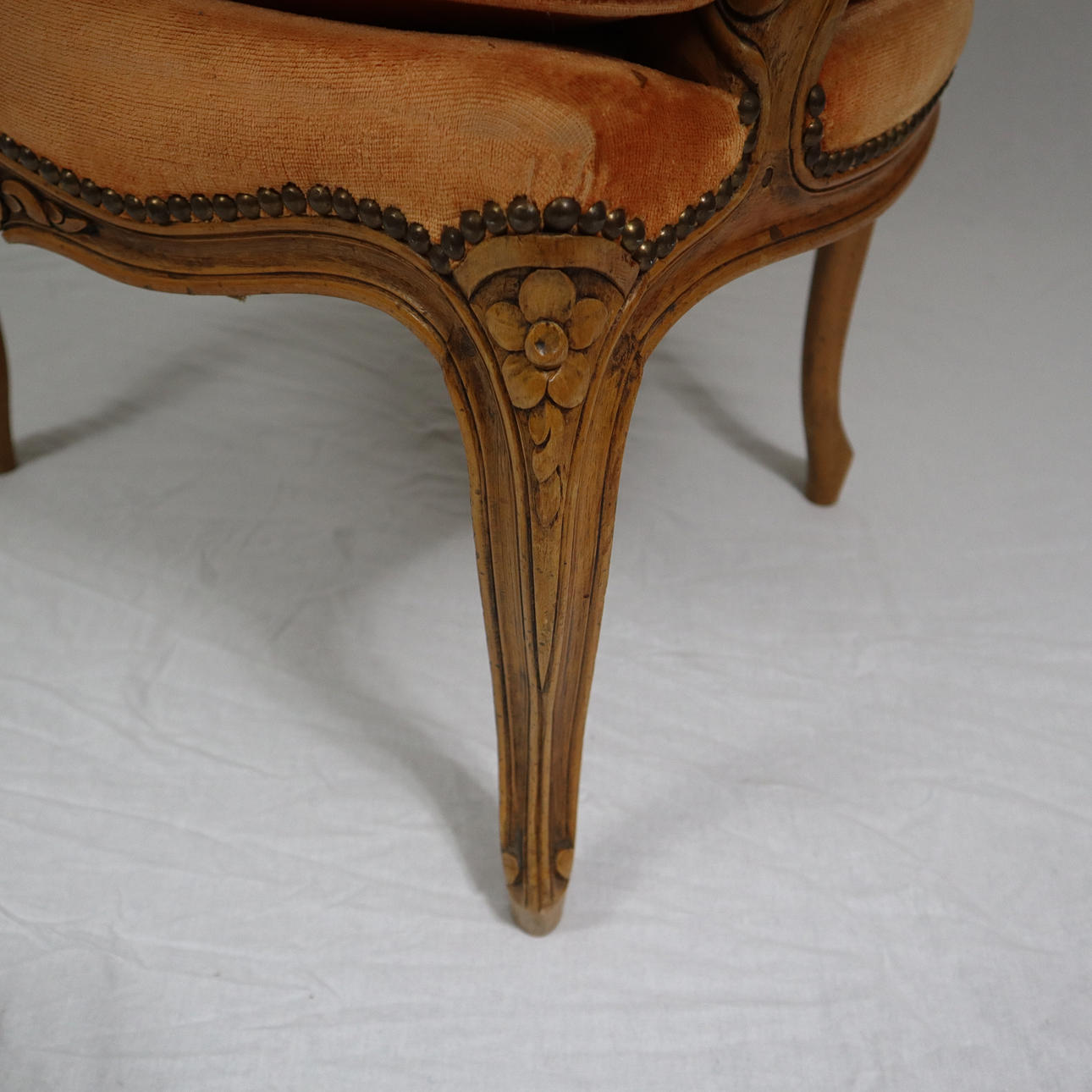 estructura curvada por todos lados con flores talladas, brazos y respaldo tapizados, asiento con tapizado de la forma adecuada, remaches, aproximadamente 82 x 55 cm, altura del asiento sin tapizado 39 cm.