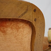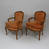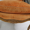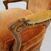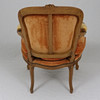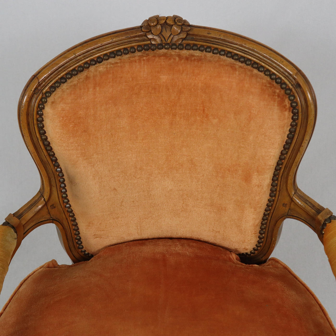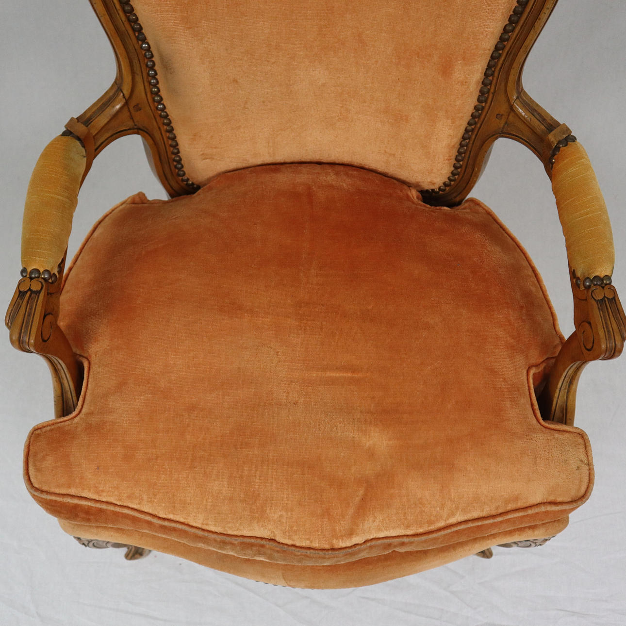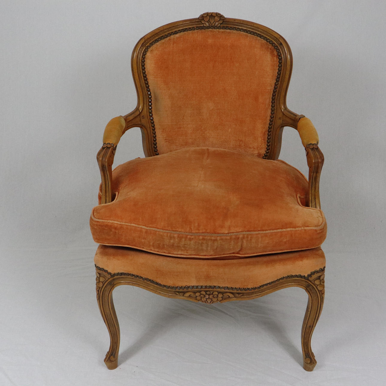 estructura curvada por todos lados con flores talladas, brazos y respaldo tapizados, asiento con tapizado de la forma adecuada, remaches, aproximadamente 82 x 55 cm, altura del asiento sin tapizado 39 cm.