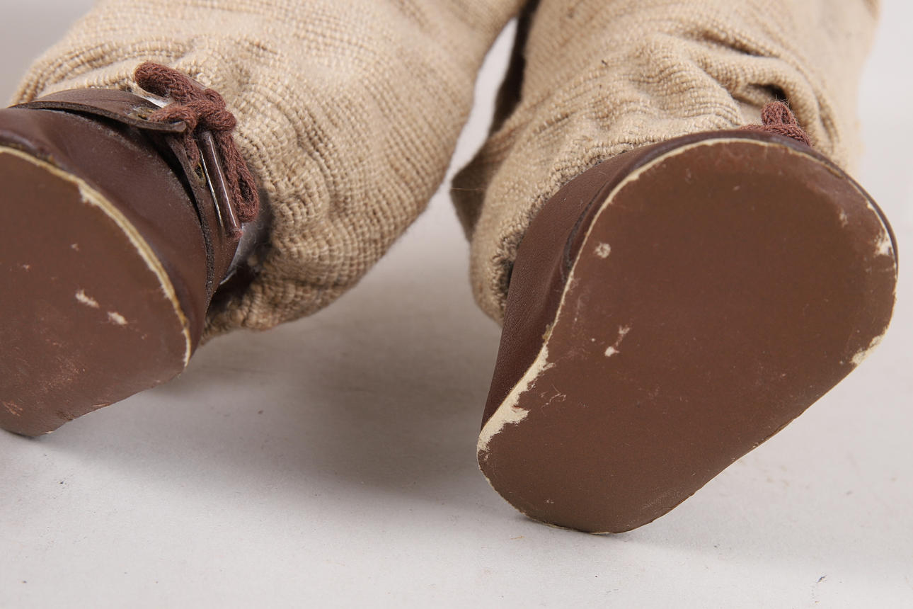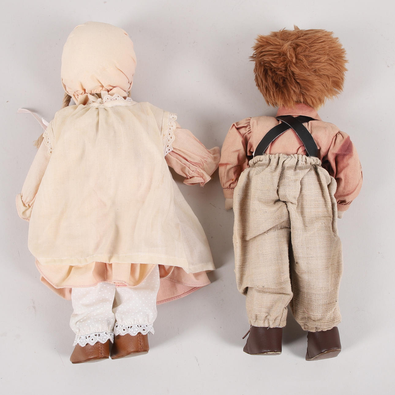 Estado de uso, suciedad en la superficie, tapicería blanqueada por el sol, zapatos desgastados, una de las muñecas tiene un par de marcas en el zapato derecho.