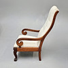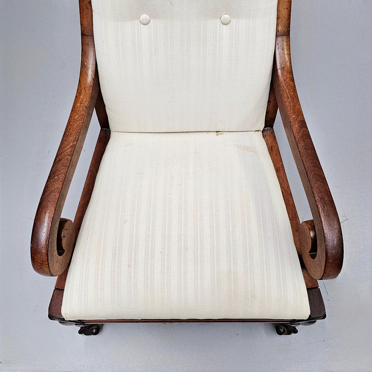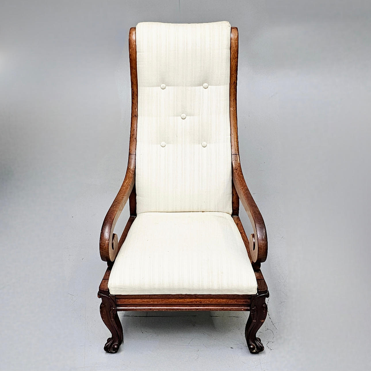 Tapicería color crudo, apoya sobre patas en garra. 105x58x56 cm.