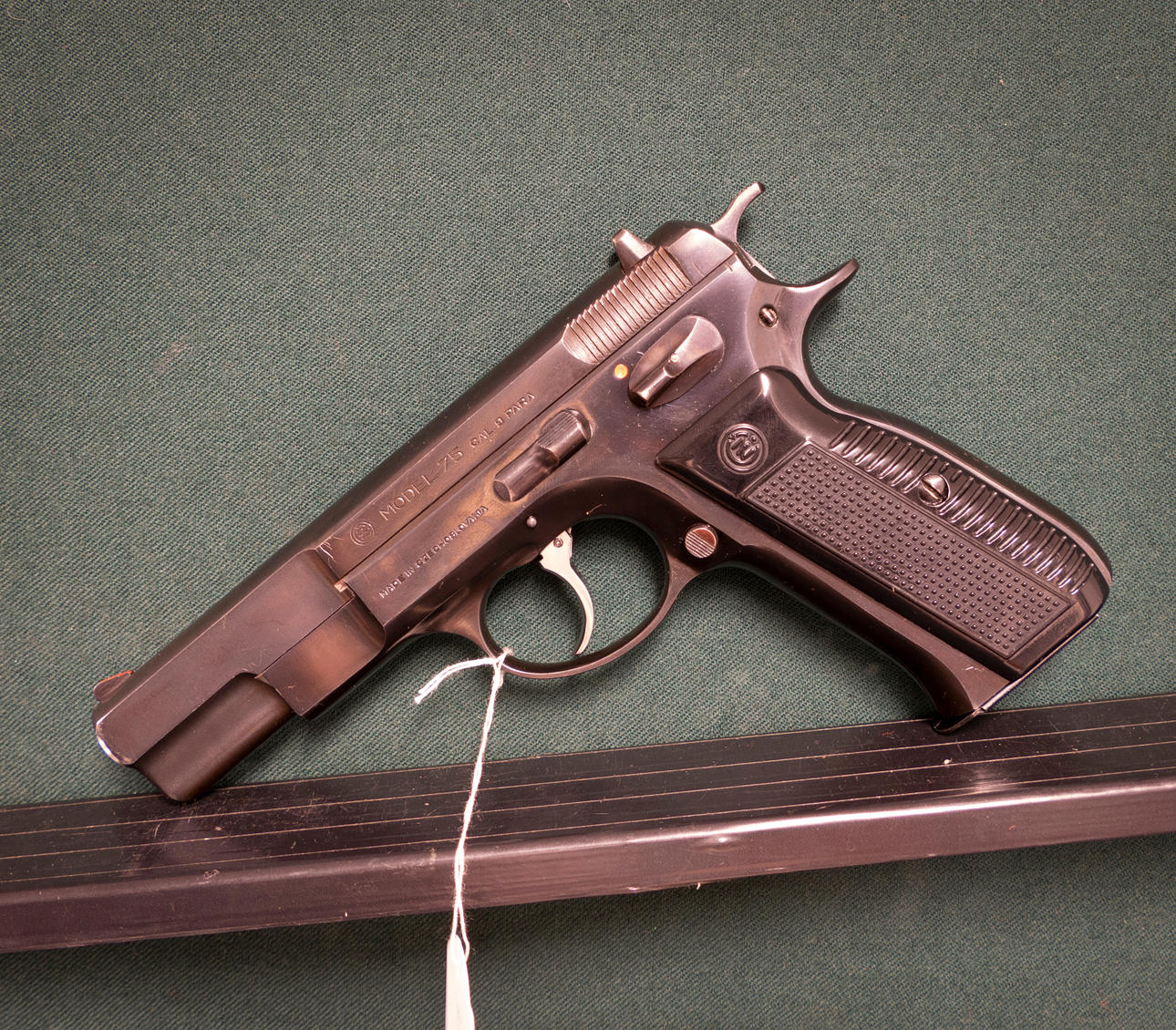 Pistola Checa Semiautomática. Haz el modelo CZ 75. Calibre 9x19. Nº de extensión 13010. Largo del caño 11cm. Objetivo fijo. Revista extraíble. Lados negros del pistón.