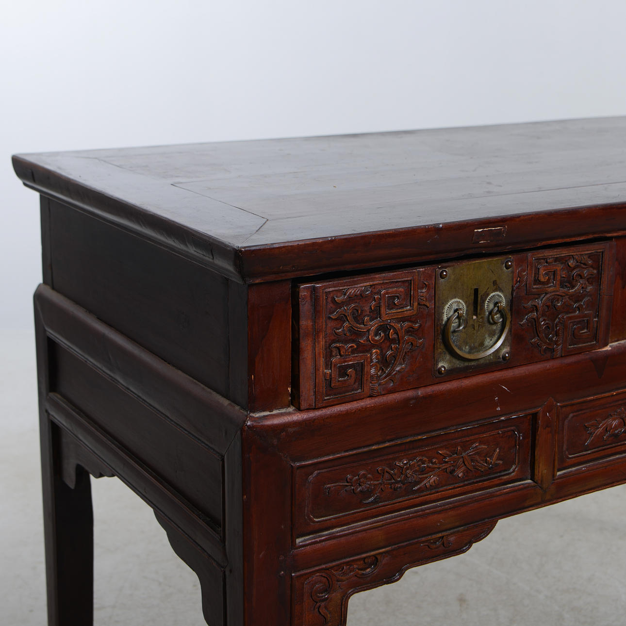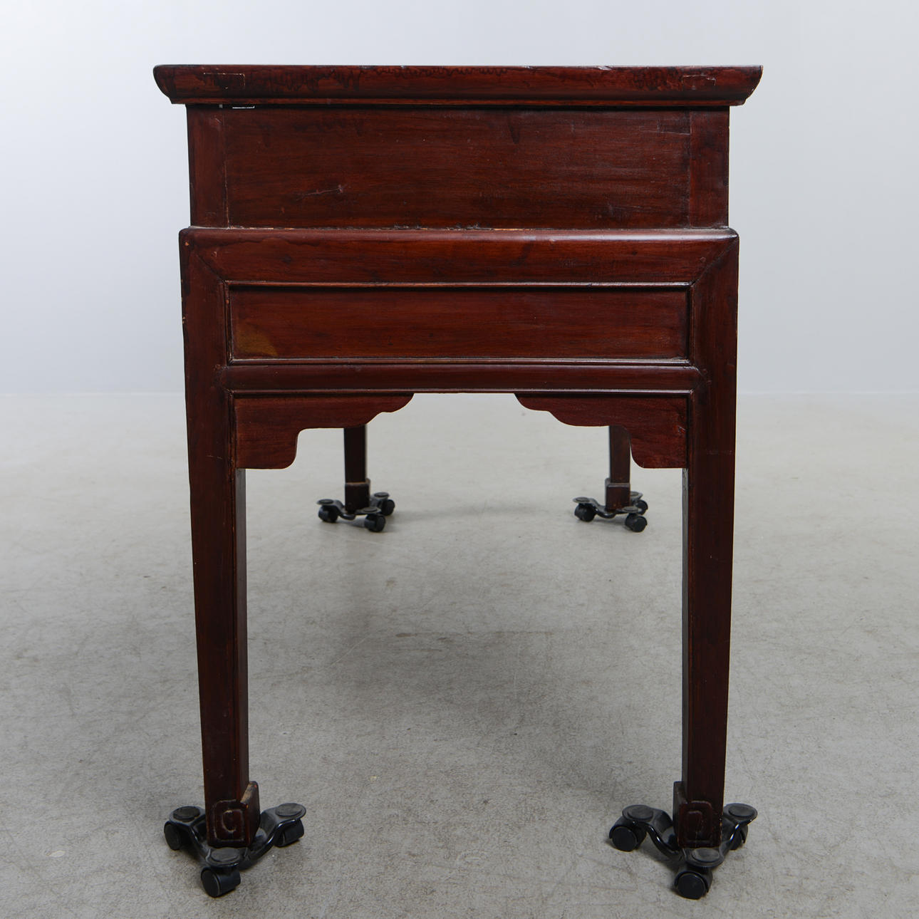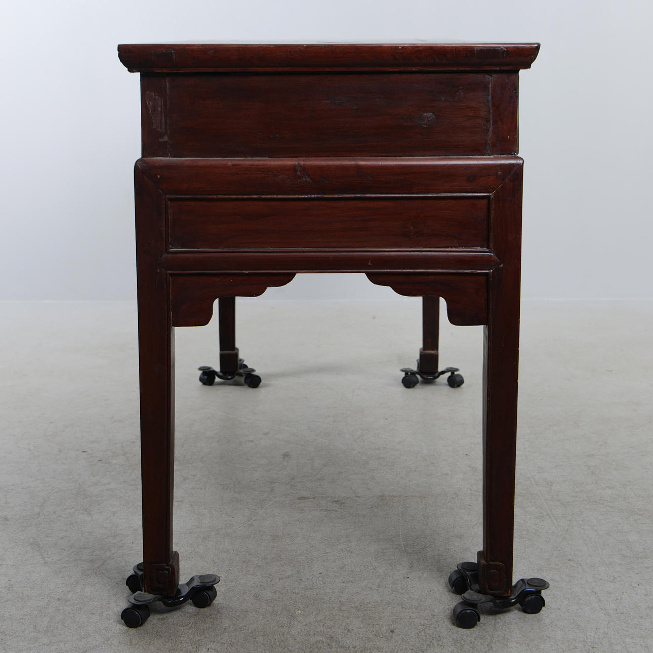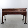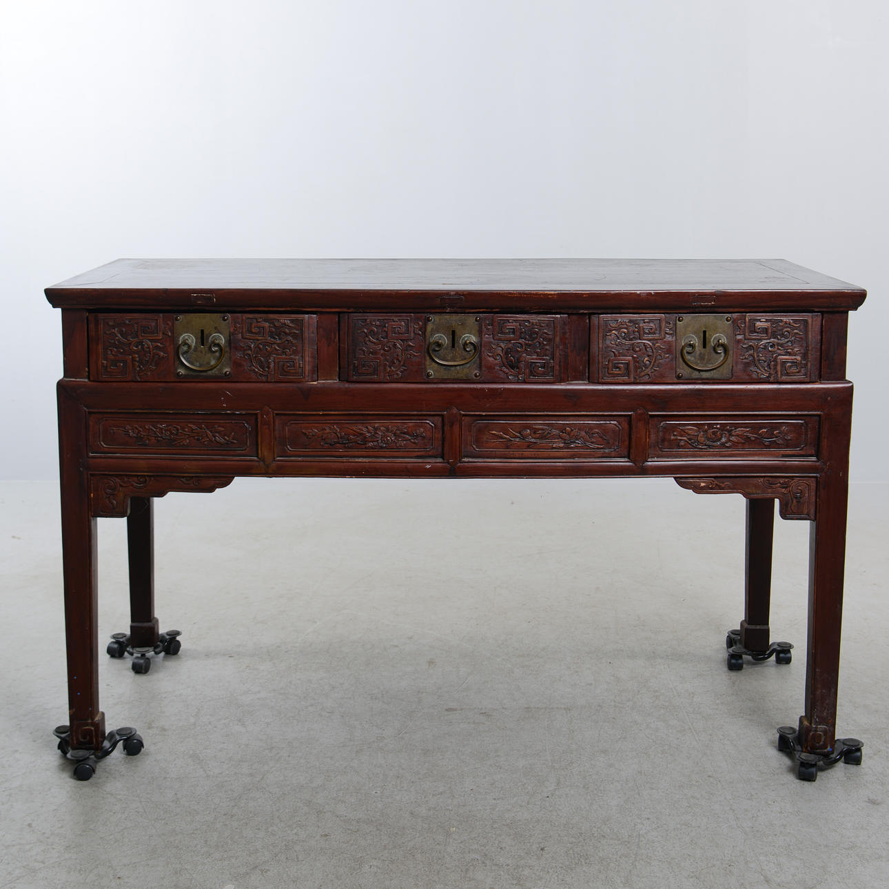 Manchado oscuro. Decoración en relieve parcialmente cortada. Cajas en caso. Longitud 144 cm. Profundidad 61 cm. Alto 87 cm.