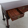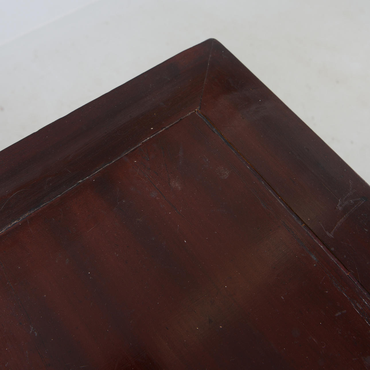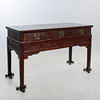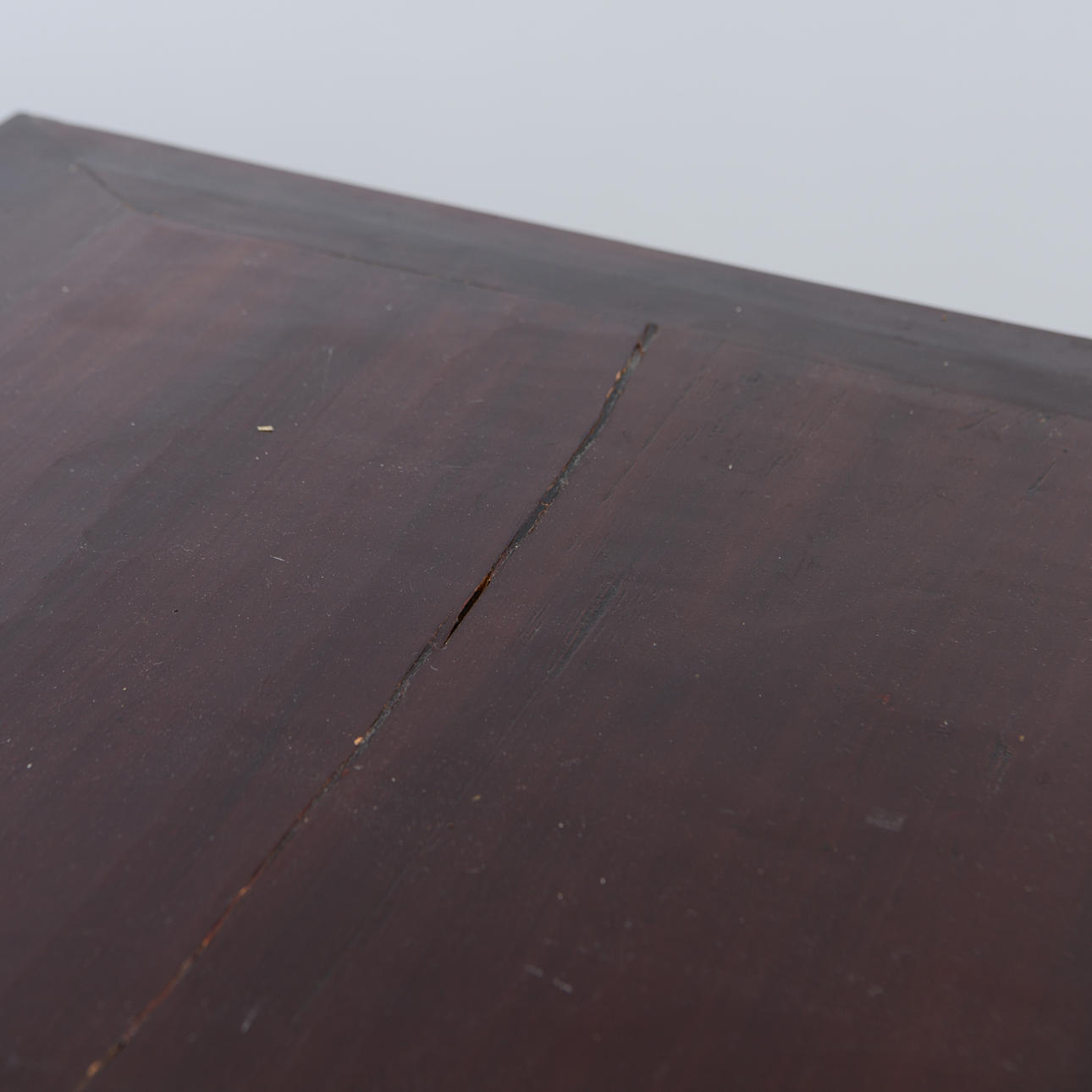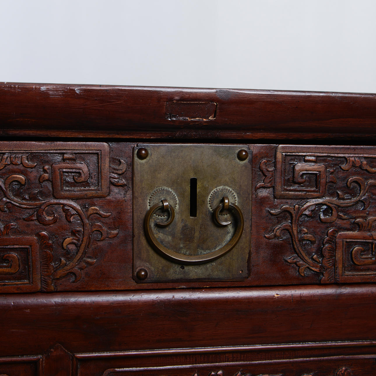 Manchado oscuro. Decoración en relieve parcialmente cortada. Cajas en caso. Longitud 144 cm. Profundidad 61 cm. Alto 87 cm.
