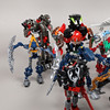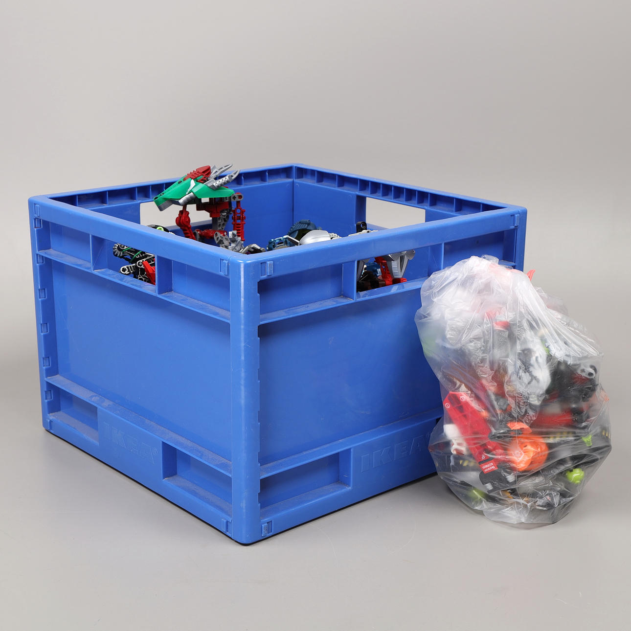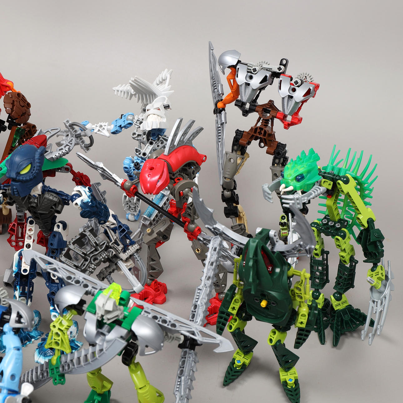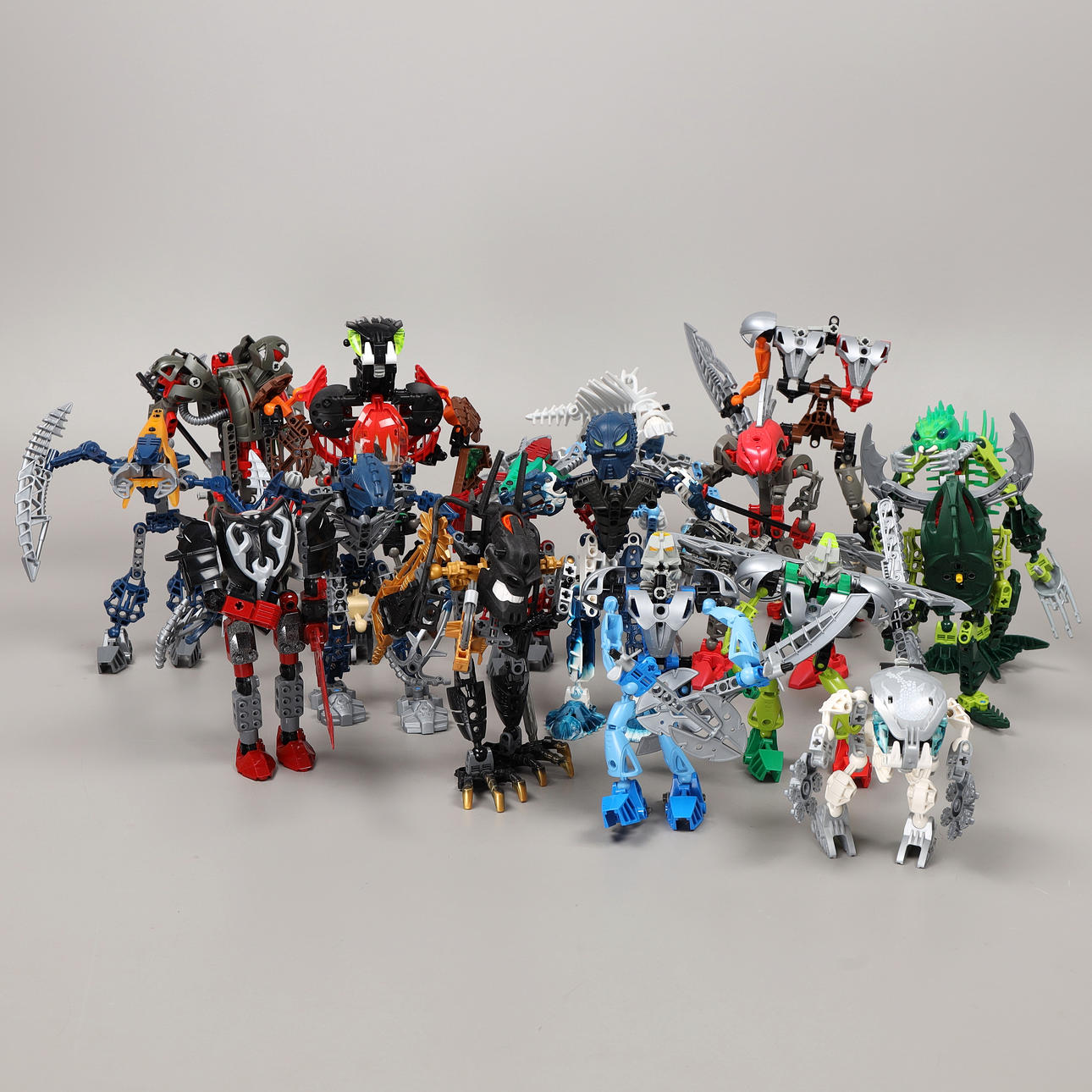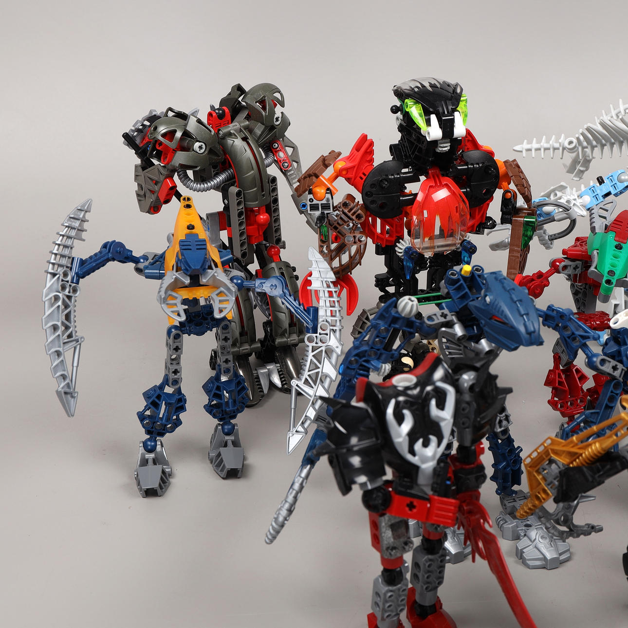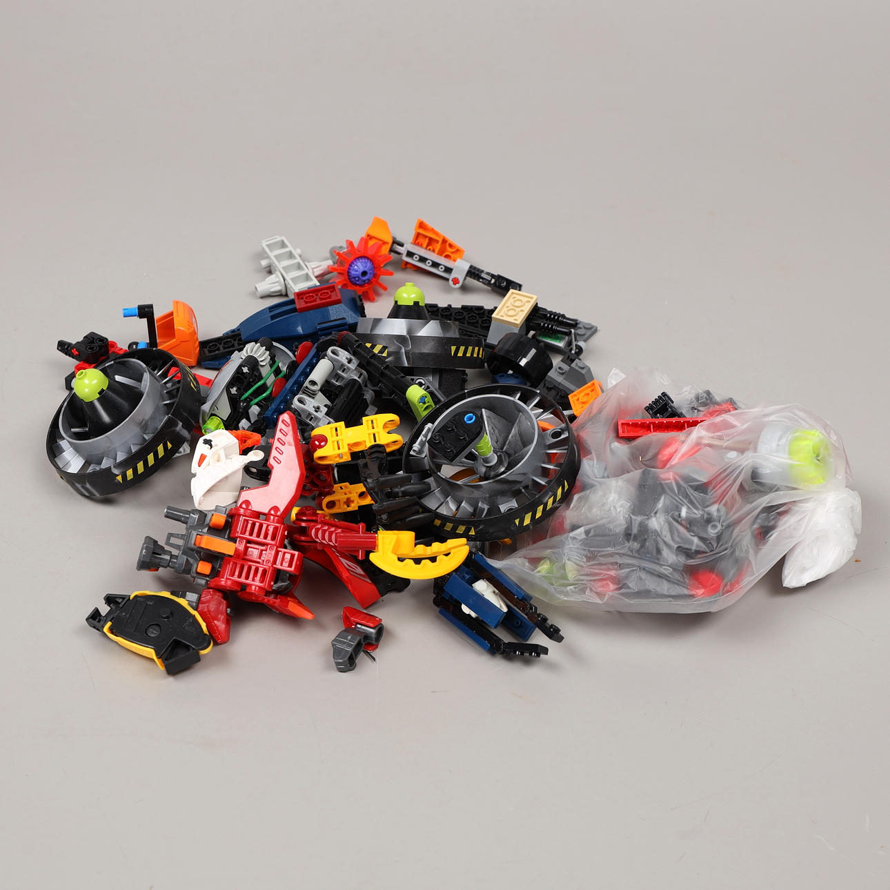 Una bandeja de plástico llena de figuras y accesorios de la serie Bionicle.