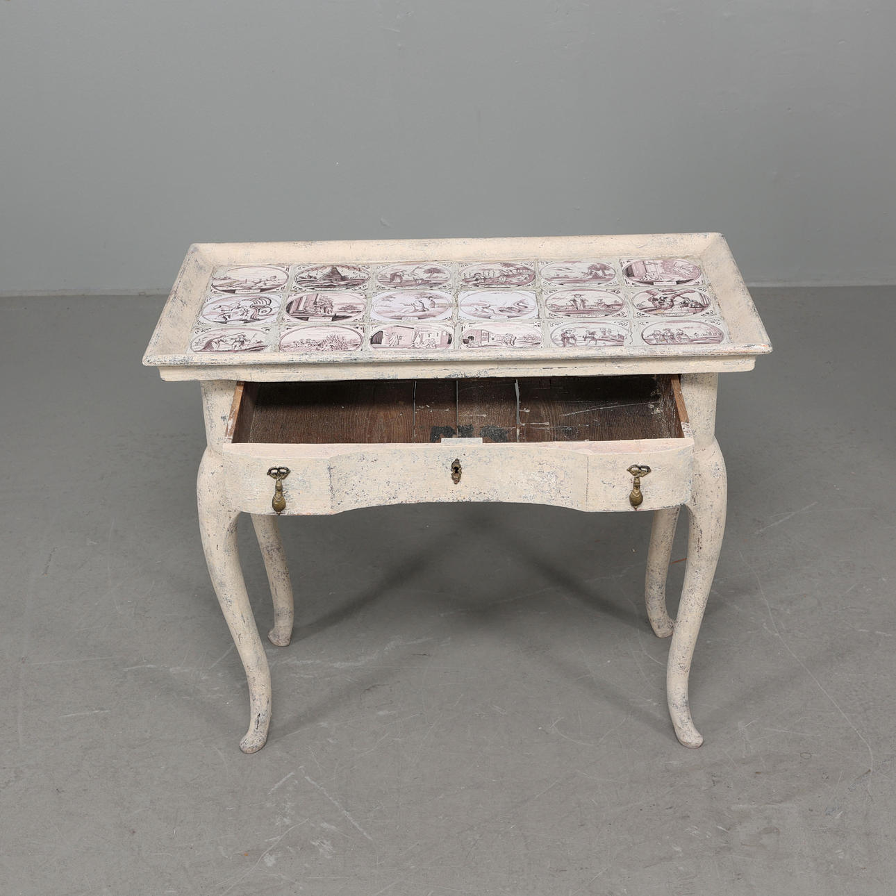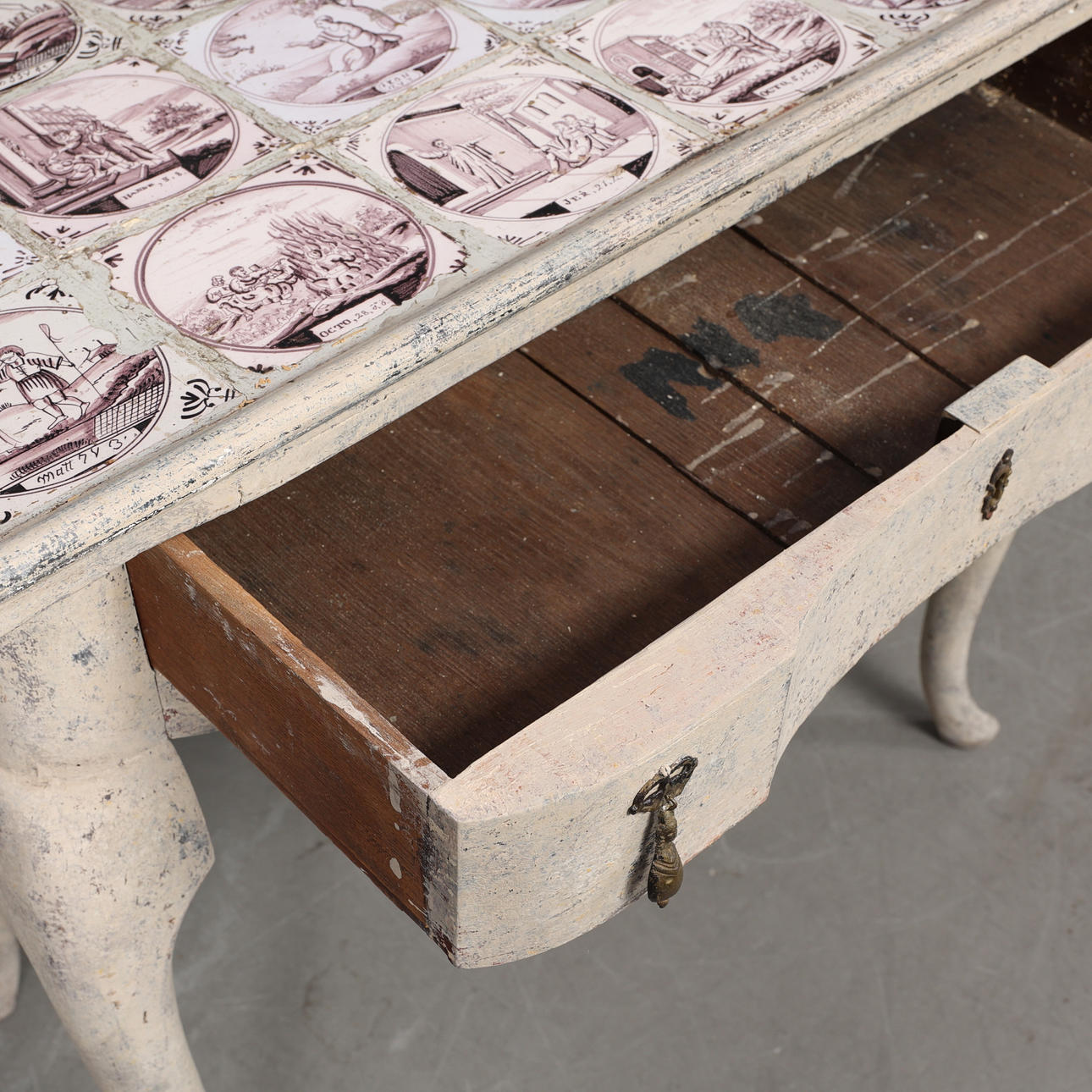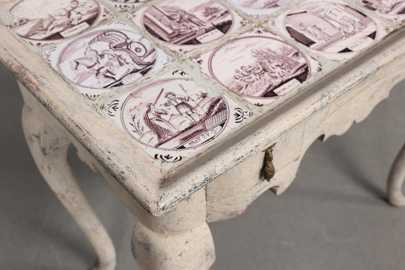 Mesa de azulejos con cajón extraíble. Azulejo con motivos bíblicos Altura 76 cm Profundidad 50 cm Longitud 91 cm.