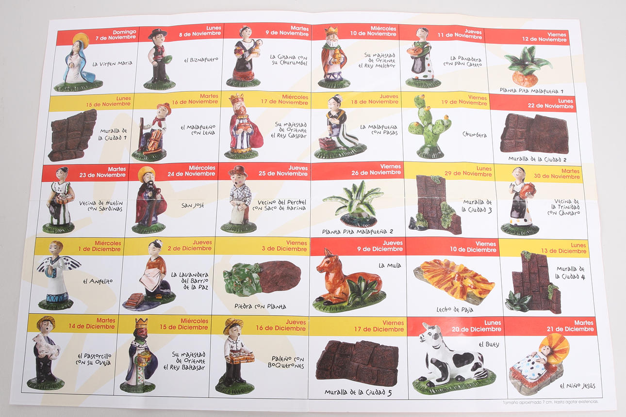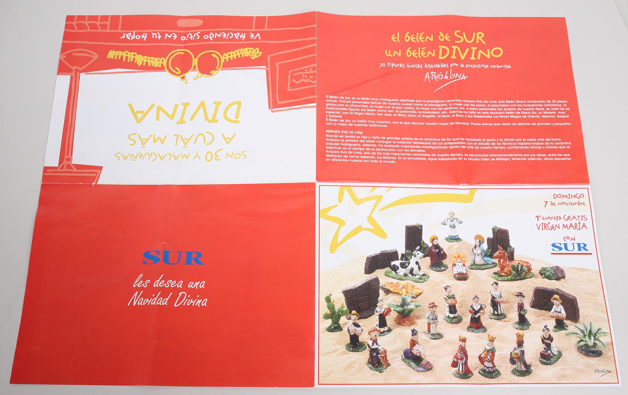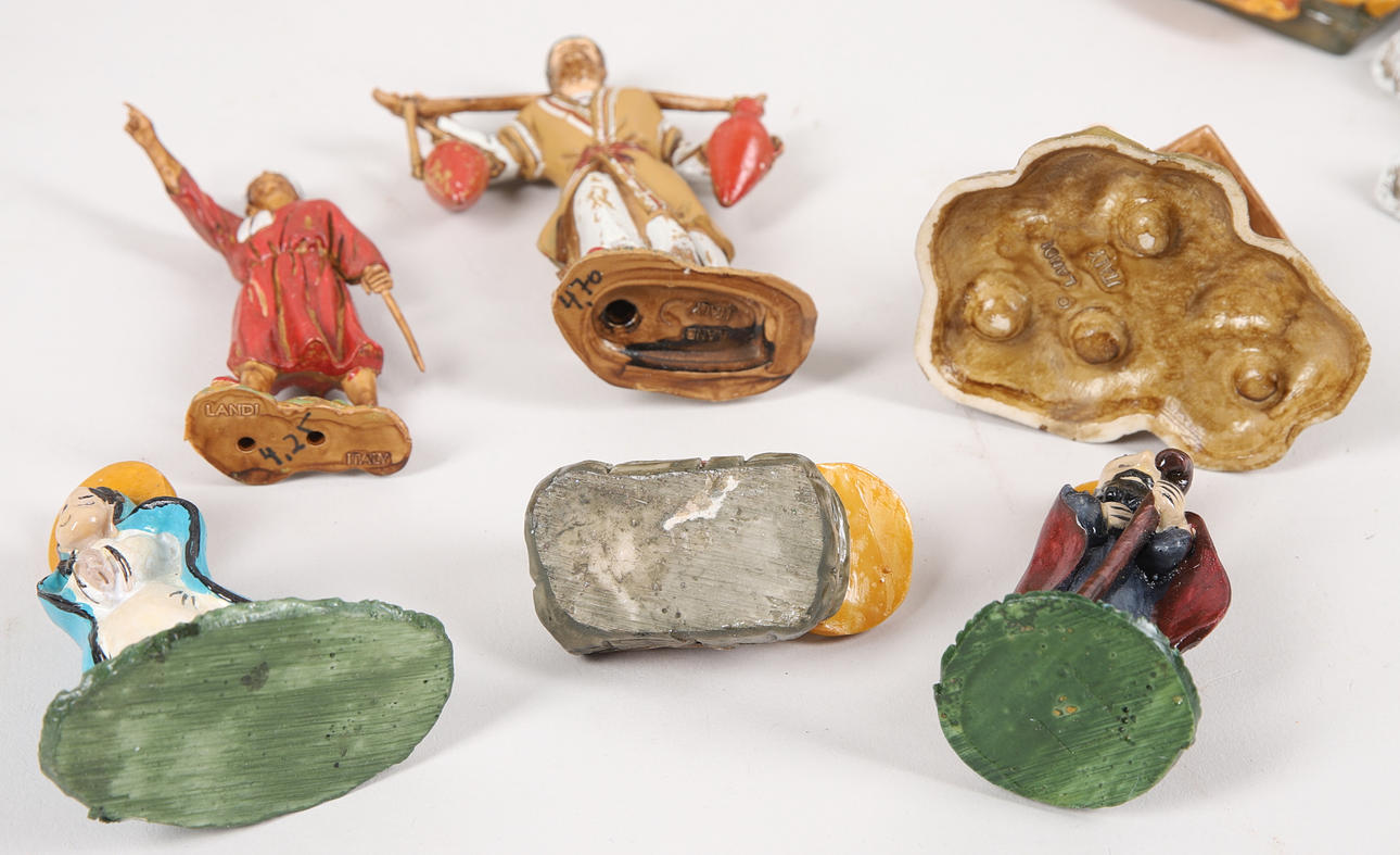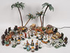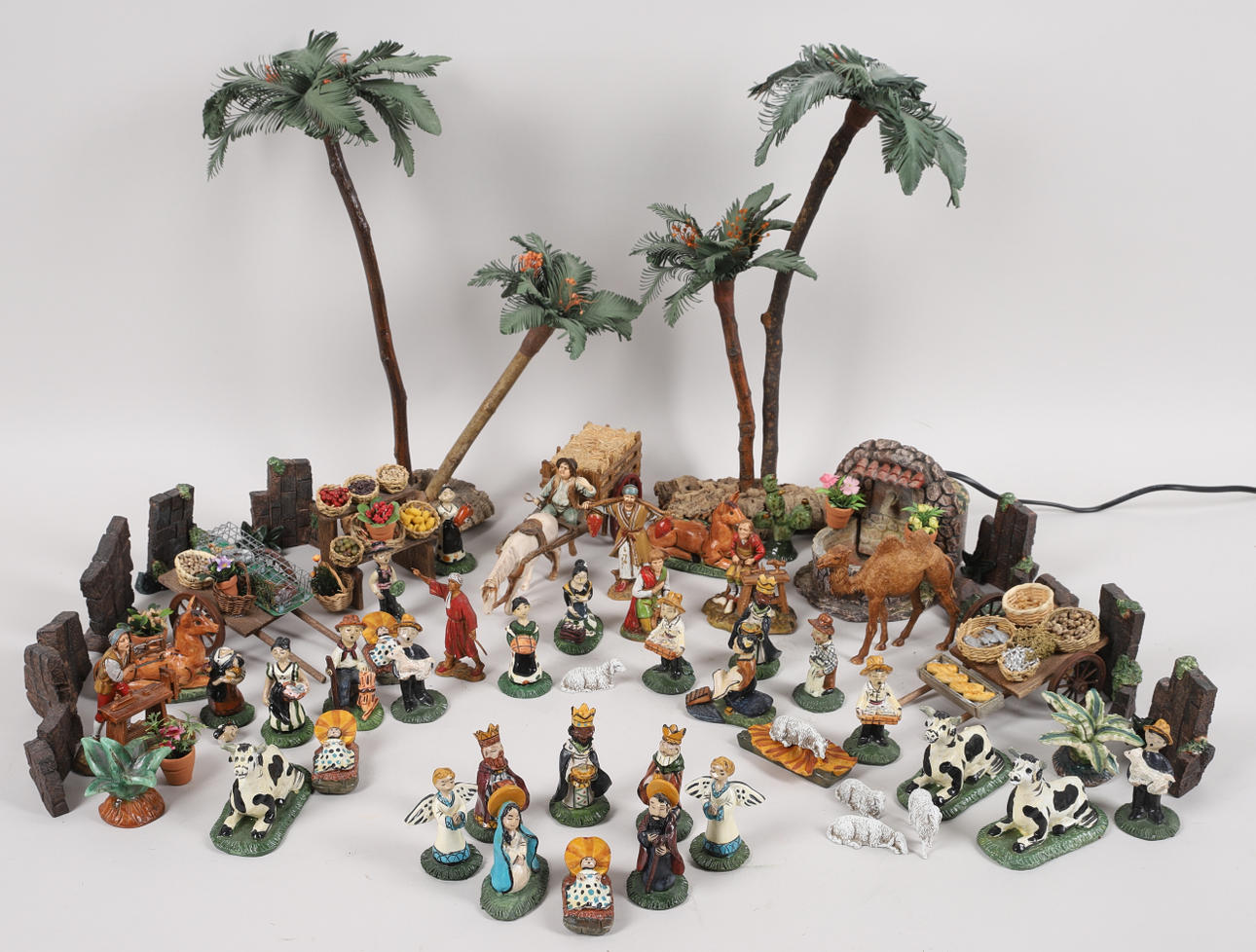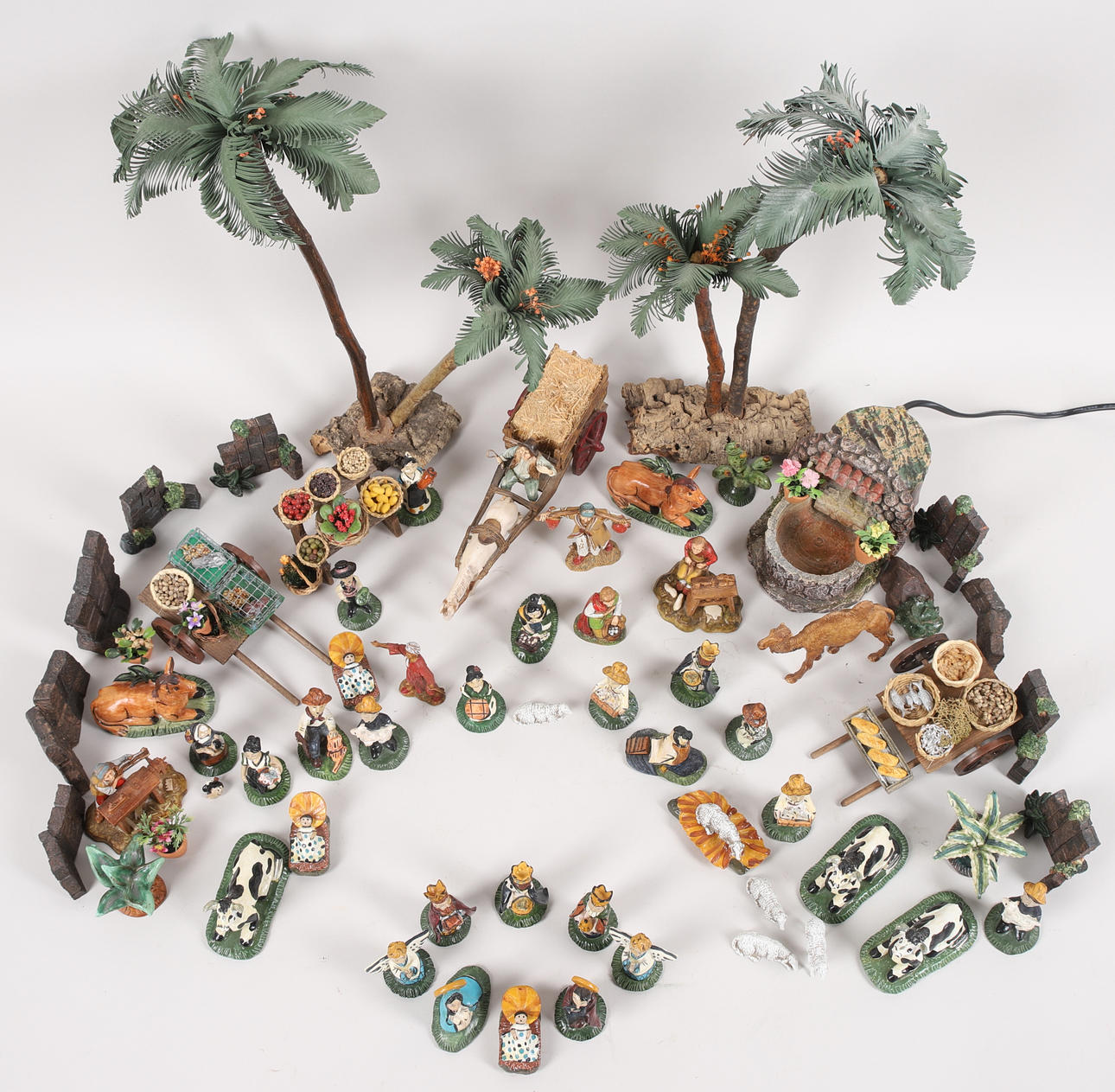 Ovejas, vacas, burros, puestos de mercado, reyes magos, palmeras (la más alta mide aproximadamente 39 cm), etc. Carro tirado por un caballo, longitud aproximadamente 23 cm.