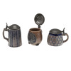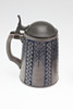Tres jarras de gres, de diferentes tamaños y cada una montada con tapas de peltre. Cada uno con marcas impresas en la base, 17,5 cm, 12,5 cm y 14 cm de alto (en la parte superior de las asas). (3).