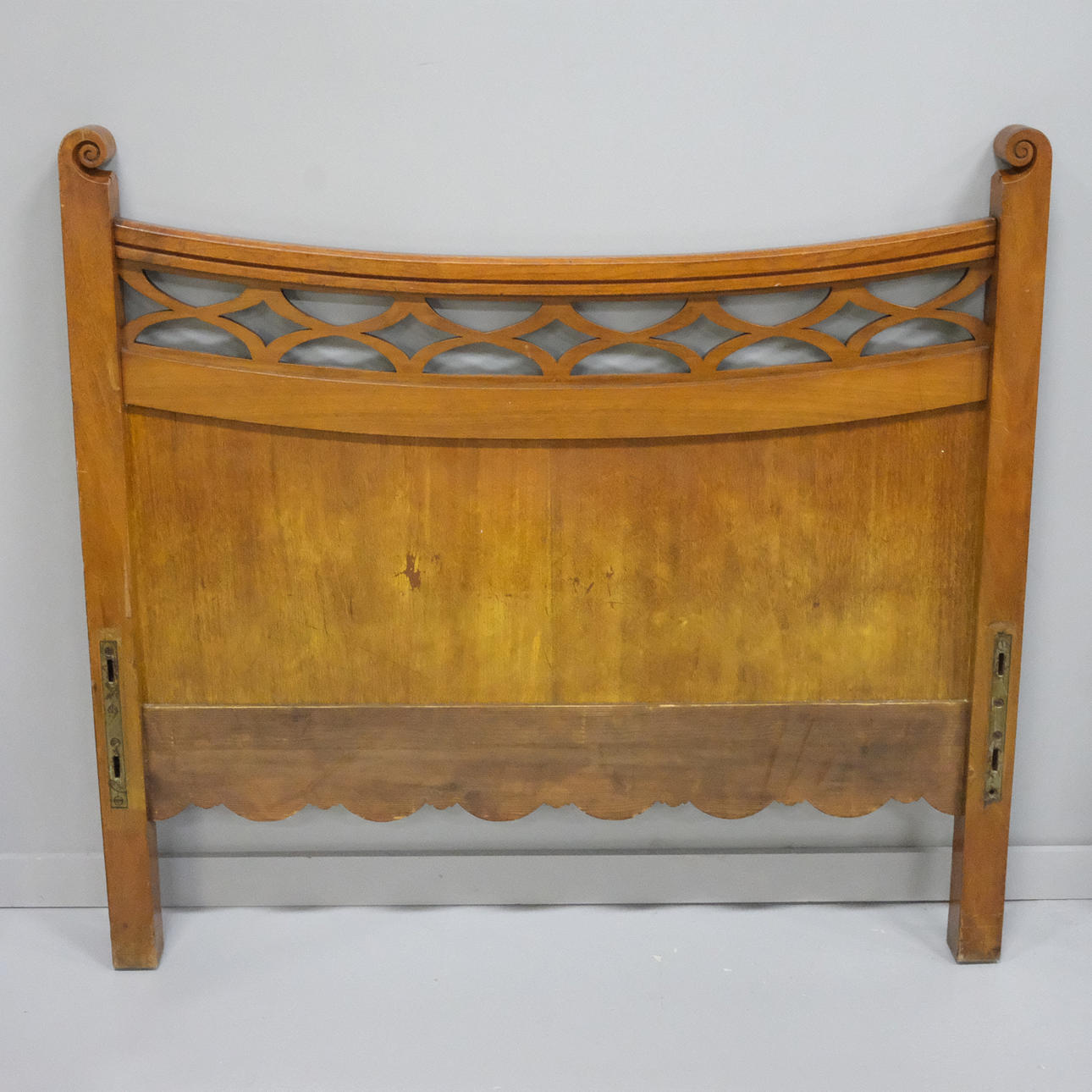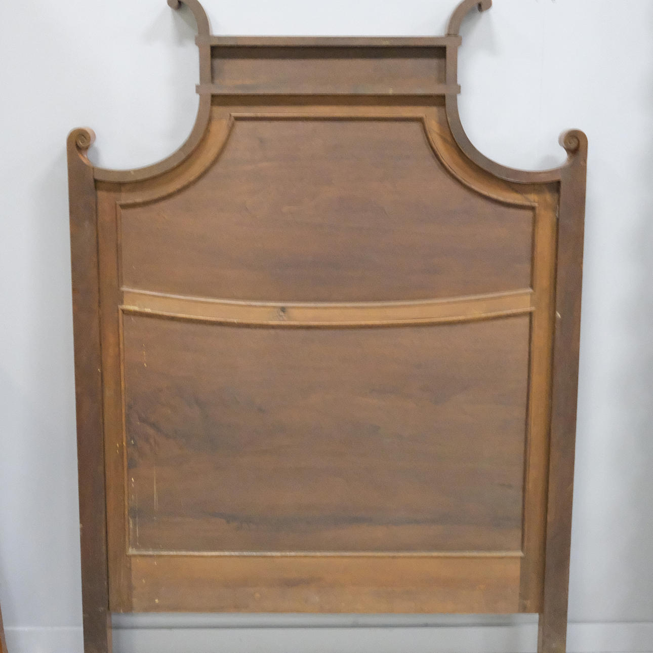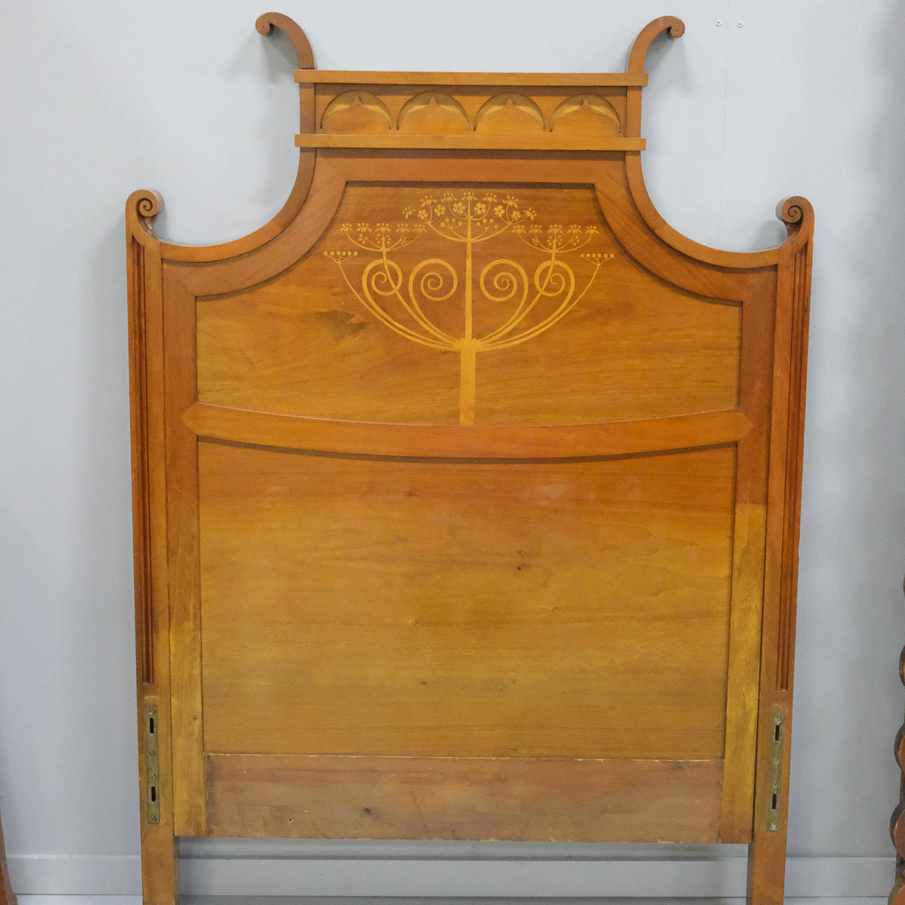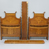 Un par de camas. Frontones con intarsia y decoración calada en caoba. Alto 100 y 152cm, ancho 107cm, largo 201cm.