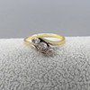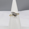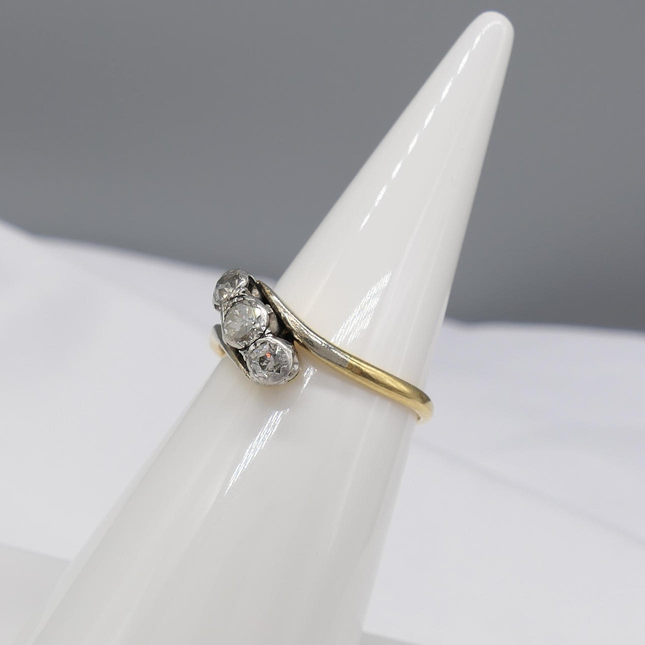 Un anillo de estilo victoriano engastado con tres diamantes de talla antigua graduados en una montura de oro amarillo de 18k y platino.