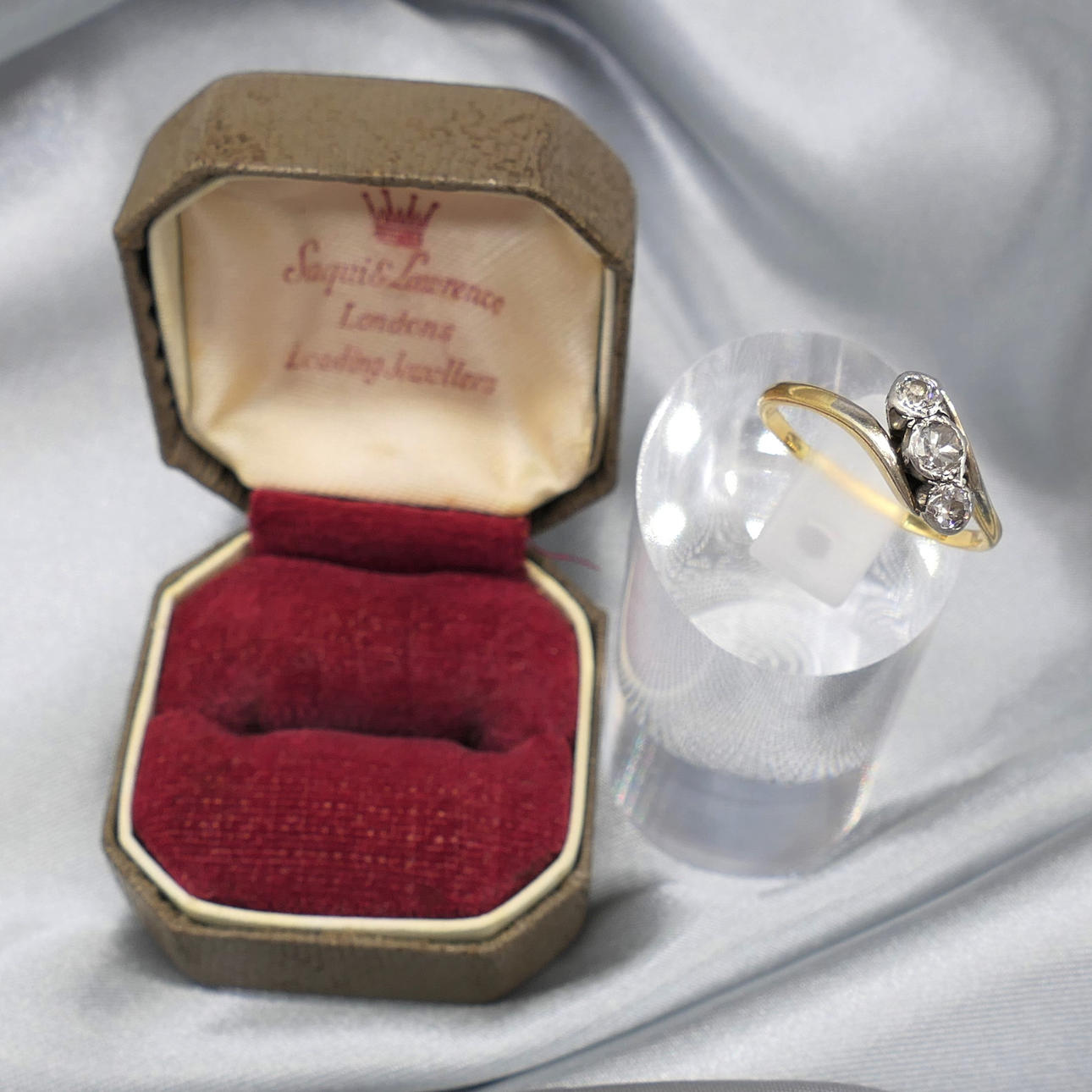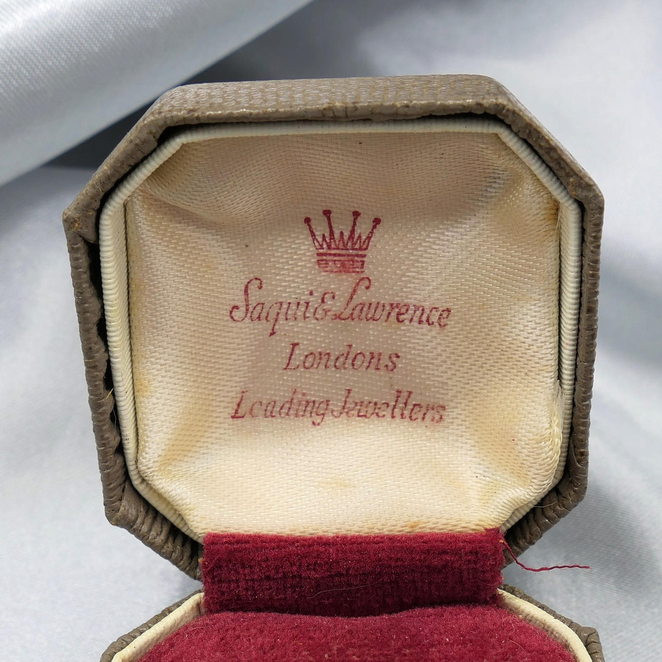 Este anillo de trilogía antiguo original se suministra en una caja de regalo rígida vintage con la marca Saqui & Lawrence.