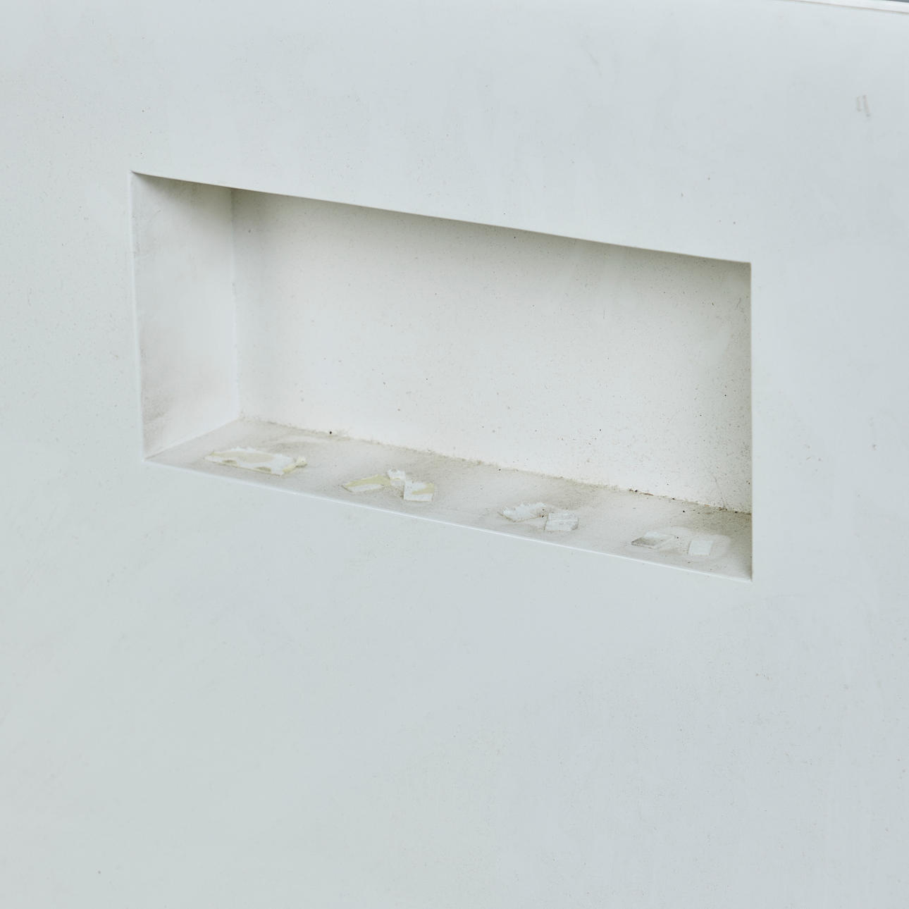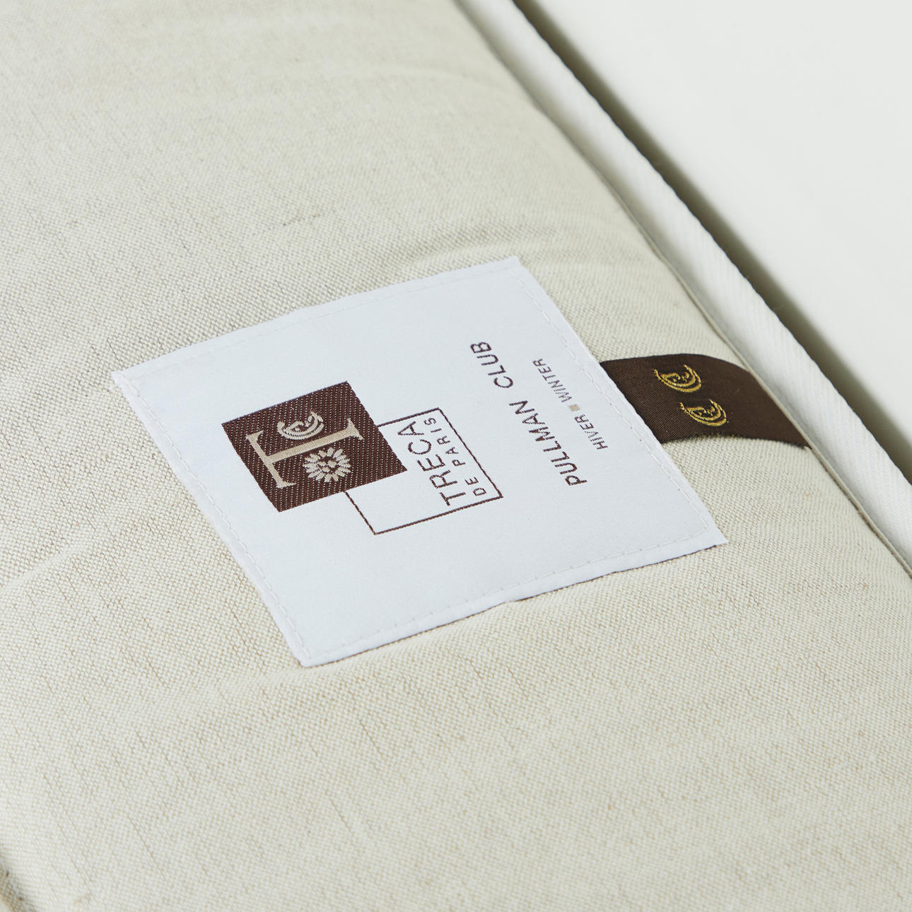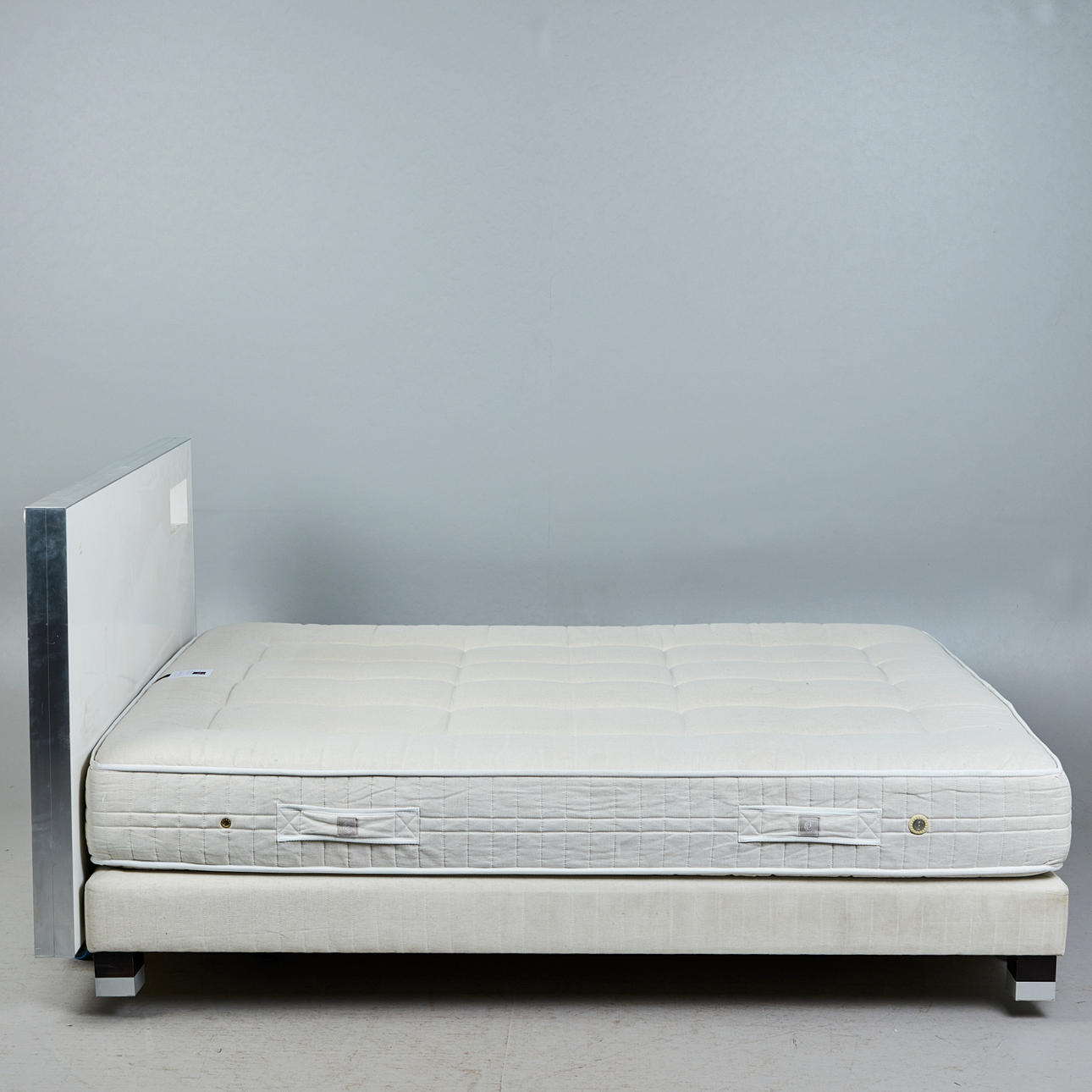 Treca, cama con somier, 'Impérial Pullmann', Francia. Construcción tapizada revestida de tela color blanco crema con respaldo de metal pintado de blanco con compartimento portaobjetos, sobre cuatro pies pintados de gris y blanco, con colchón Treca, dureza media, Al.101cm, altura de descanso: 49cm, An. 160 cm, largo 200 cm.