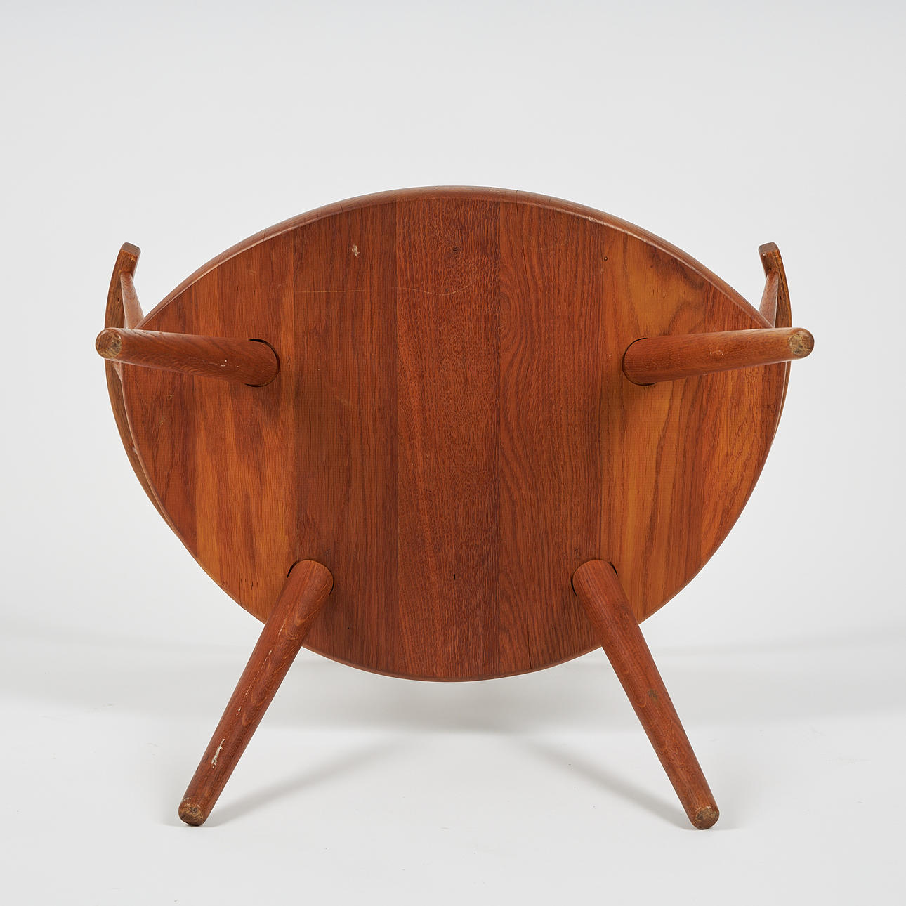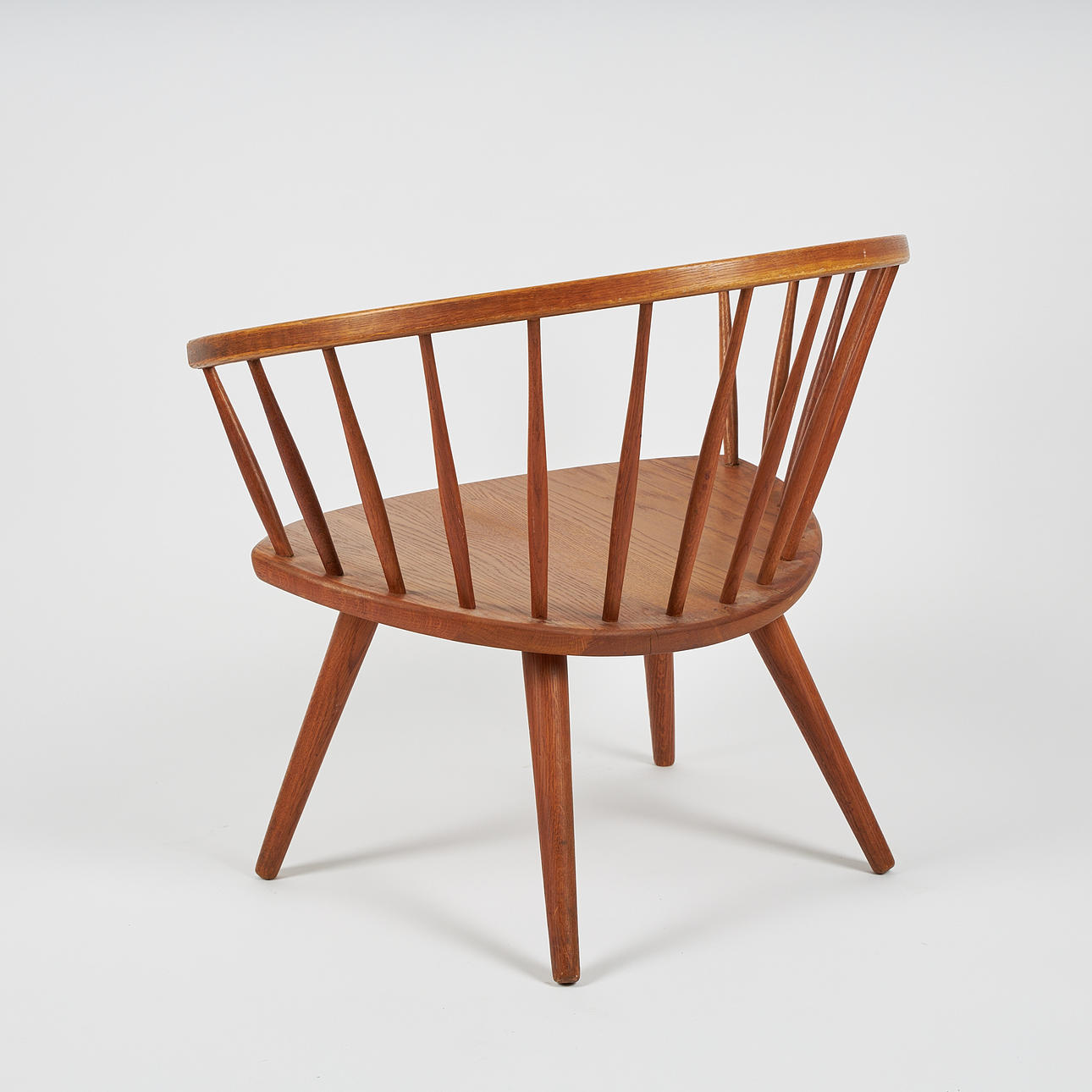 Roble barnizado. Altura 66 cm. ancho 71,5, profundidad 55 cm, altura del asiento 35 cm.