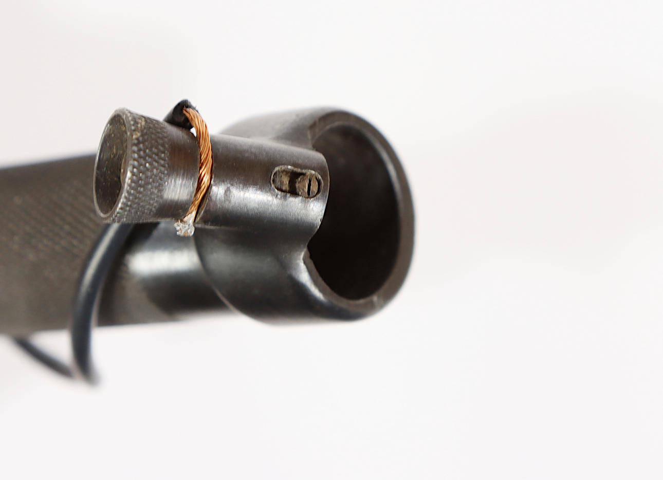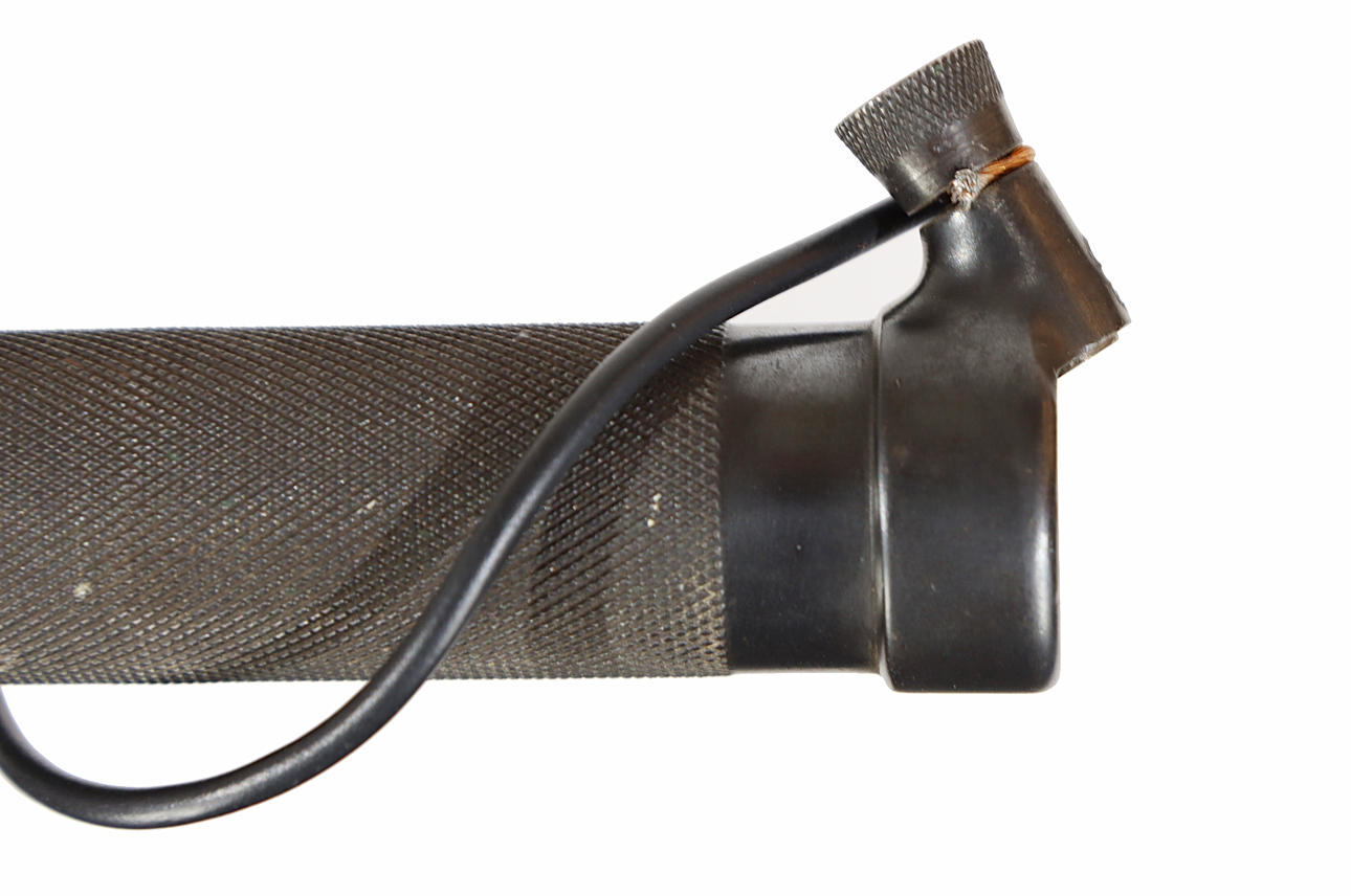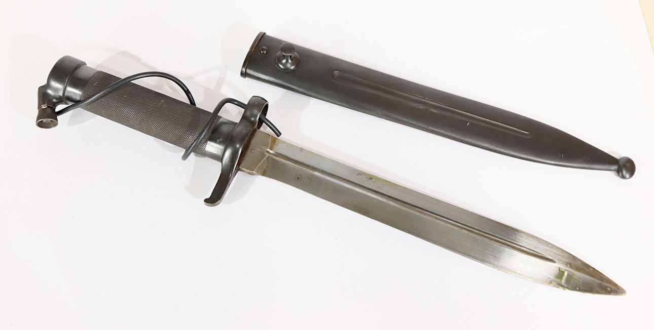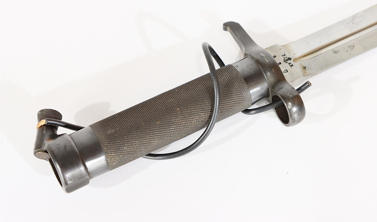 EJ AB, tina correctamente numerada, dispositivo para conectar el cable de tierra, cable eléctrico. La longitud total de la bayoneta es de aproximadamente 33 cm, la longitud de la hoja de aproximadamente 21 cm.