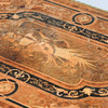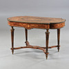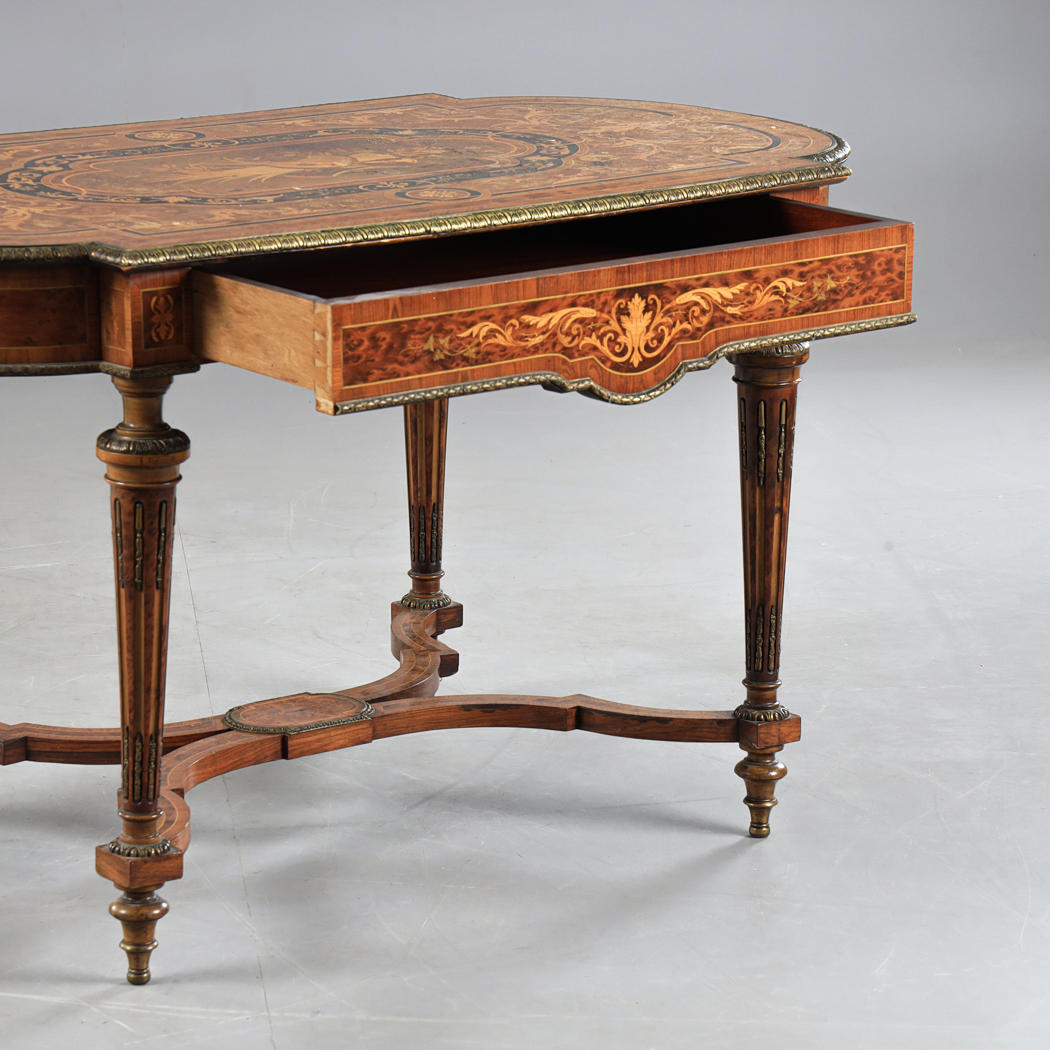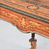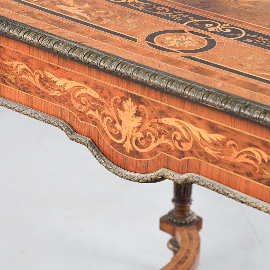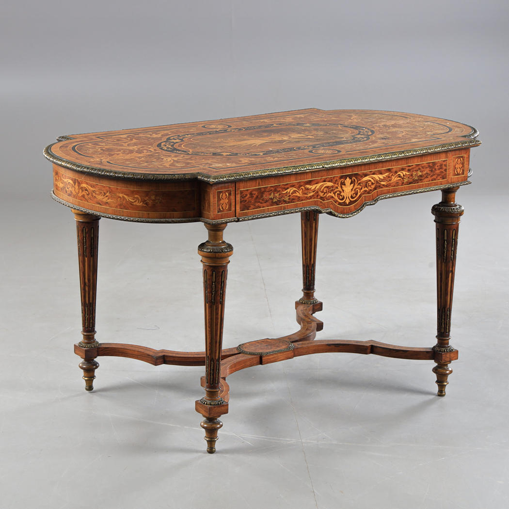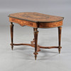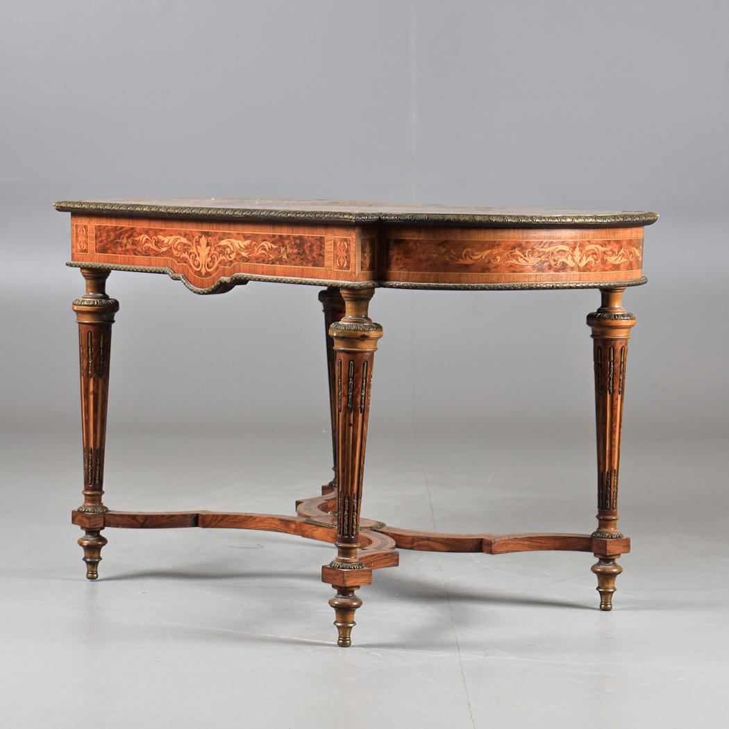 Chapado, incrustaciones, base unida, molduras y pies de metal amarillo, altura aprox.75, 130x74 cm.