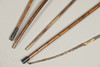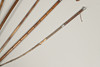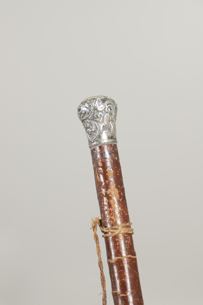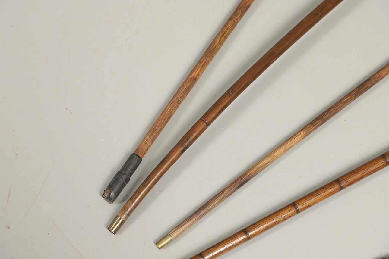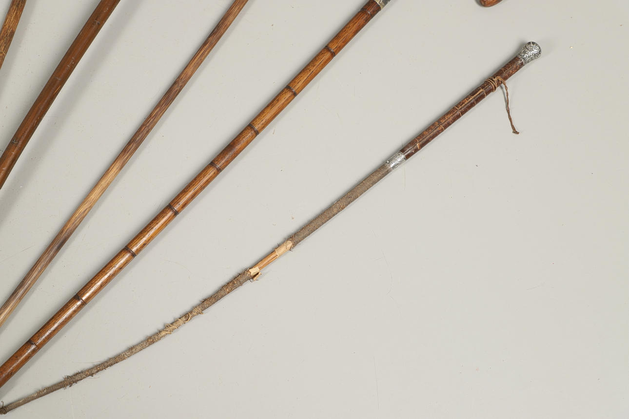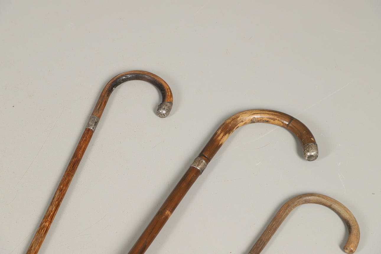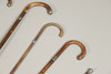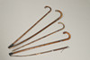 Bastones de madera con parte superior recta y cuatro curvas, con tapas/cuellos de metal plateado/blanco. Algunos contrastados. Todos tamaños similares, el más largo mide 94,5 cm. (5).