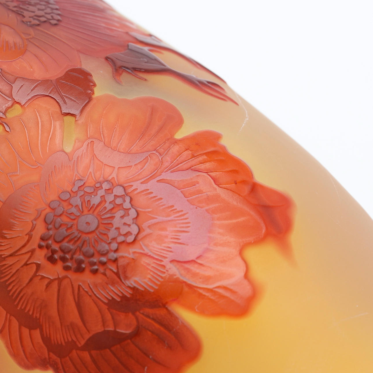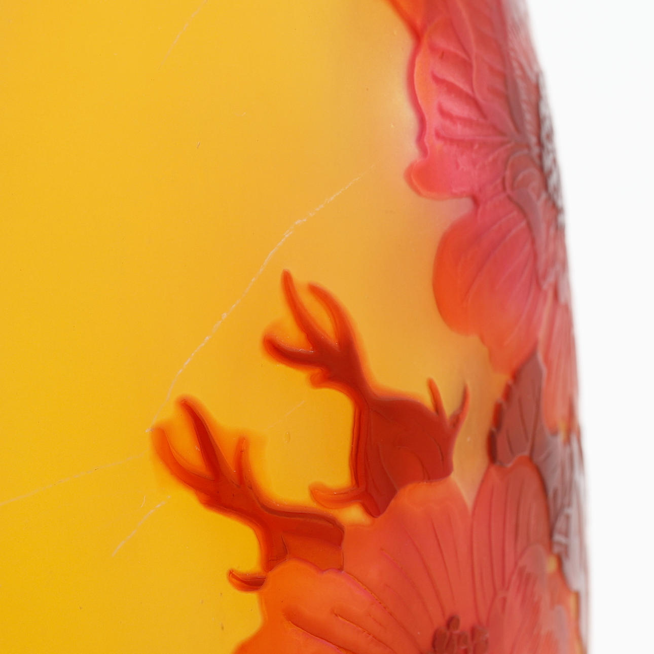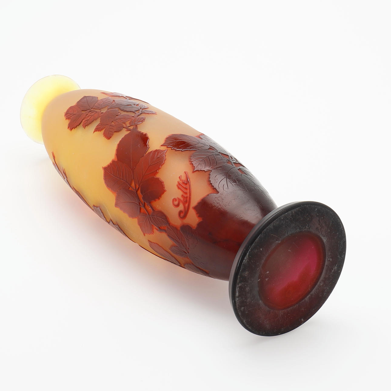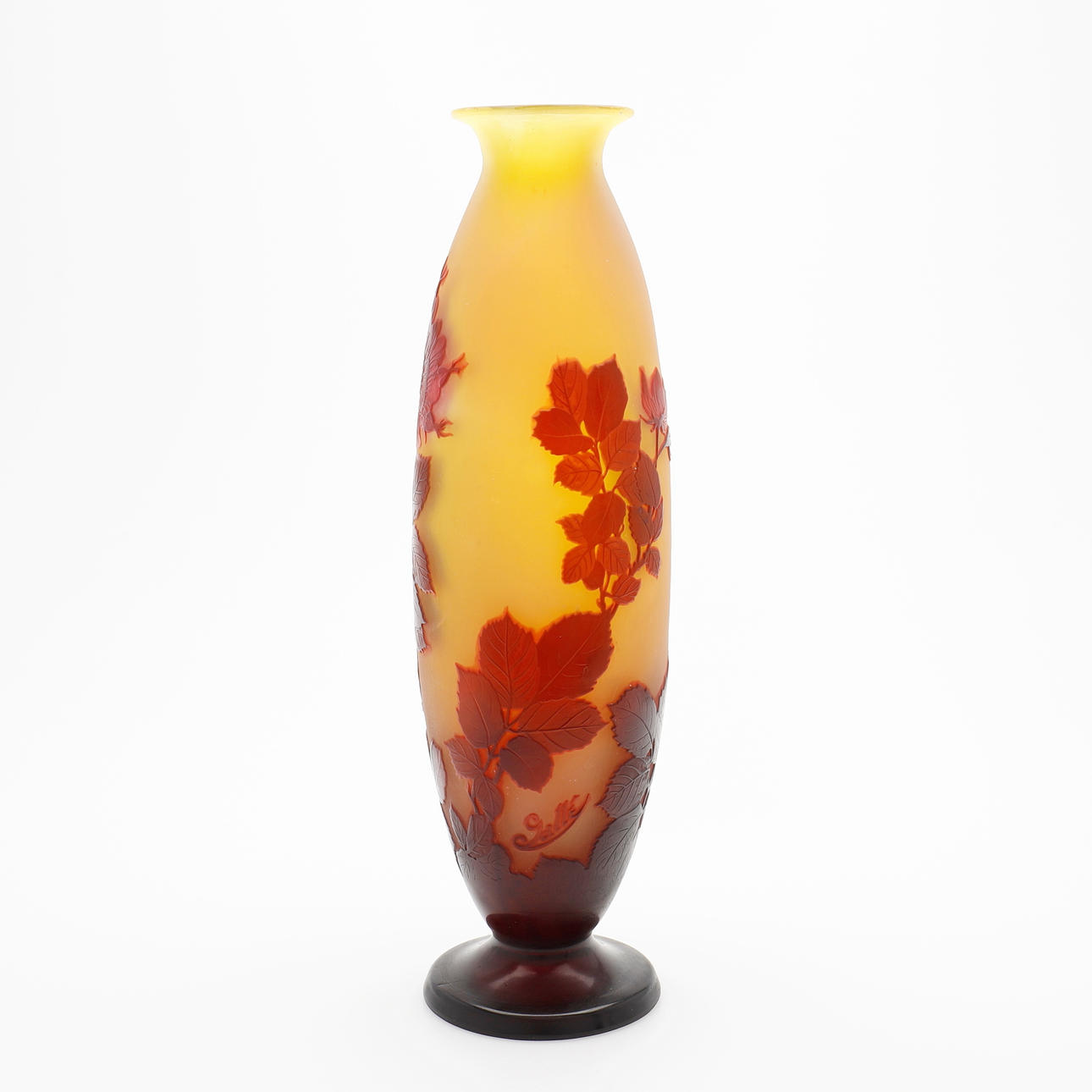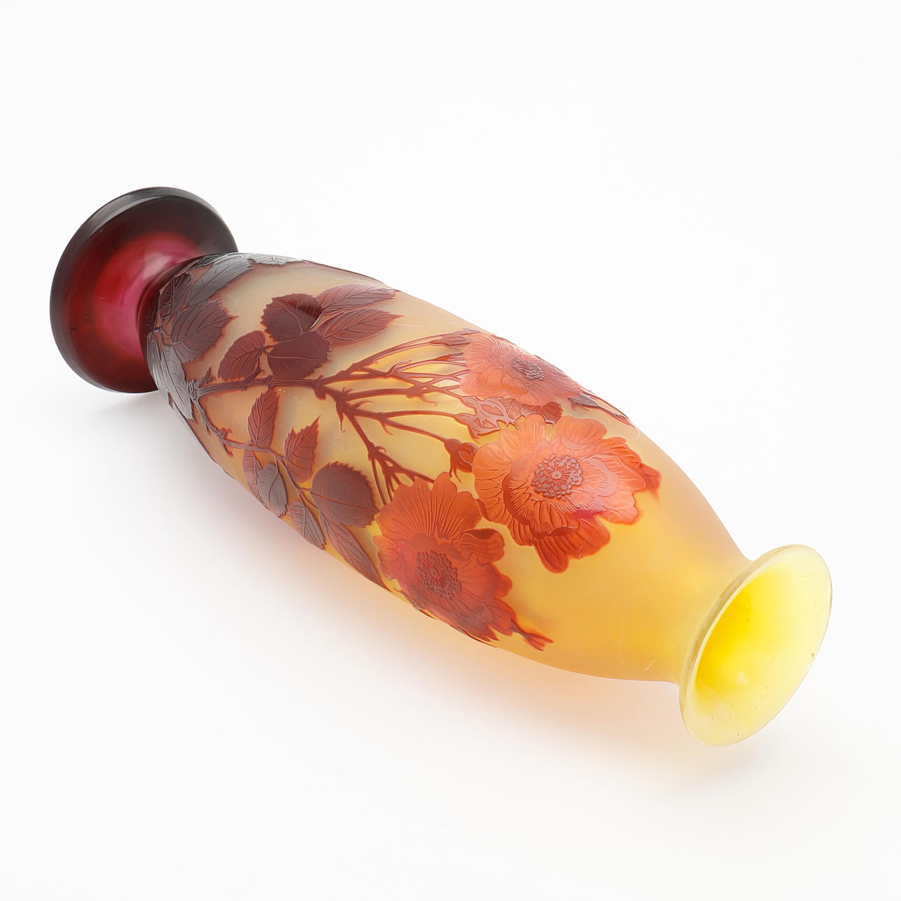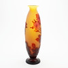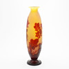 De estilo Art Nouveau, voladizo en rojo y amarillo con decoración grabada que representa rosas, firmado «Gallé», altura 36,5 cm.