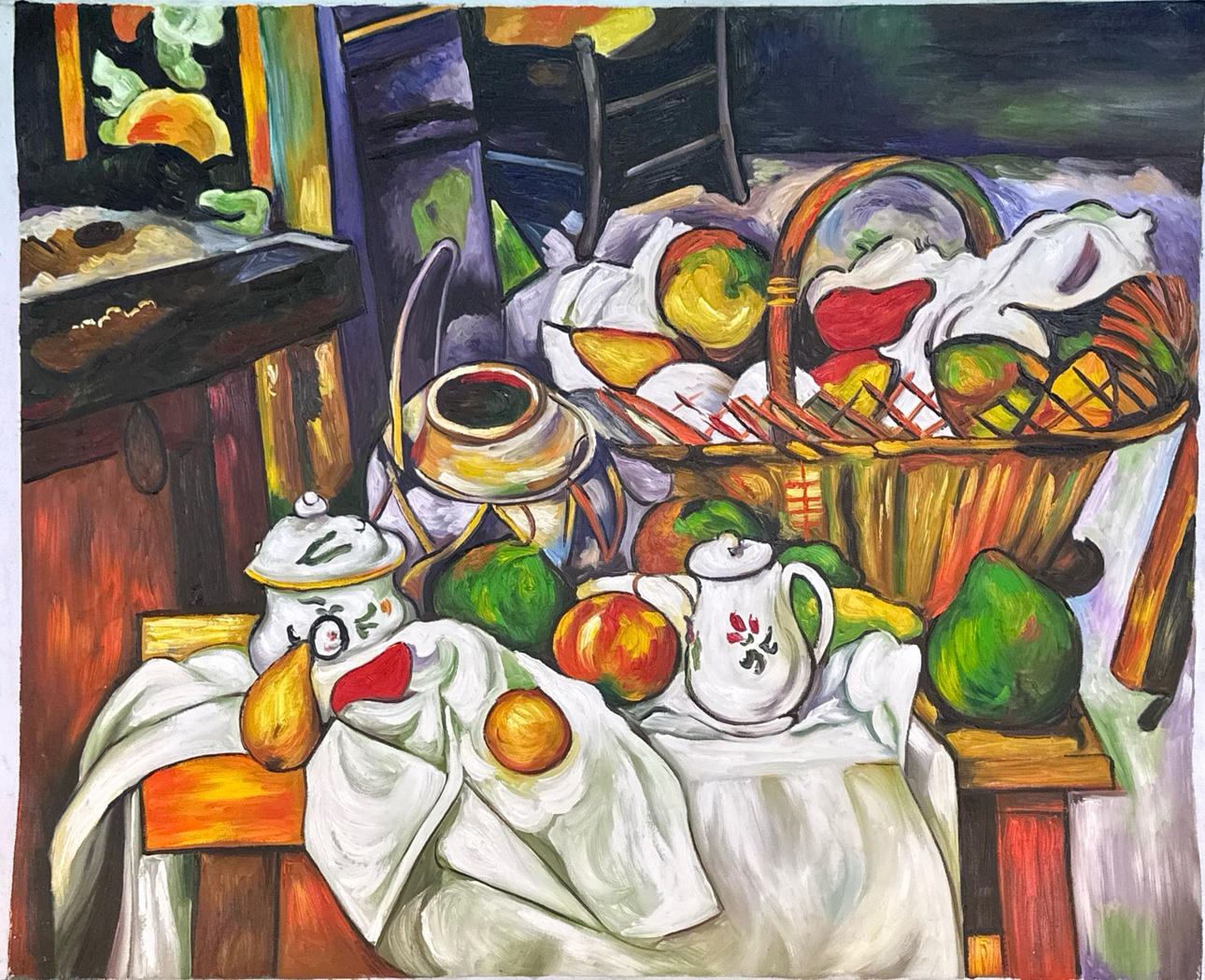 Óleo sobre lienzo sin marco de naturaleza muerta según Paul Cézanne, 87 x 70 cm.