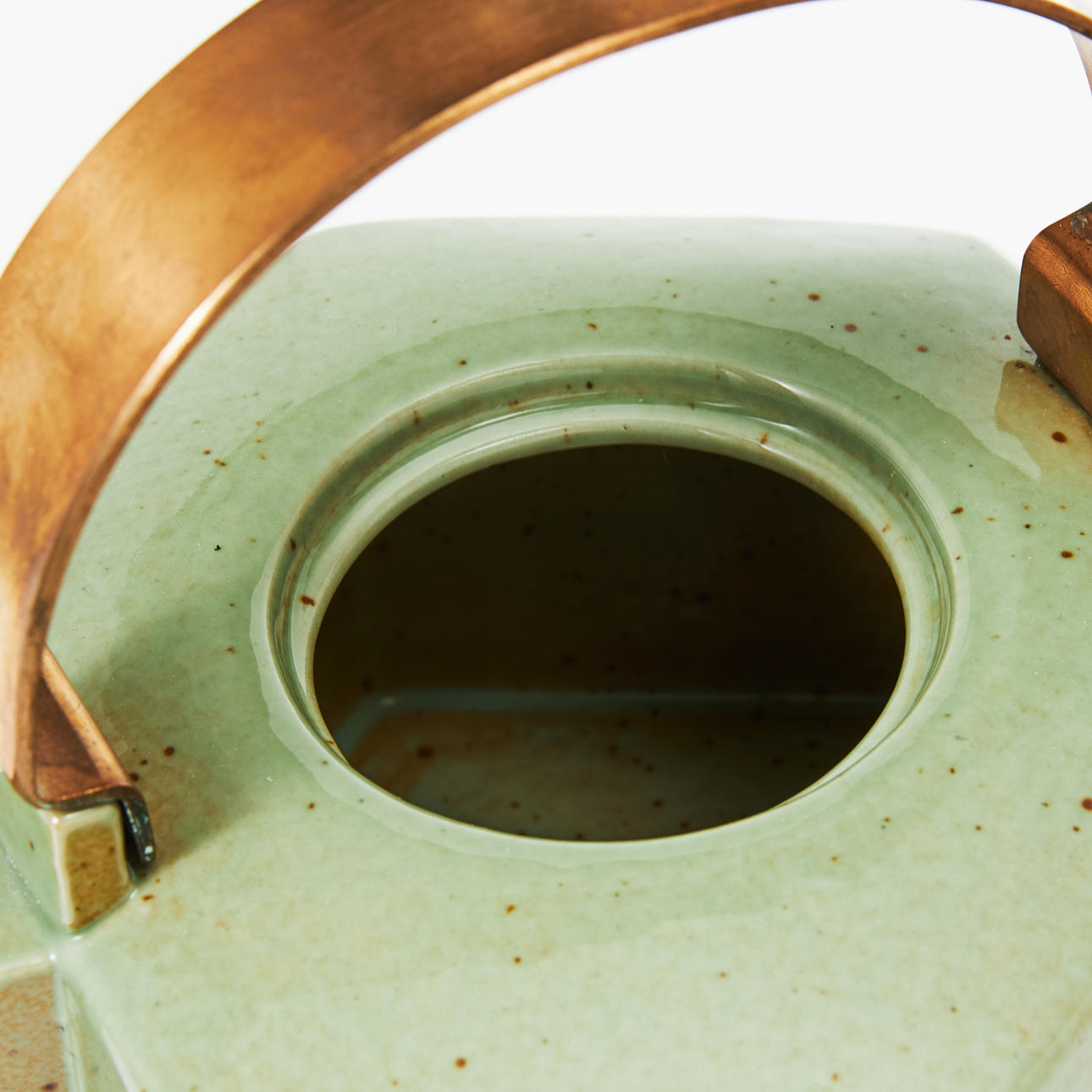 SIGNE PERSSON-MELIN. Una tetera «de seis caras», Rörstrand, gres, años 80, celadón esmaltado, mango de cobre, firmada y numerada Rörstrand Signe Persson-Melin 222.