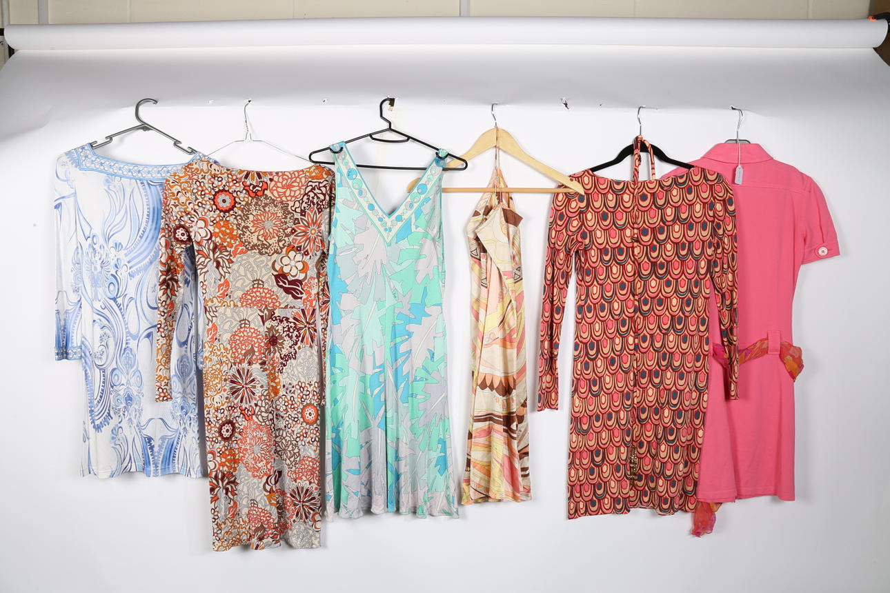 incluye cinco vestidos estampados y un vestido rosa de algodón con cinturón de chifón de seda con estampado de Pucci, tallas 34 a 36.