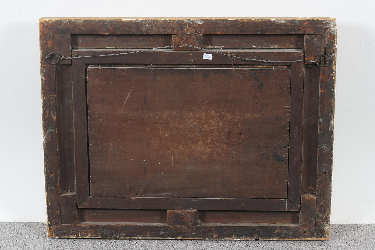 Pintura al óleo sobre Tabla. Siglo 19. Escena con figuras. 30x46, dimensiones exteriores 52x66 cm.
