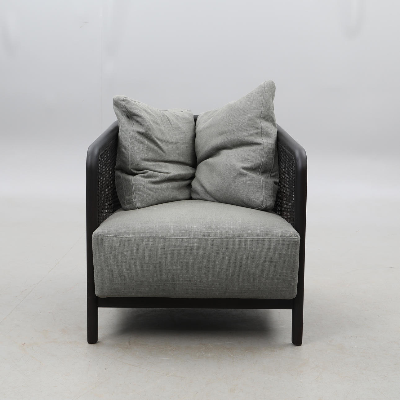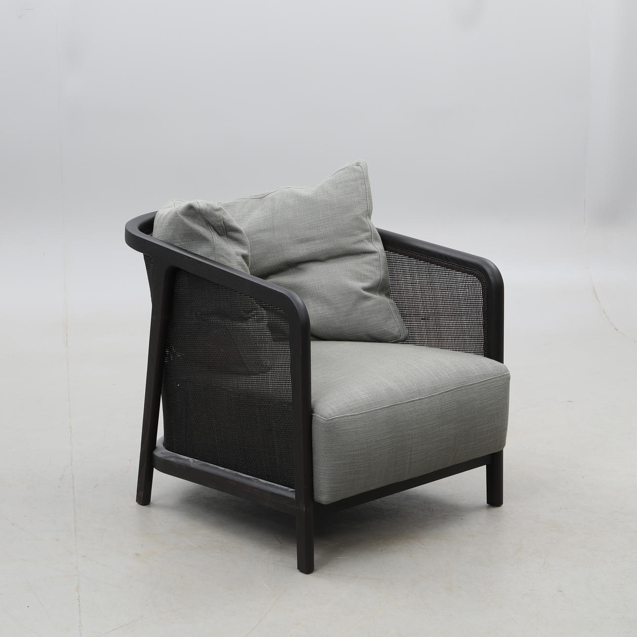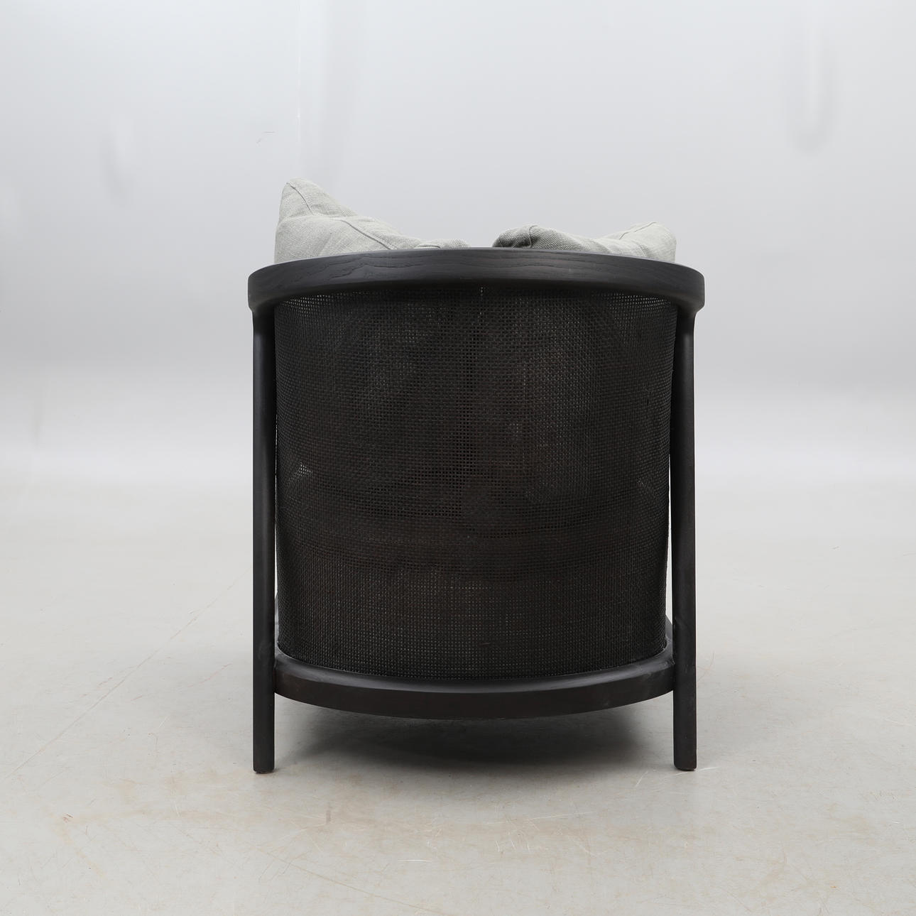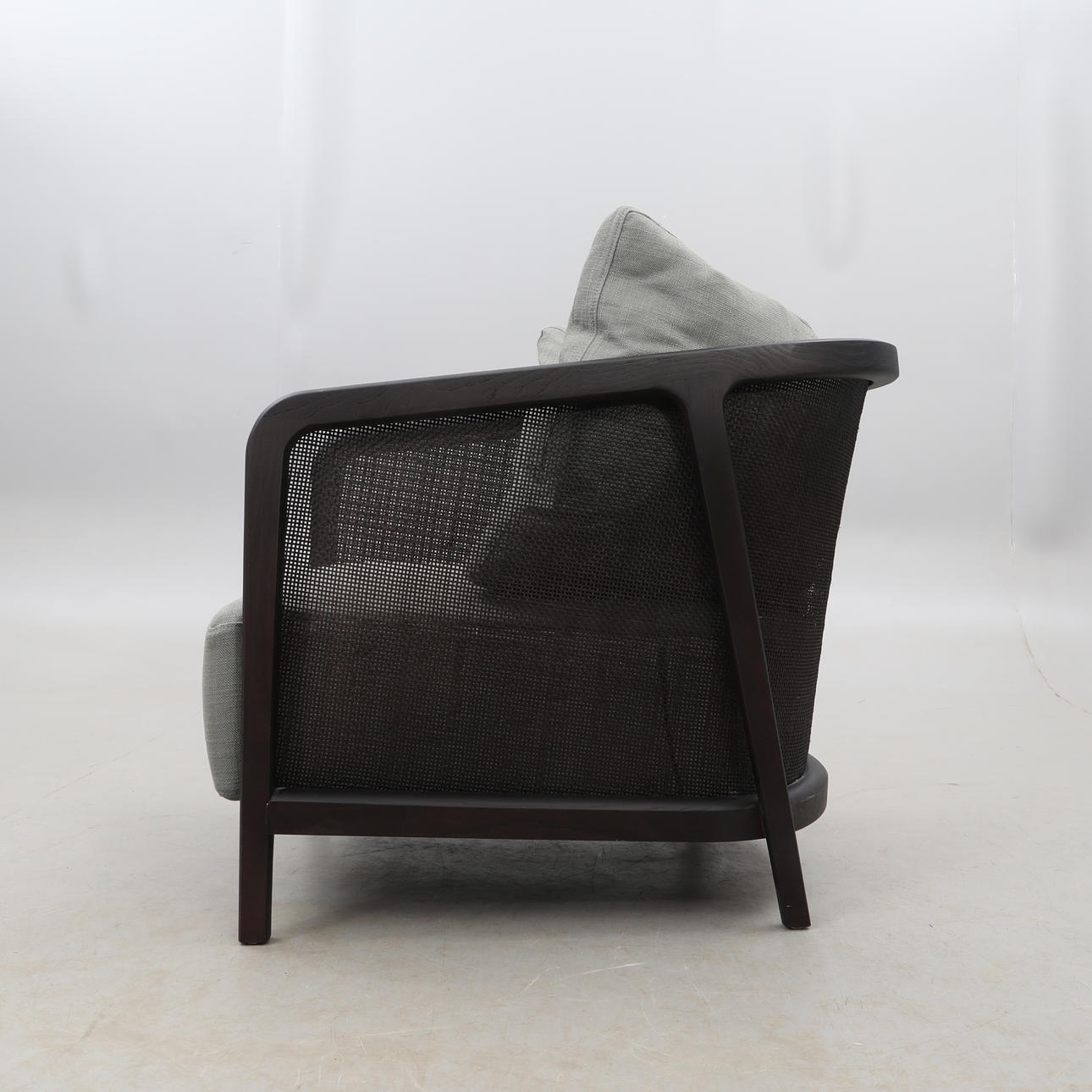 Estructura de madera teñida de negro y ratán, tapicería textil gris.