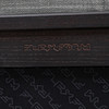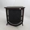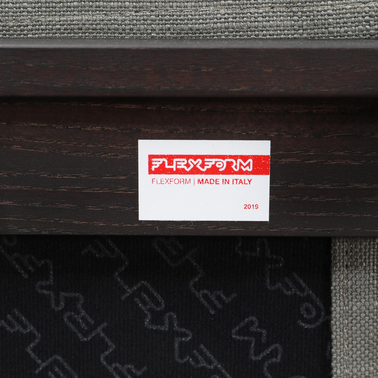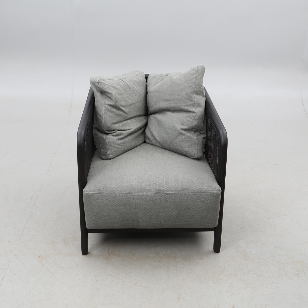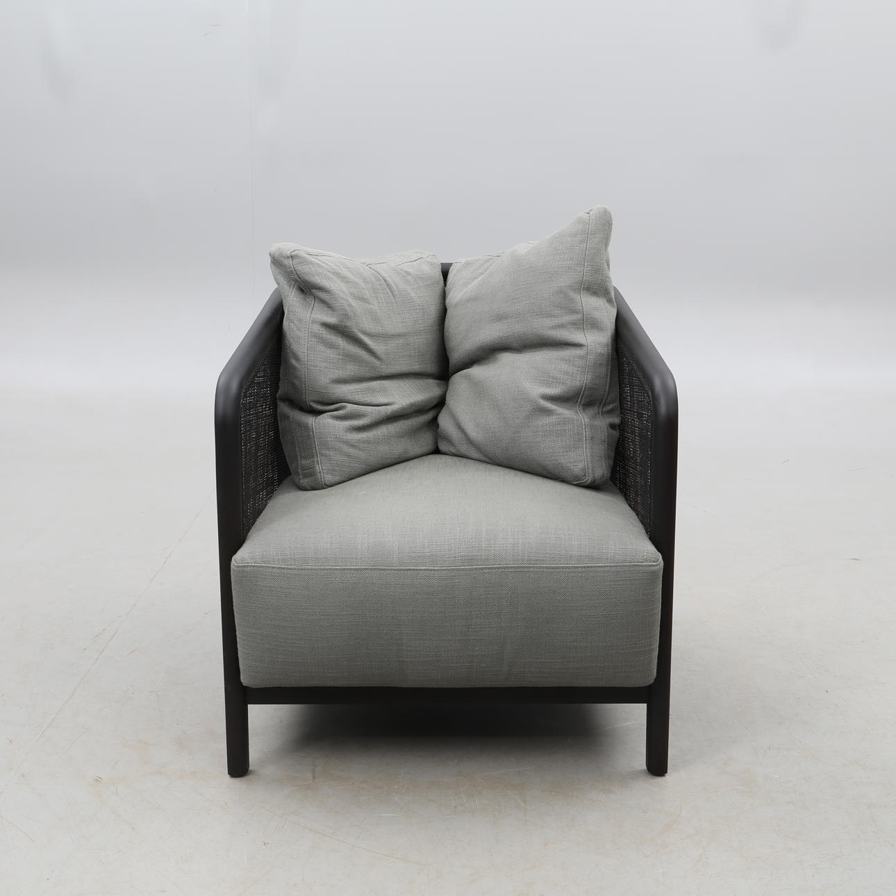 Estructura de madera teñida de negro y ratán, tapicería textil gris.