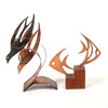Pescado en tazas sobre zócalo de madera, así como pájaros en tazas. Altura aprox. 23 y 30 cm.