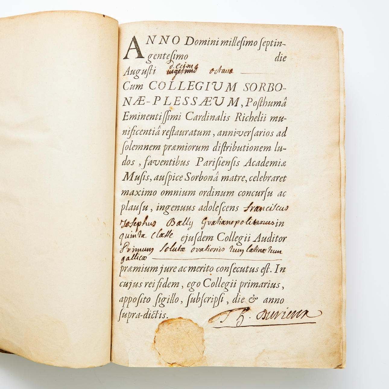 bisagra frontal, papeles posteriores en los extremos. Zorro y manchado por todas partes. Mancha densa en las primeras 25 páginas y en la segunda parte, ll. a1-a5 met papier reparatie in marginen en a1-a2 met hoek met lossen van tekst, leefel nn6 met een minor-hole met lossen van letterer, inkbletten, heeft op ll. aaa3-aaa3 y bbb4, anotaciones marginales en las págs. 213-219 en la parte tres. Al principio se encuadernan más hojas impresas de primera calidad del «Collegium Sorbonae-Plessaeum», de primera calidad para Franciscus Joephus Bailly de Gronoble y con rastros de sello. «Je Baillys» escrito en la primera portada. Boka